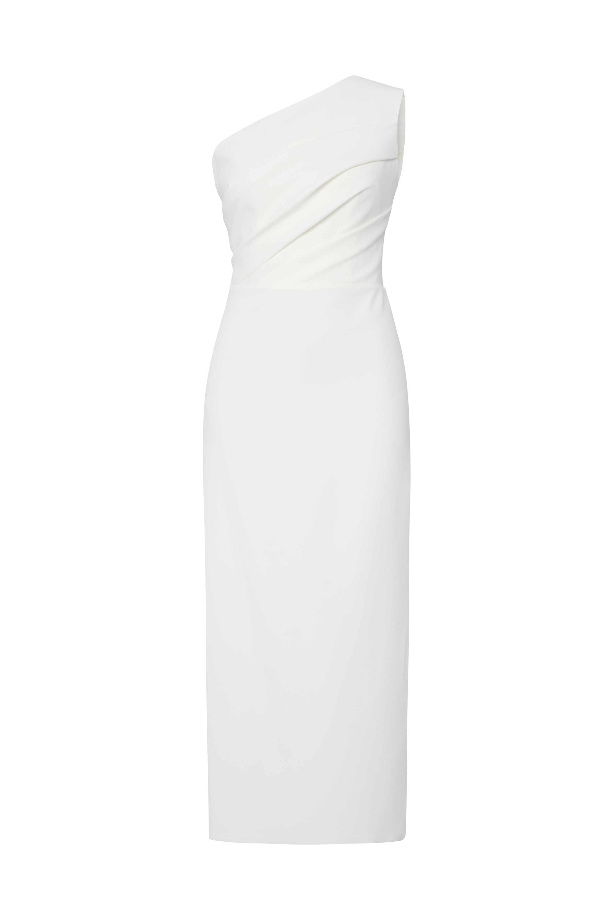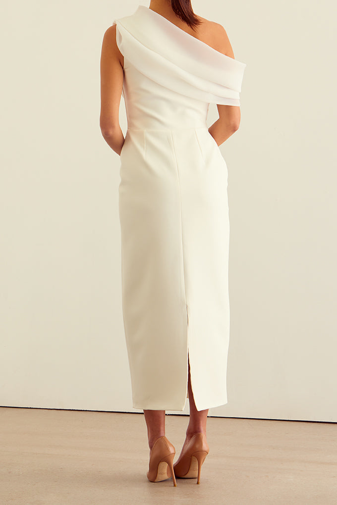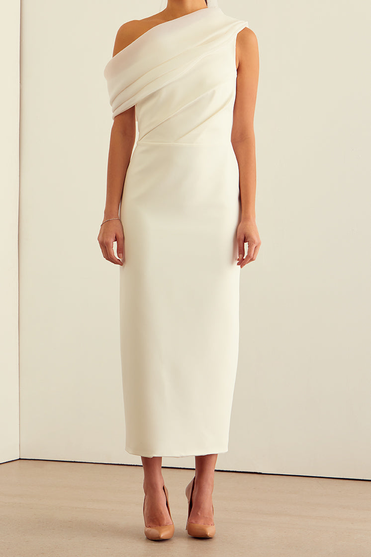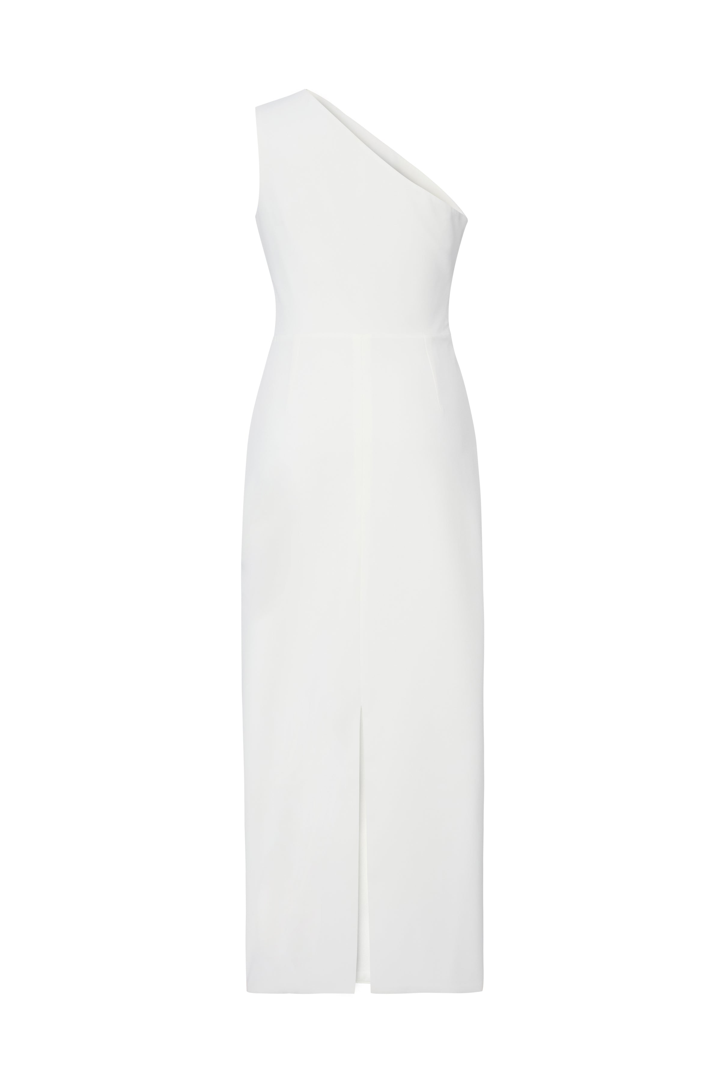 A crisp removable organza detail on the shoulder of this statuesque column dress flows into a modern neckline.