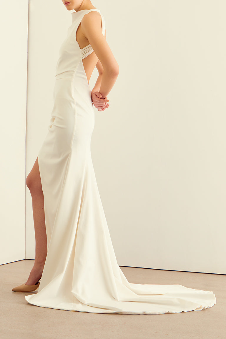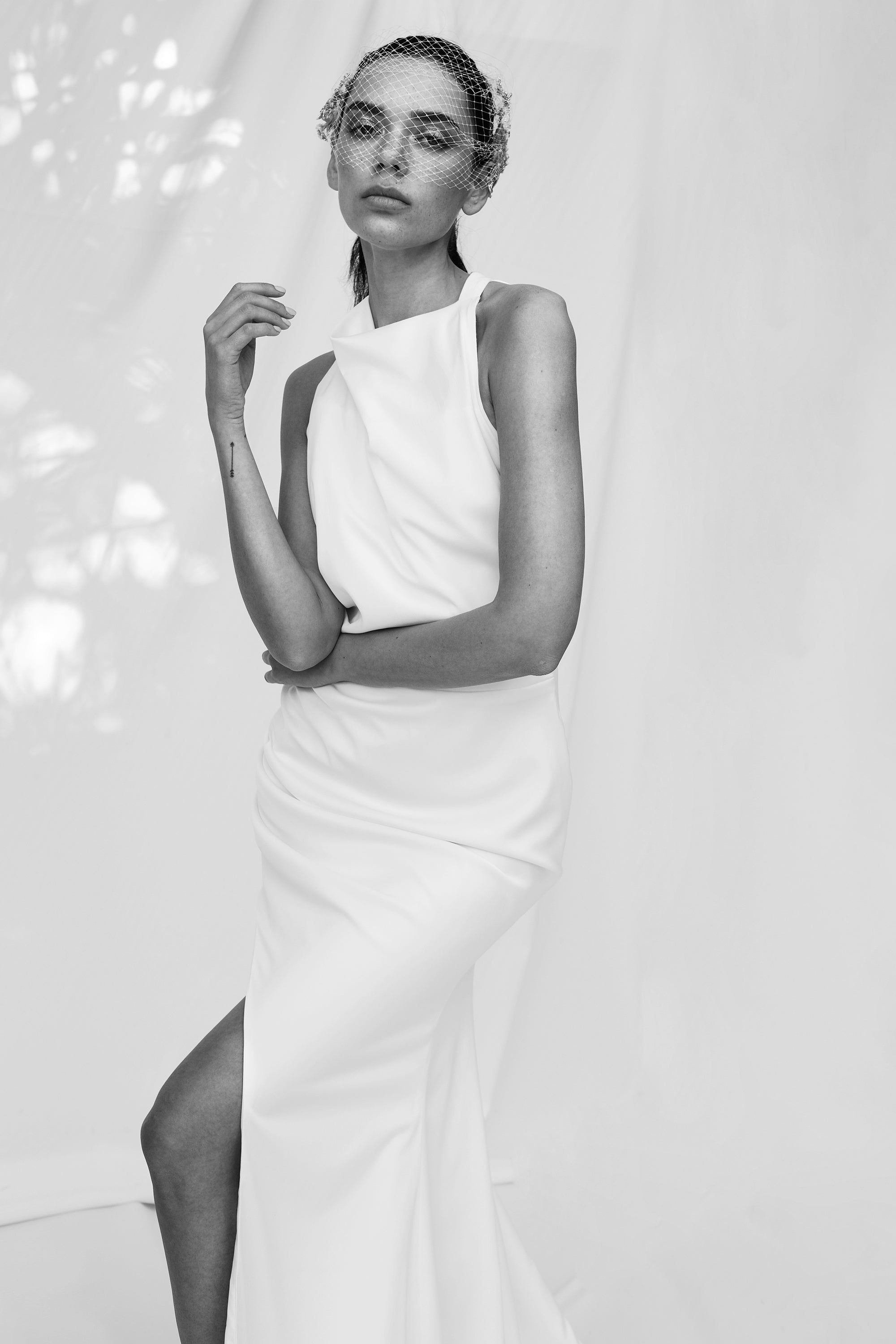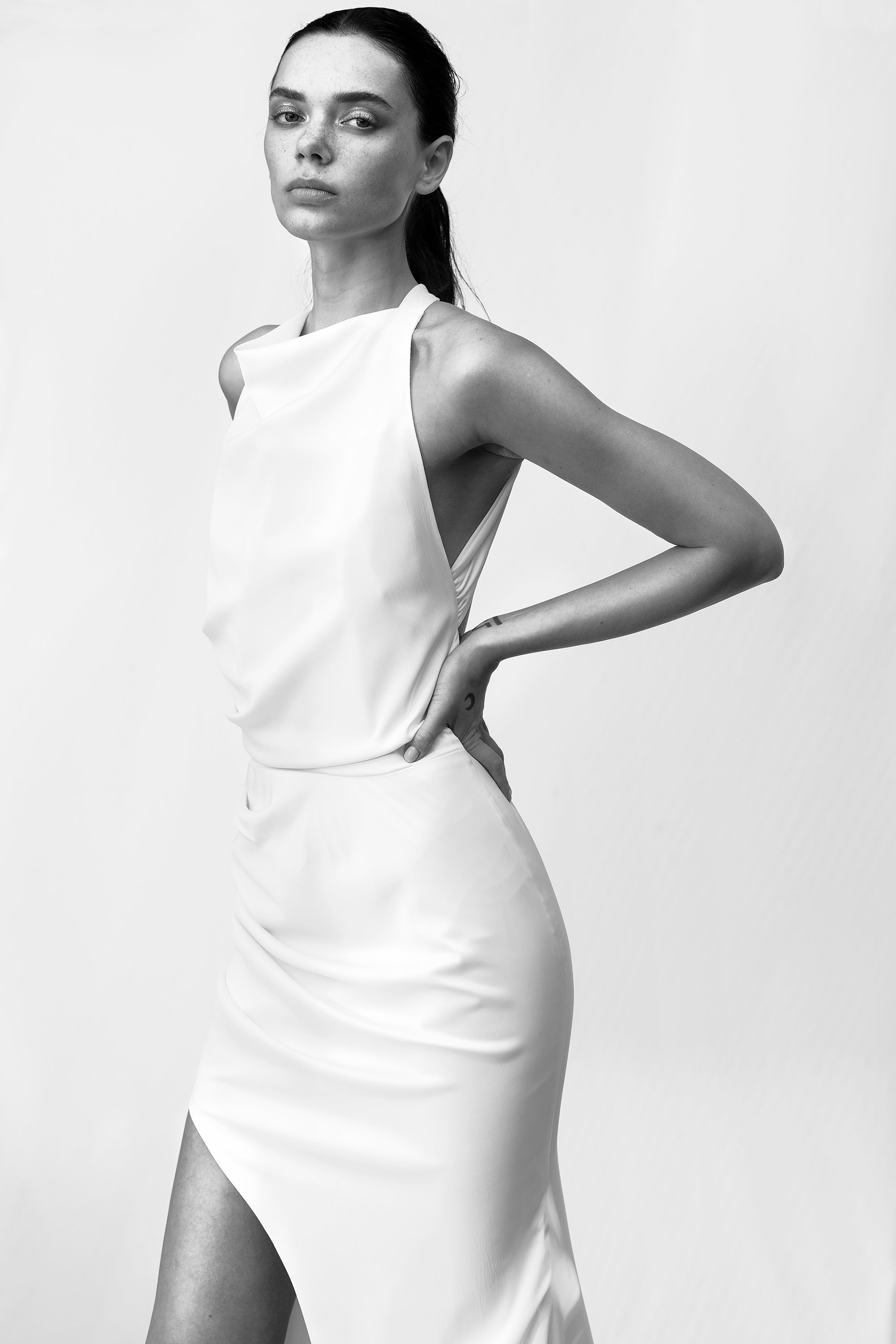 This modern halter-style neckline gown in matte satin highlighted by a unique draping twist detail and high front slit features a minimal yet chic aesthetic that feels timeless and undoubtedly fashion-forward.