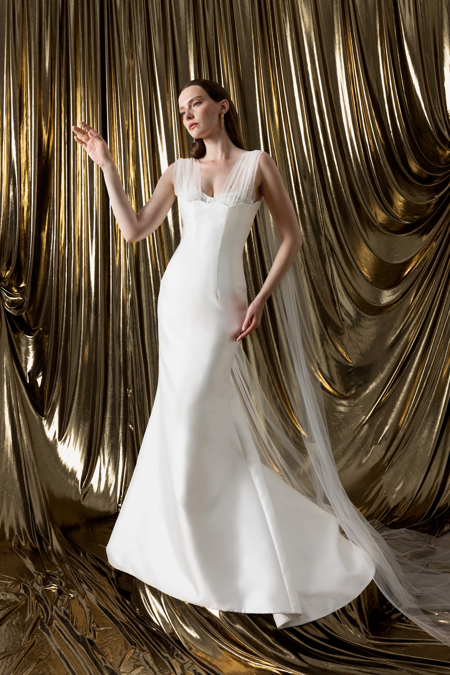 The VIRYA gown is crafted from luxurious mikado fabric with a corseted structure.