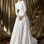 The DARSHI gown combines a velvet bodice with a taffeta skirt, exuding a blend of luxury and elegance. Handmade glass embellishments adorn the neck, sleeve edges, and belt,