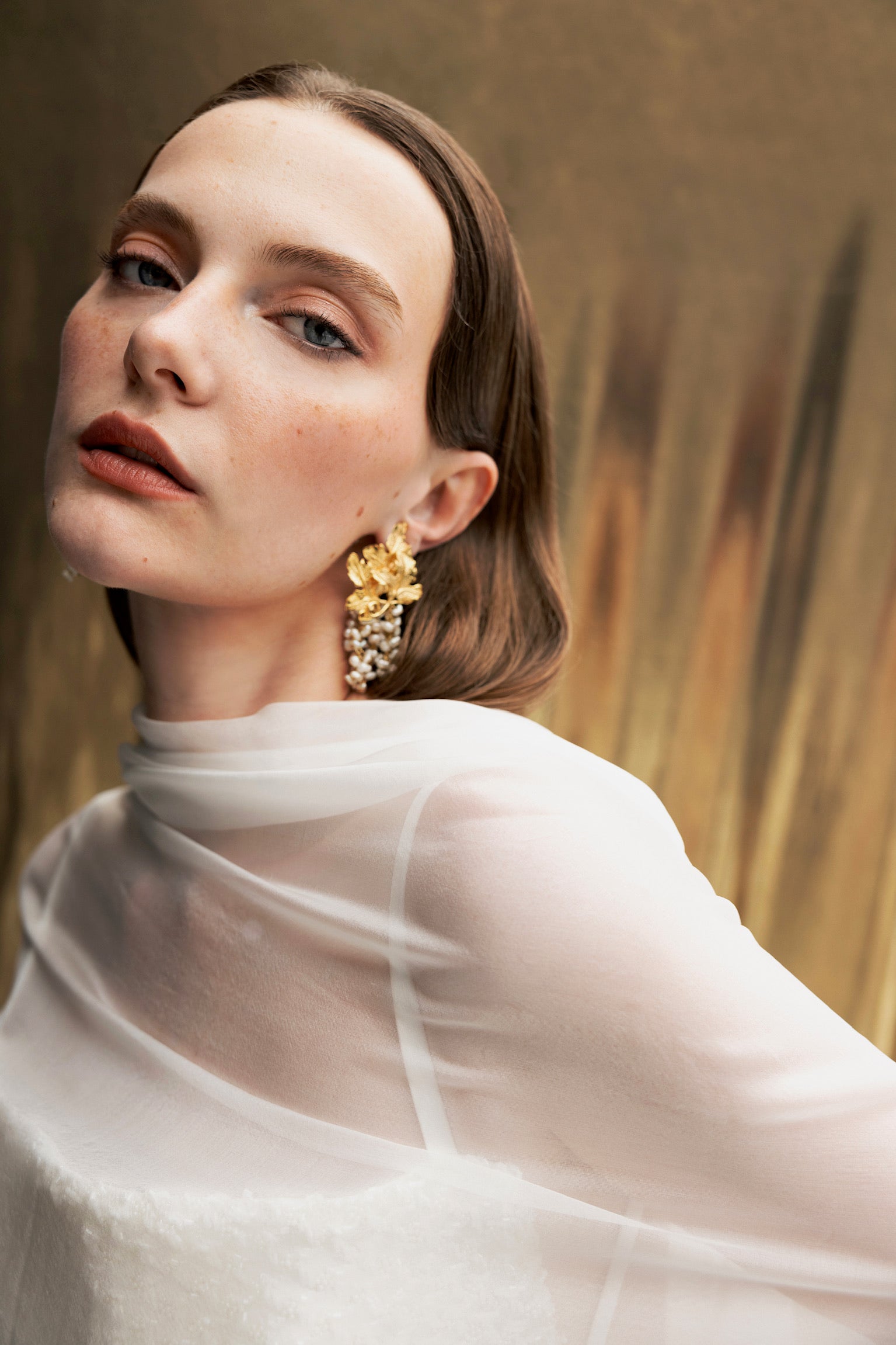 Its bodice, crafted from silk chiffon, reveals a delicately hand-embroidered bustier with cut glass beads, creating a subtle shimmer through the airy fabric, while the cape-like detail in the back adds a touch of ethereal grace.