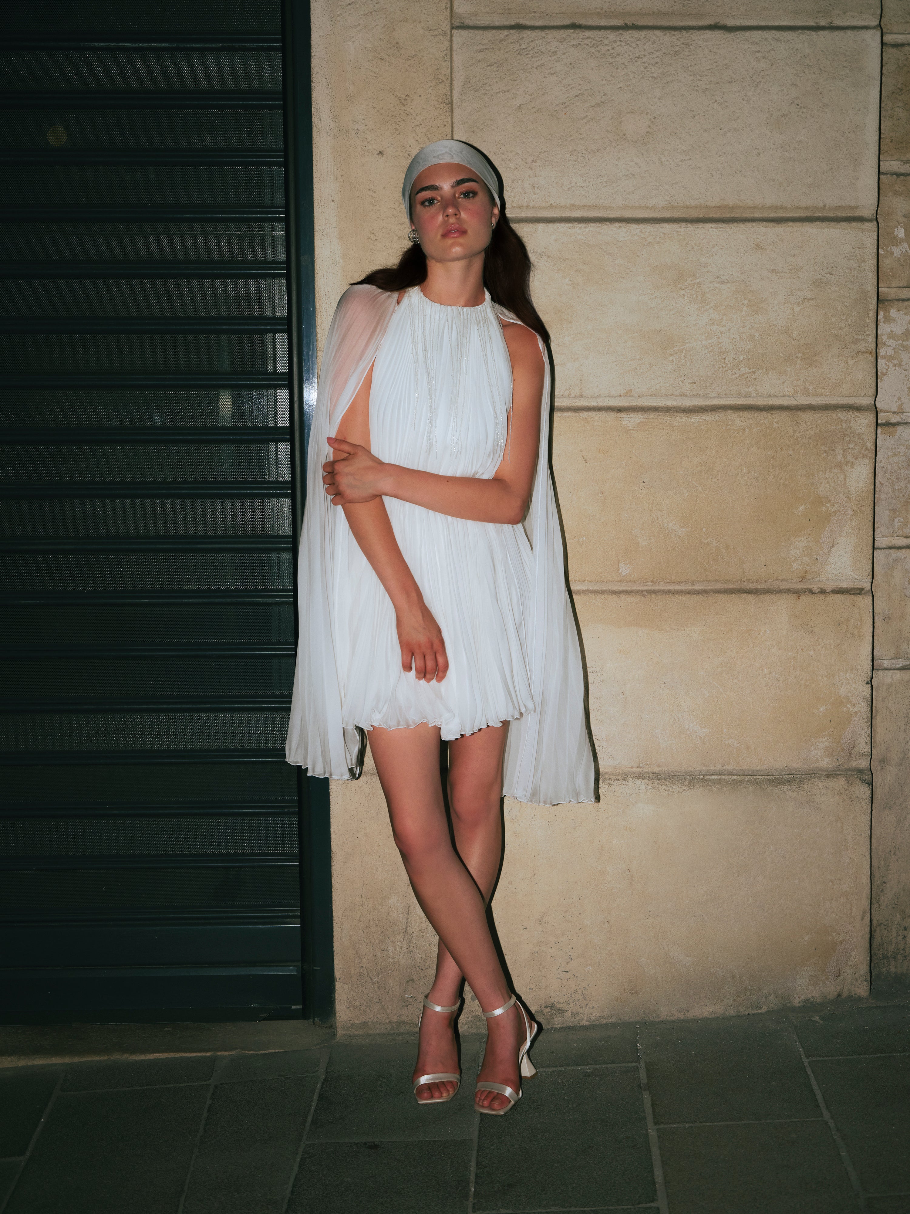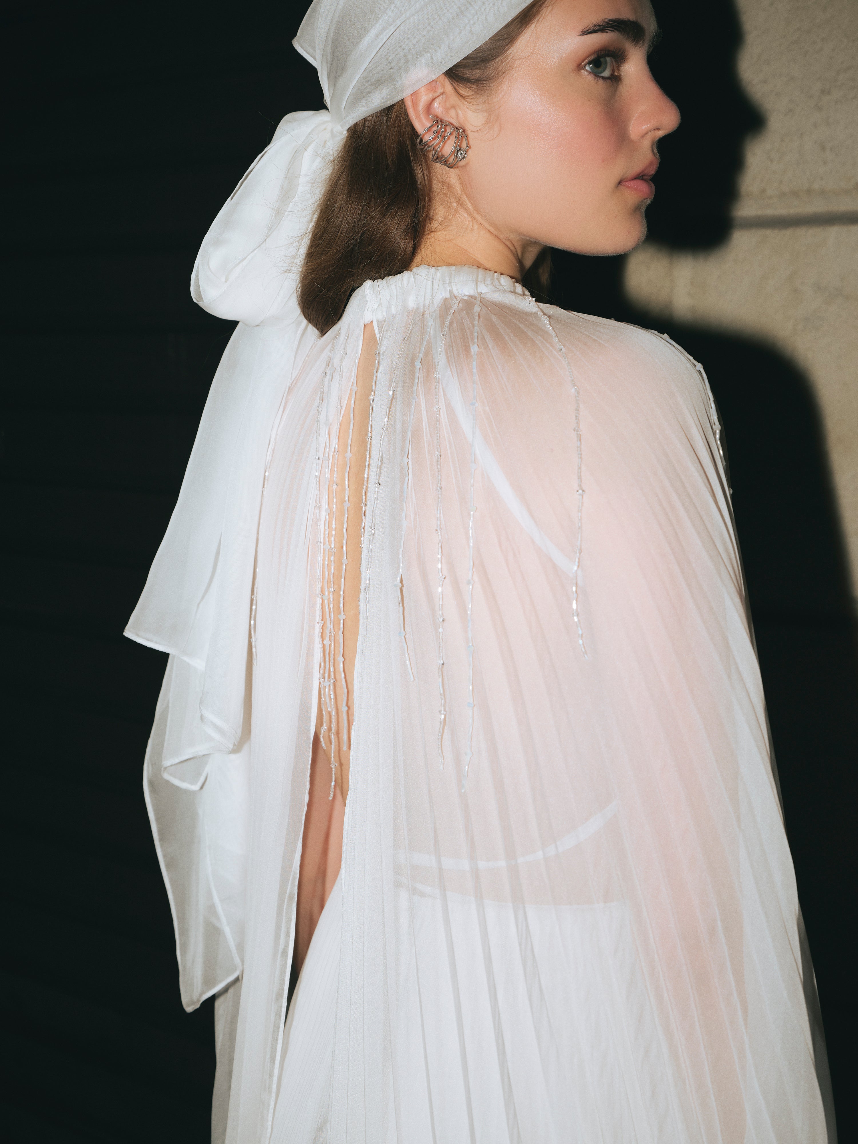 - Pleated chiffon cape silhouette