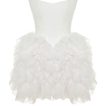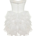 The Bellone Dress captures exuberance and romance in sculptural form. Featuring a corseted bodice and layers upon layers of hand-shaped organza ruffles, it creates a voluminous mini silhouette with couture attitude.