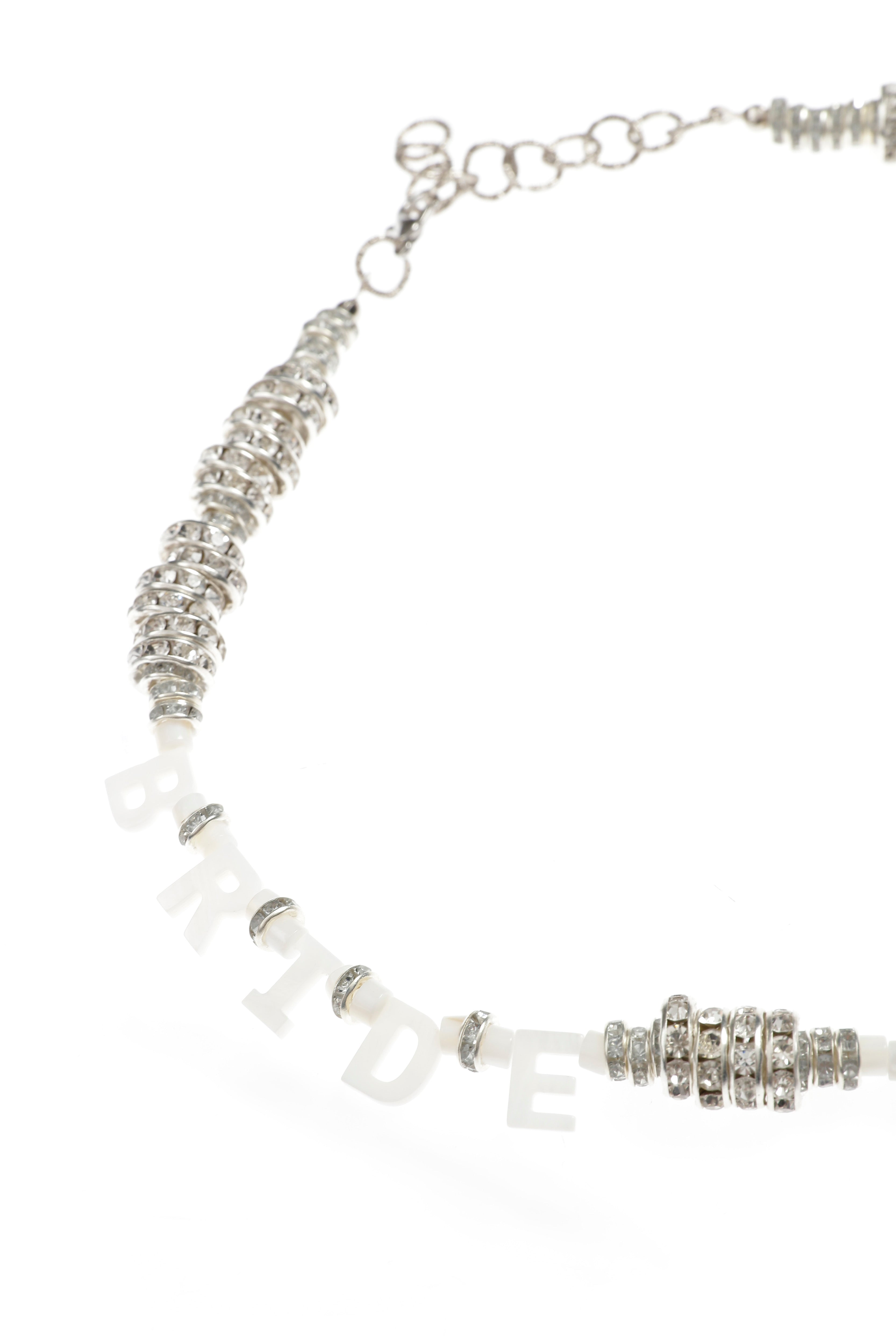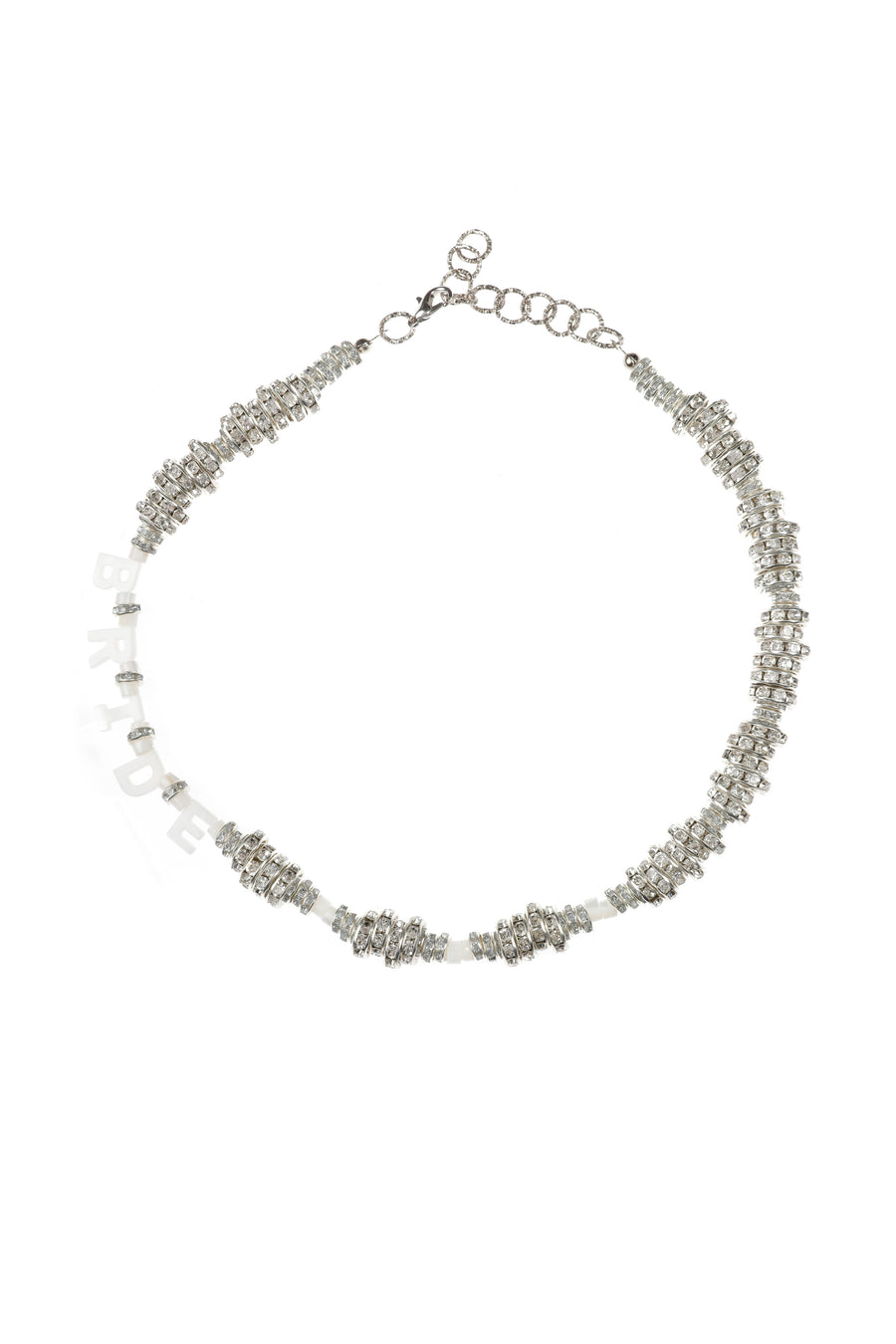 The "HoneyMood" collection necklace is a beautifully curated piece for the new bride to adorn on her honeymoon. Meticulously crafted with metal rhinestones that glint with a romantic sparkle and embellished with alphabet pearls that add a personalized touch, this necklace blends timeless elegance with a hint of playful charm. Perfect for those candlelit dinners or leisurely beach walks, it's a celebration of love and new beginnings. Whether paired with a sundress or an evening gown, this necklace from the "HoneyMood" collection promises to keep the wedding bliss glowing.