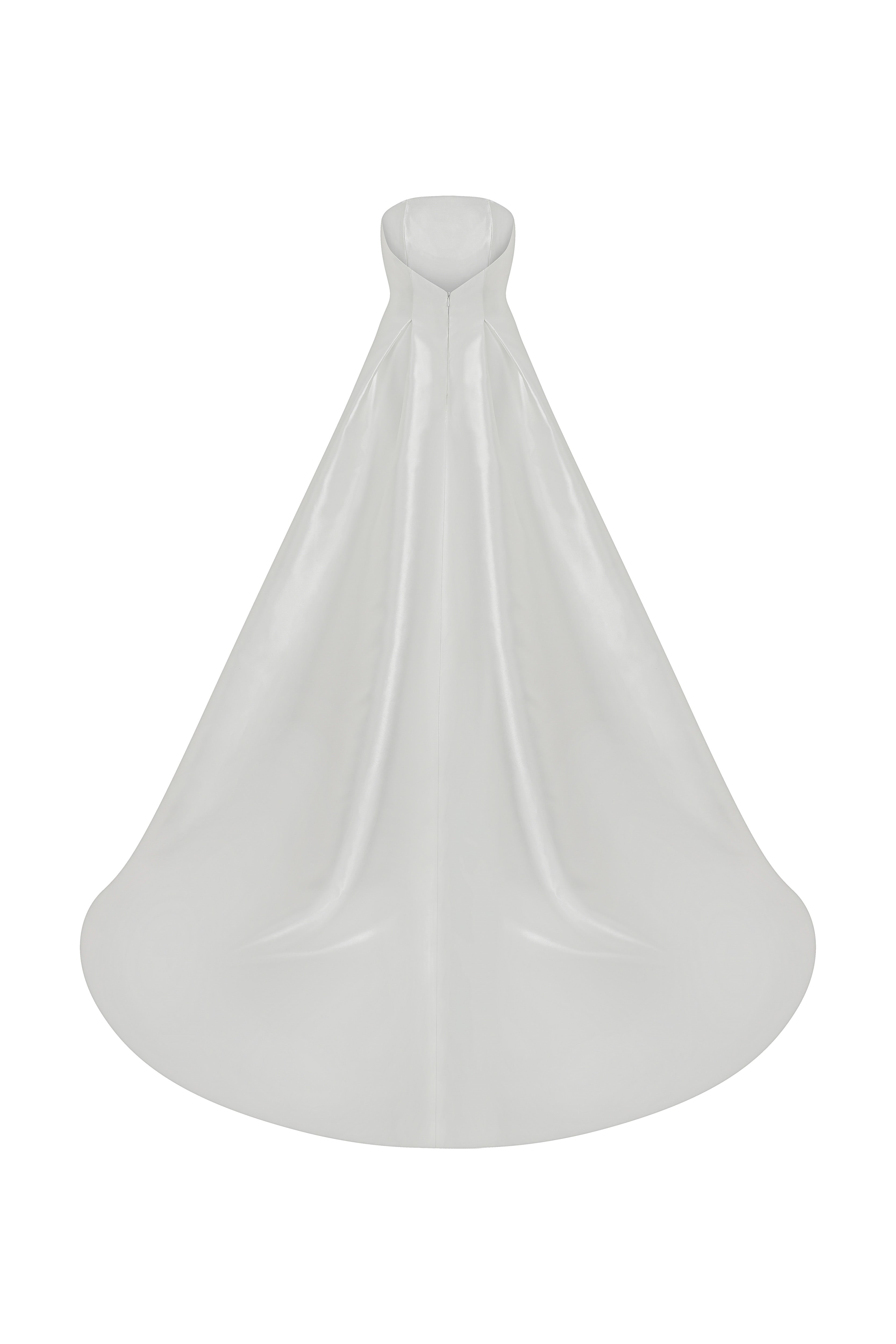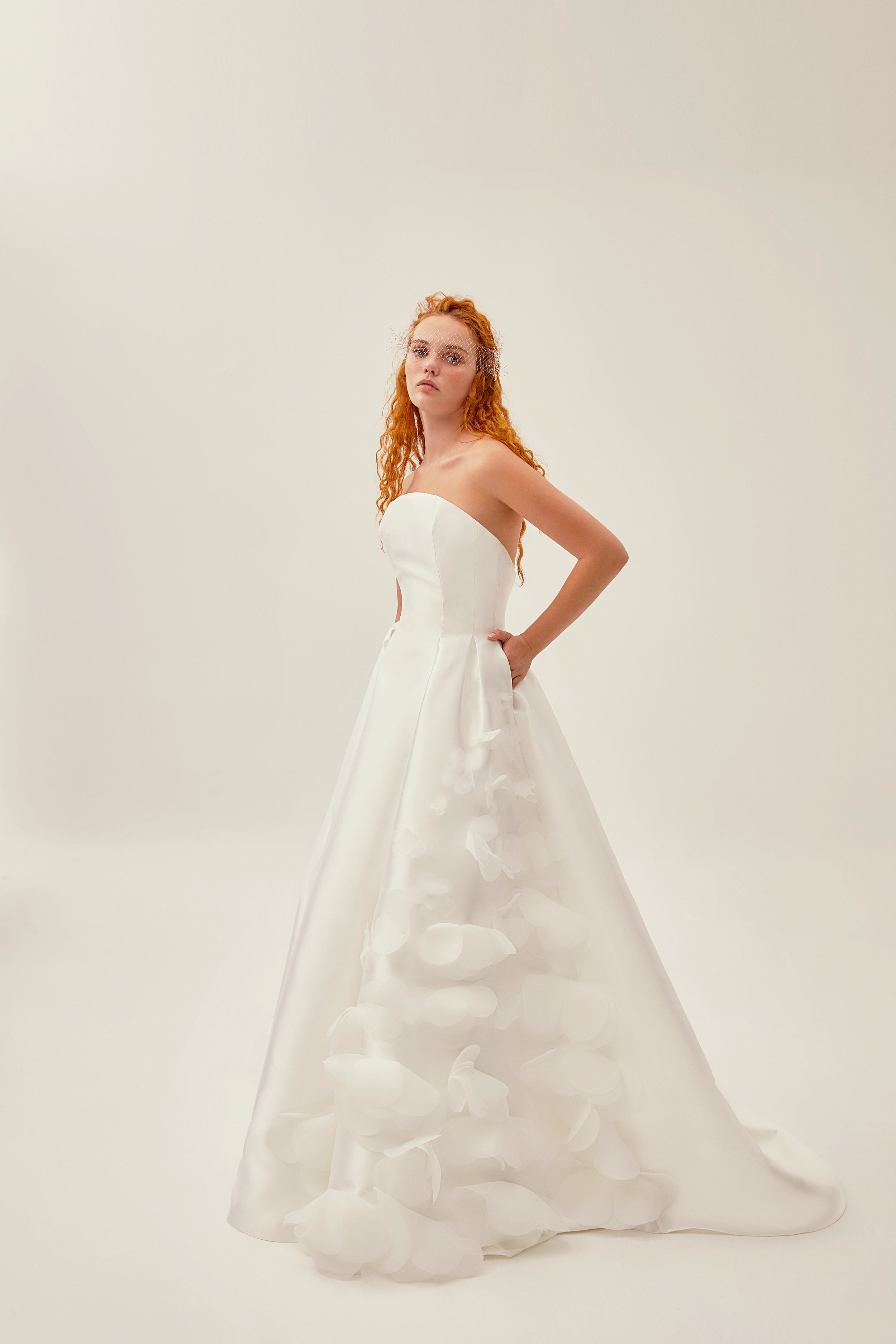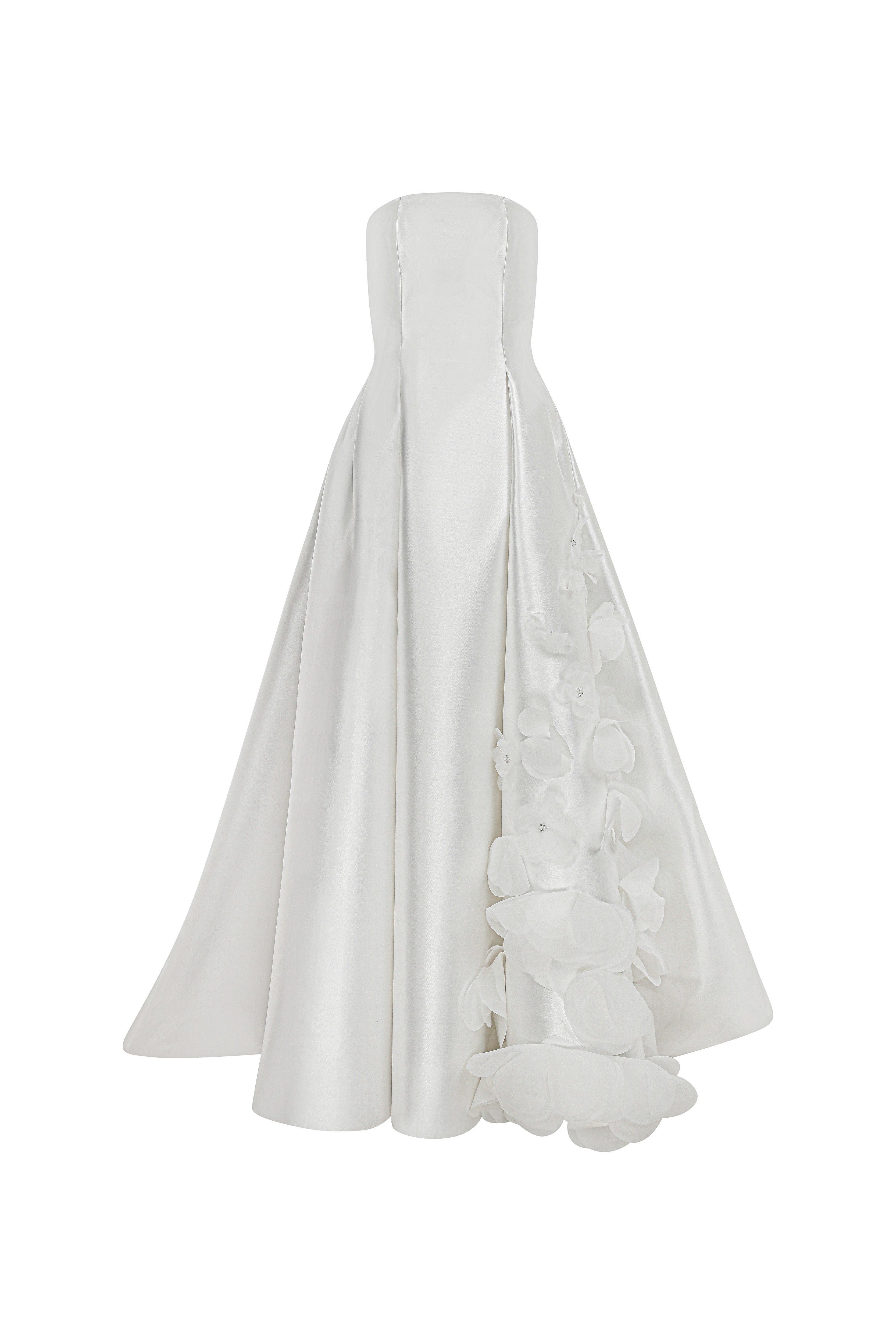 Cleodora is made of luxury mikado fabric and the organza flowers comes along with it. The curvy strapless top and the hidden pockets have everything to emphatize your femininity.