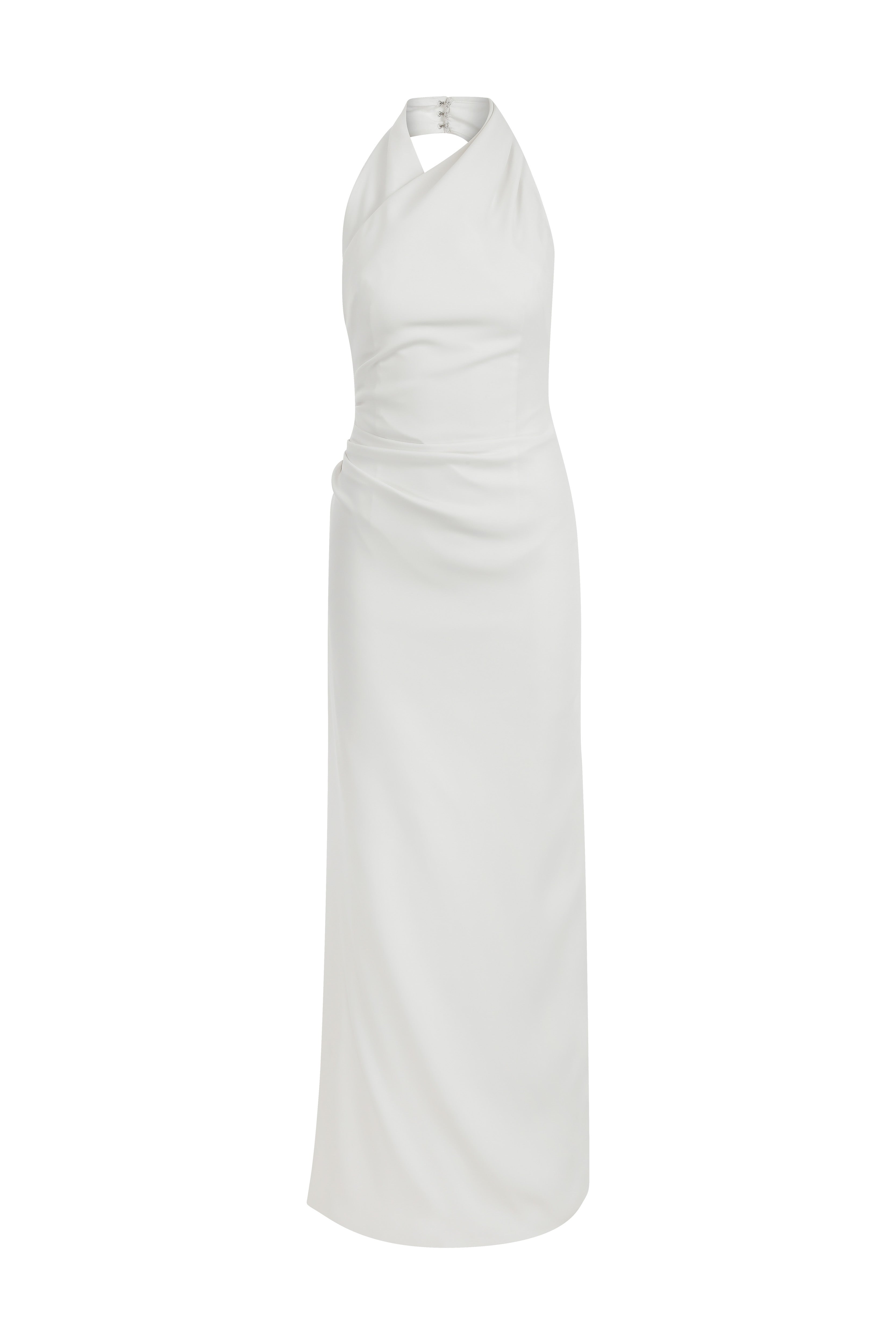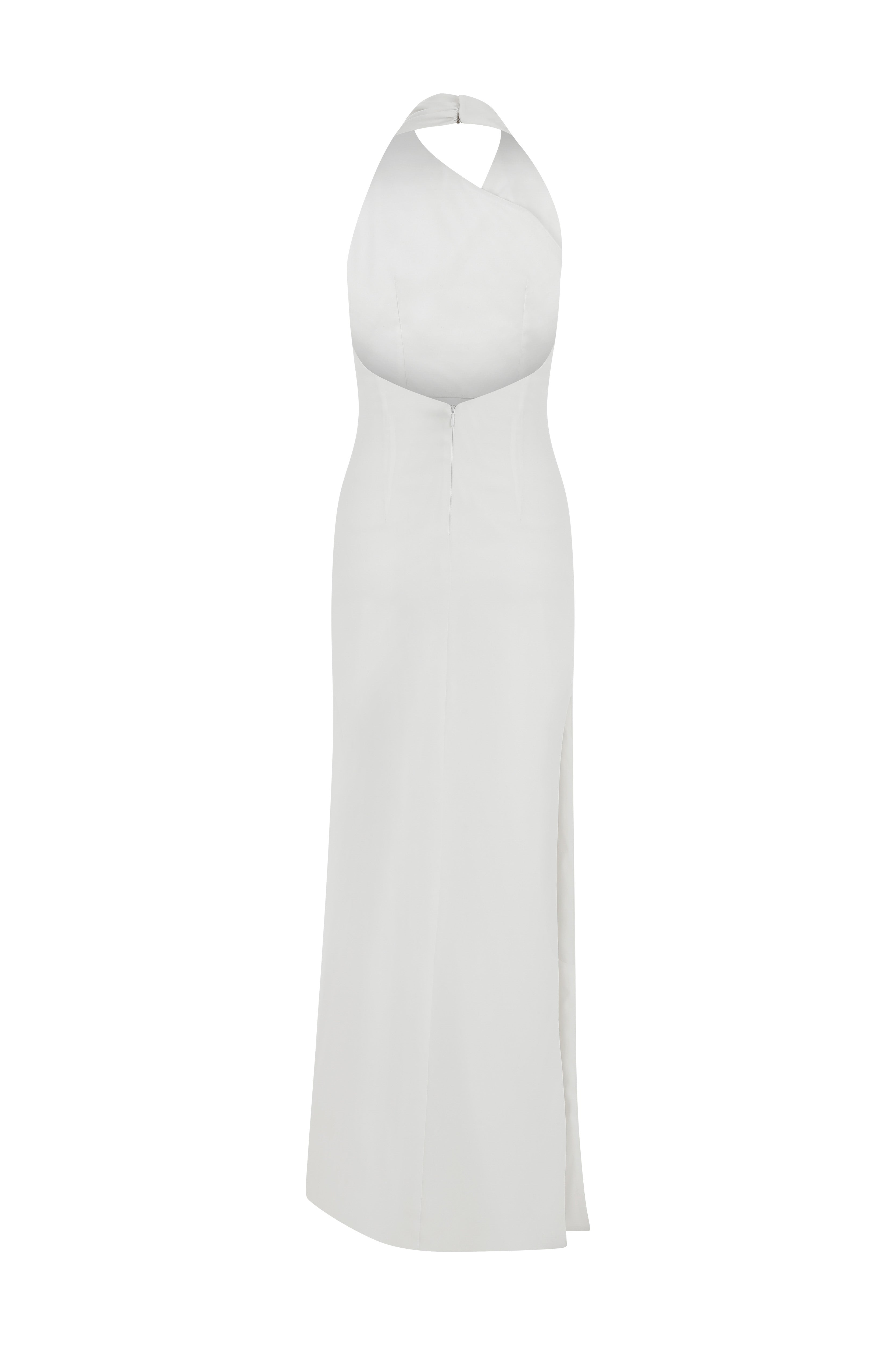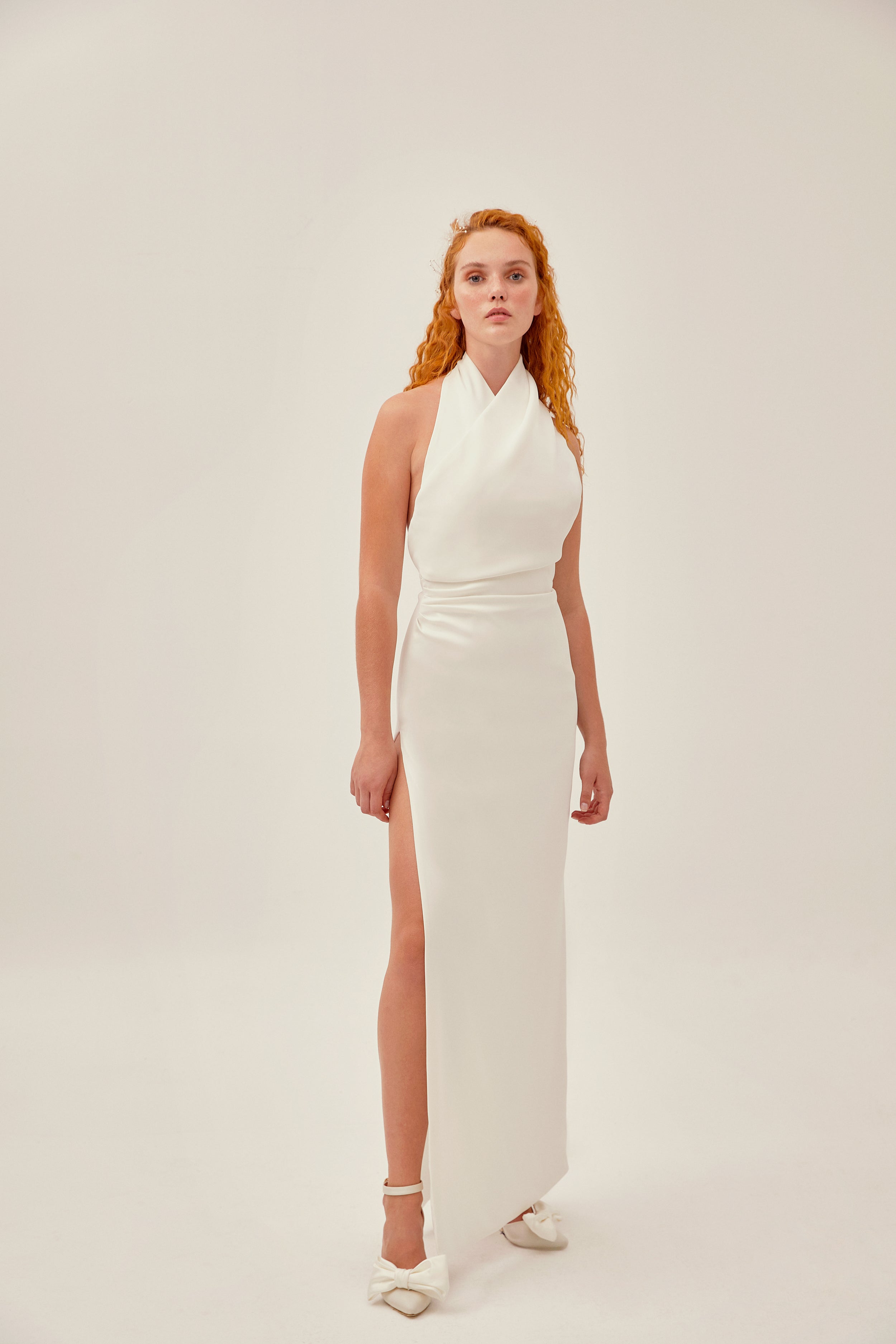 Featuring a long slit on the side, Cybelle is the halter-neck number, finished with tied neckline and attached sash.
