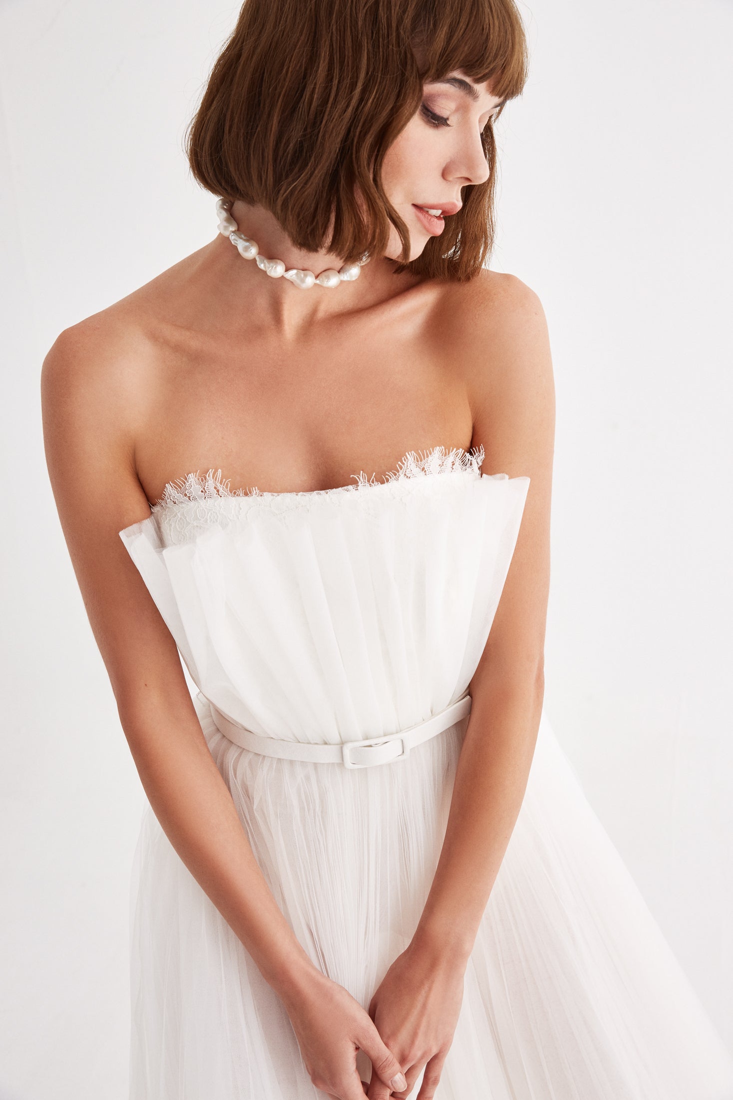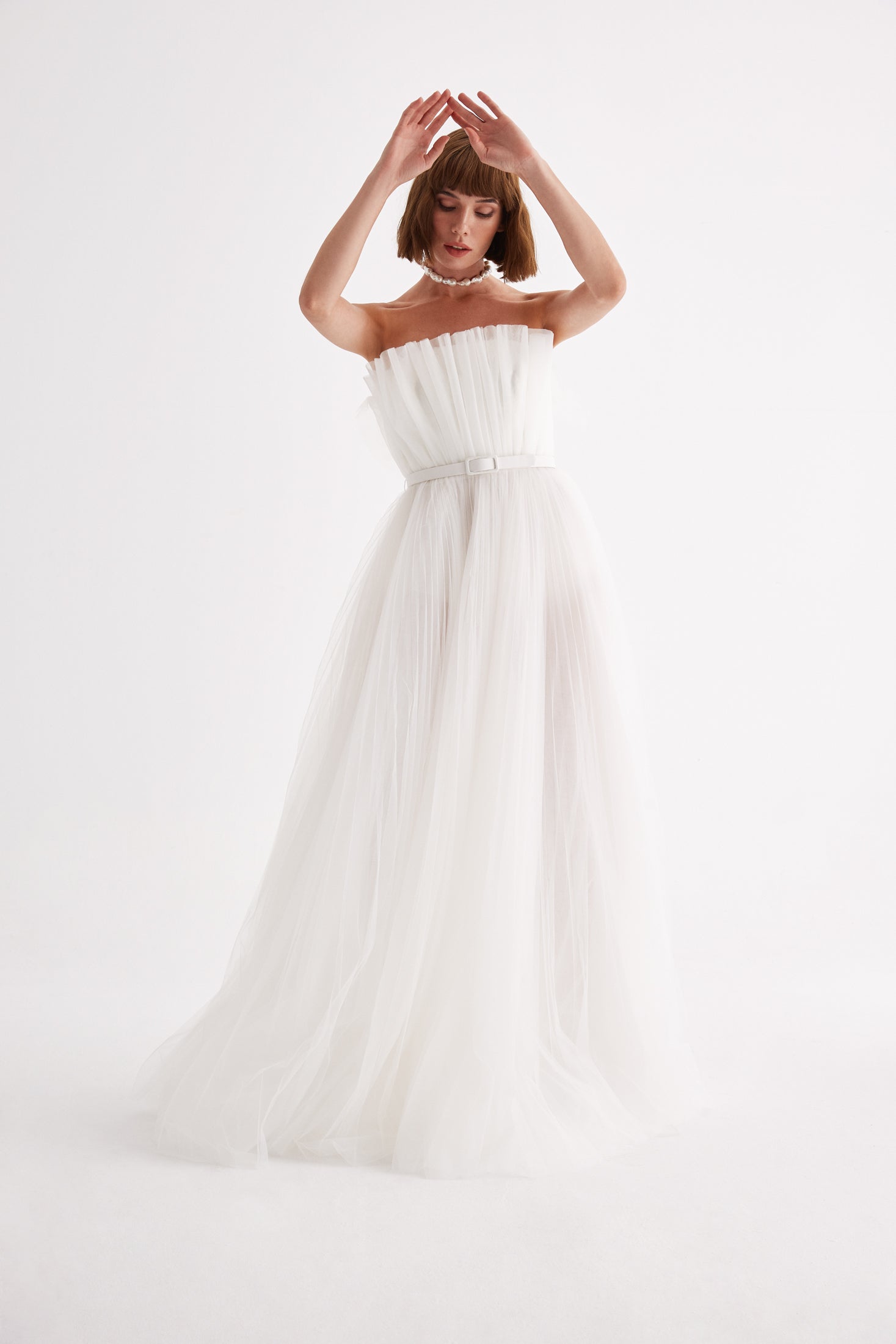 Gaia is designed with a pleated tulle skirt and lace detailed top. It comes with a belt in crepe. A perfect choice for the modern and whimsical brides!