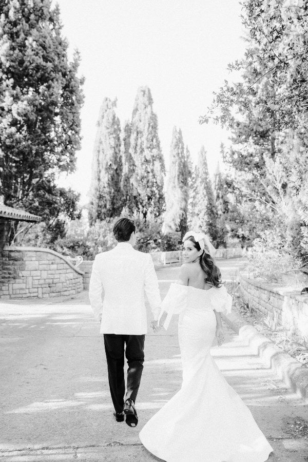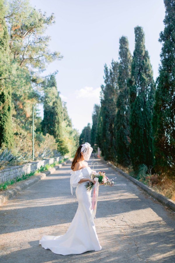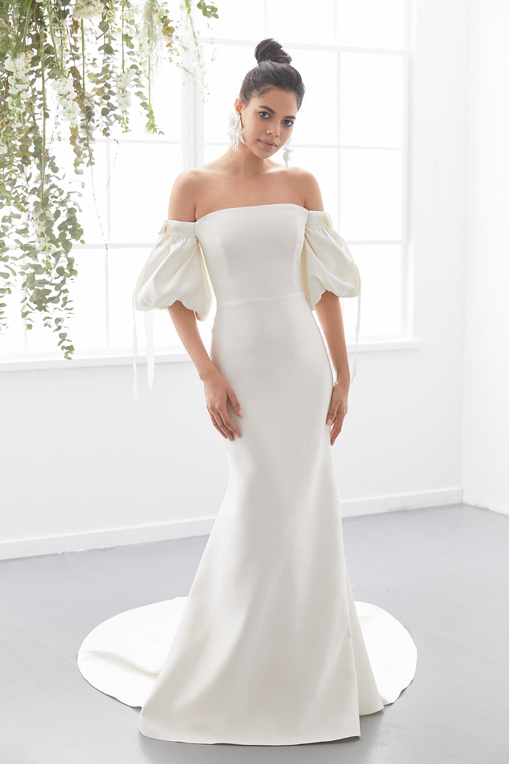 One of our iconics! A refreshing rendition on a classic column silhouette, this off-the-shoulder duchess satin gown features a structured satin corset, silk satin lining, sweeping chapel train, and balloon sleeves finished with velvet ribbons on the sleeve shoulders for a luxe final touch.