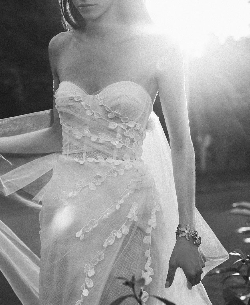A tulle gown with a strapless corseted bustier and enveloping skirt, both adorned with floral embroidery and 3D organza flowers.