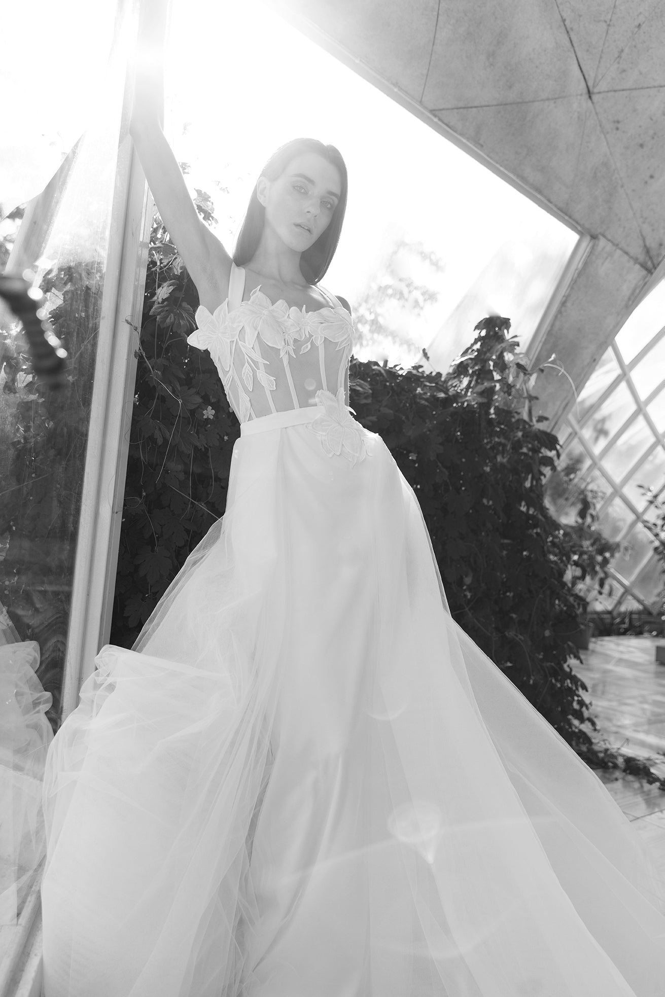 A tulle gown with a sheer corseted bodice, exquisitely embroidered with silk velvet floral appliqués, complemented by a separate, dramatic overskirt tail.