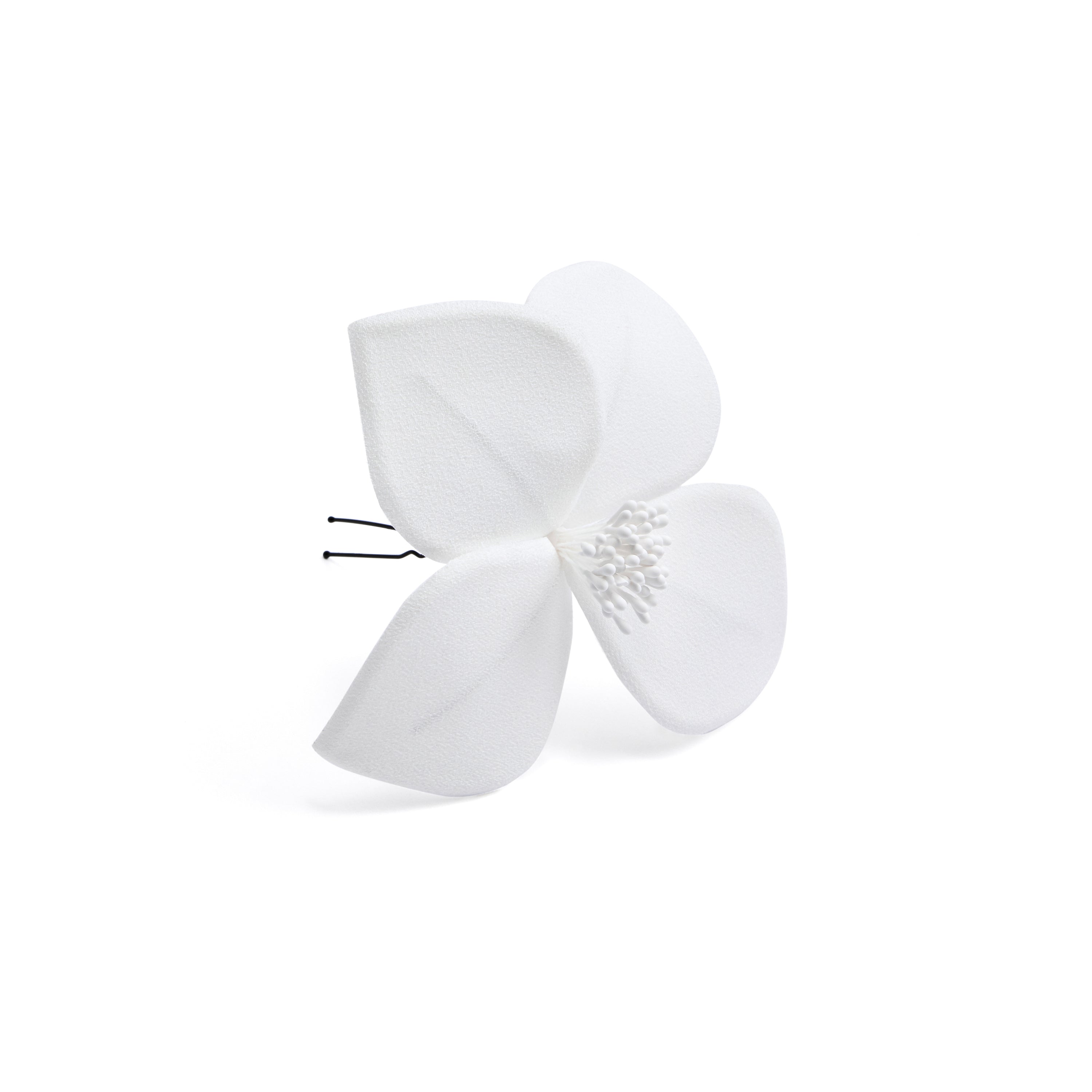 Handcrafted with delicate fabric petals and a textured beaded center, Luma is a minimal yet striking hairpin — perfect for modern brides, civil ceremonies, or adding a soft sculptural touch to any hairstyle.