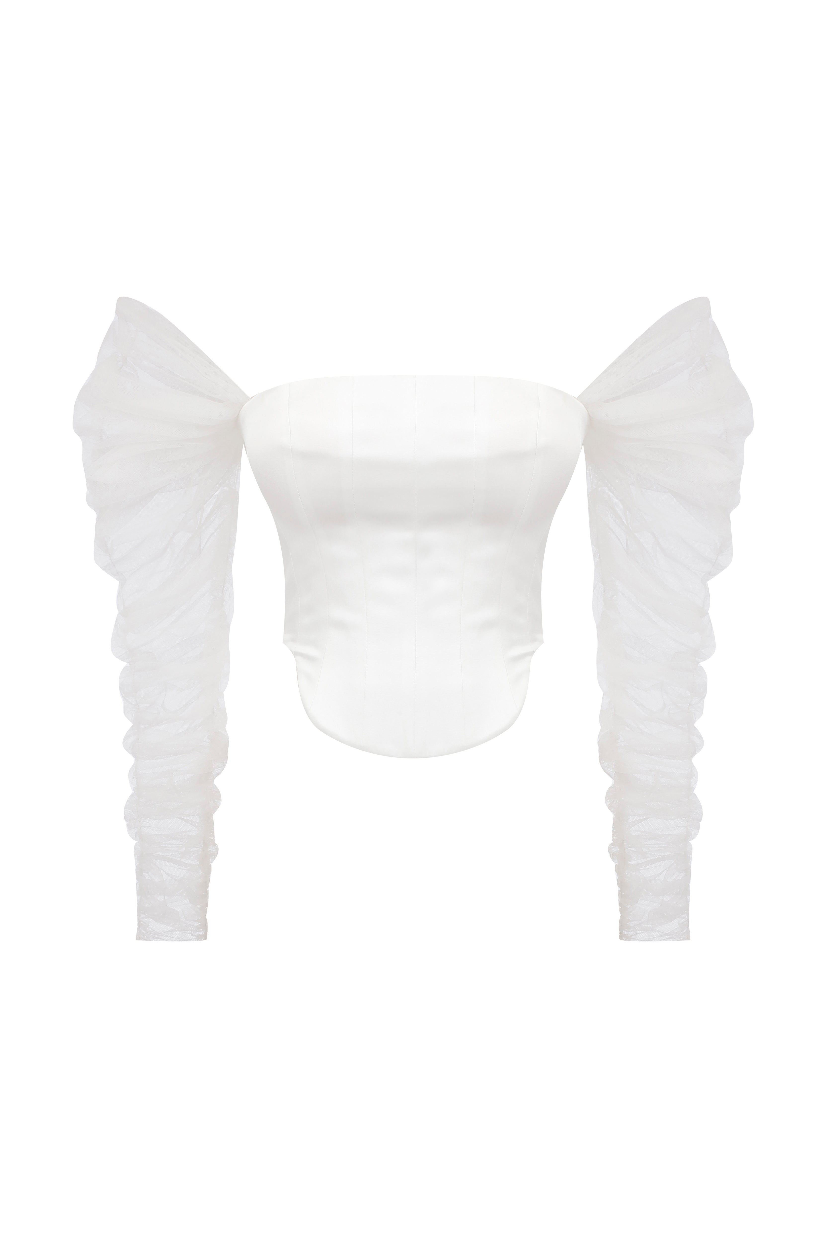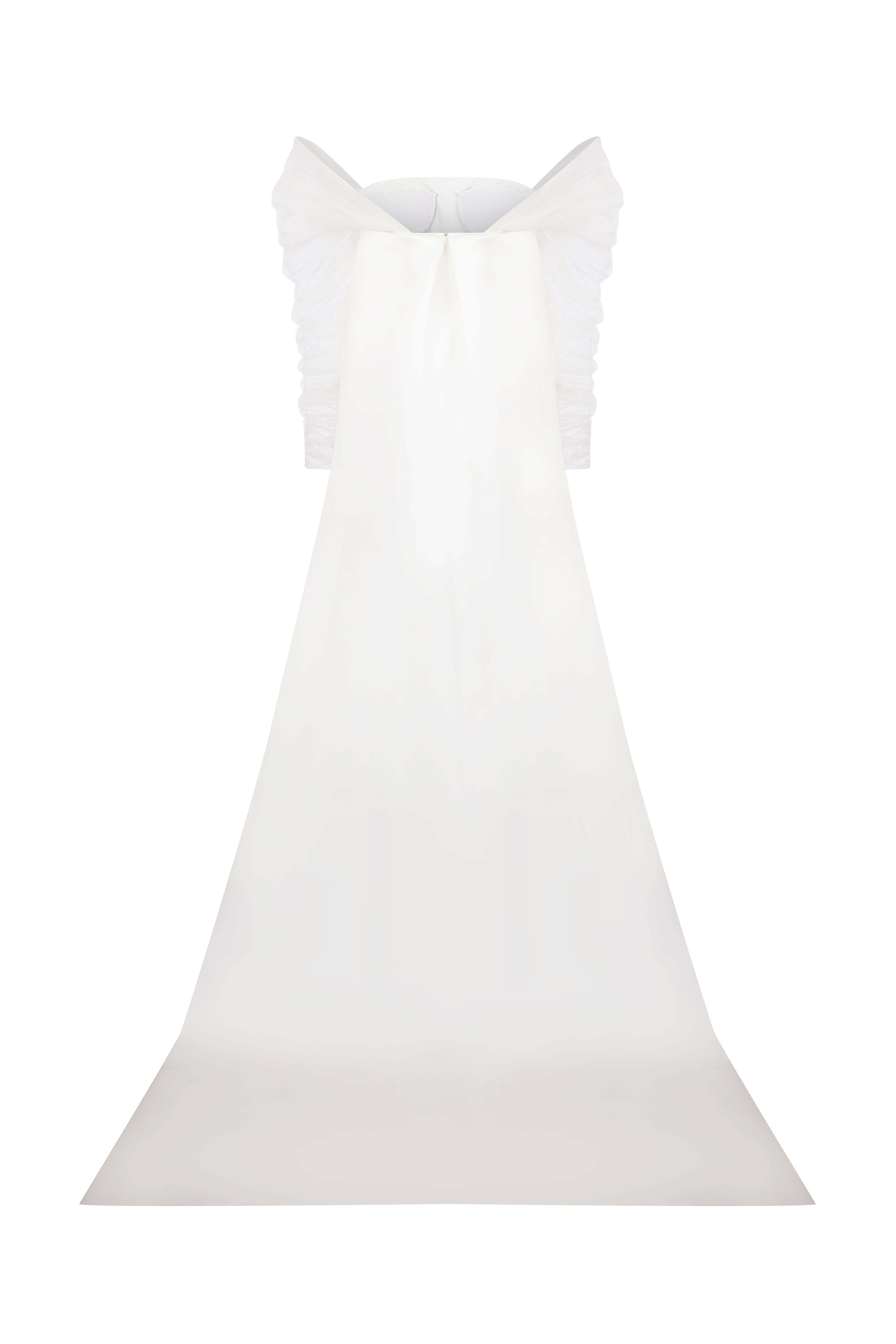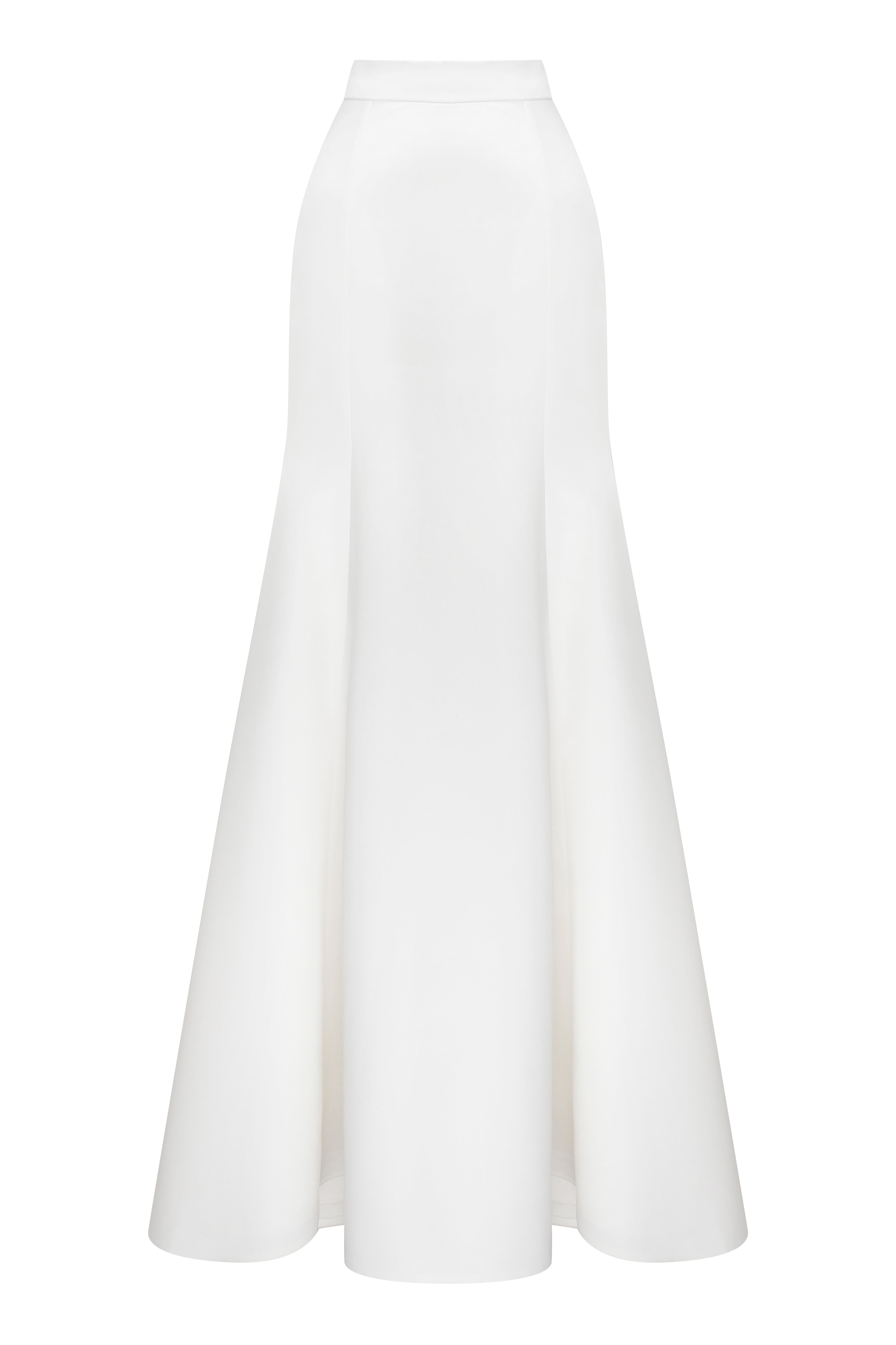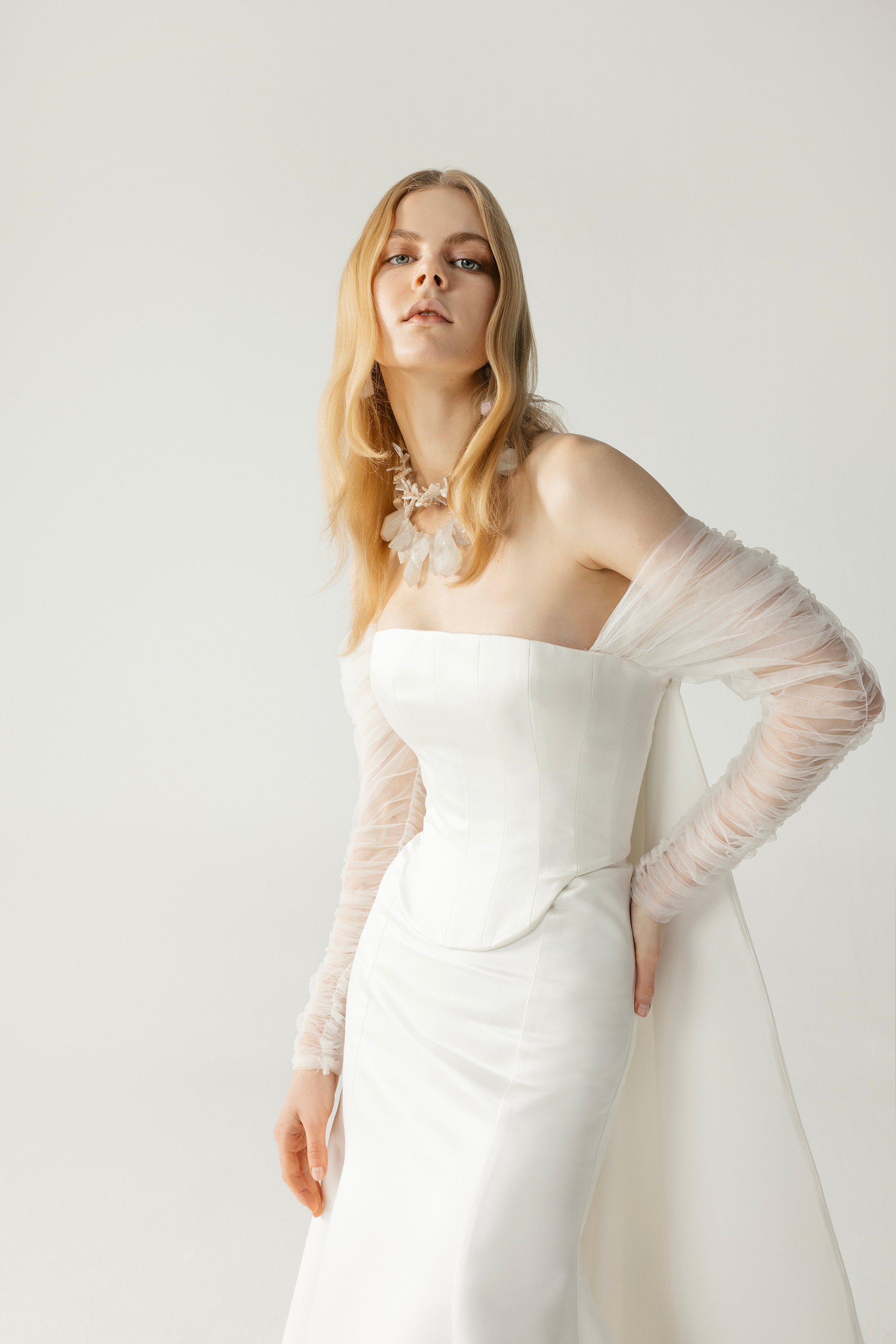 Victorian style bustier square neck silk satin mermaid gown with detachable skirt.