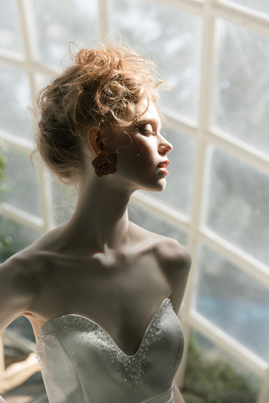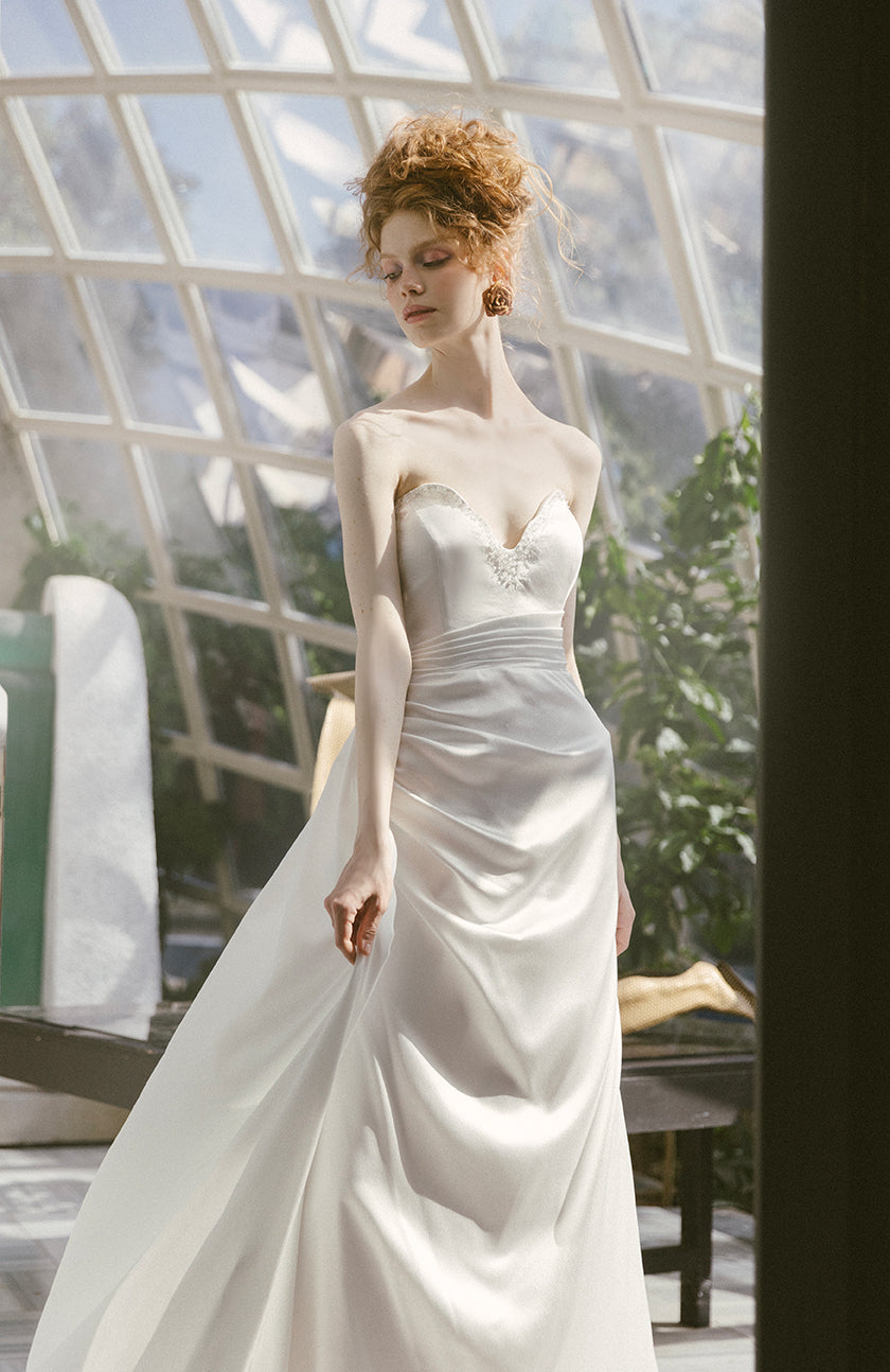 A lustrous satin gown with a bustier inspired by floral shapes and a one-sided draped skirt. The bustier’s edges are adorned with crystals and sequins.