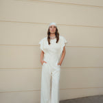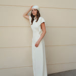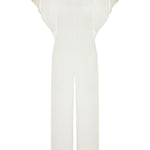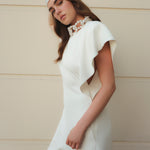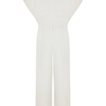 A bold yet minimal statement for the modern bride. Orlena is tailored from structured crepe with a sculptural shoulder line and wide-leg silhouette. The high neckline is adorned with an oversized detachable pearl necklace, adding an architectural edge to bridal dressing.
