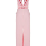 The front of the dress showcases a sleek, draped neckline that adds a touch of modern femininity, while the back reveals delicate strappy details adorned with small bows, offering a hint of playful allure. The form-fitting skirt accentuates your curves, and the high slit at the back ensures ease of movement and adds a touch of drama to your stride.