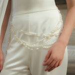 Delicately draped layers of pearls add elegance to modern couture silhouettes. Handcrafted as a belt-necklace hybrid, this versatile piece enhances the waistline with sophistication while also transforming into a statement jewellery accent for various looks. From bridal gowns to after party ensembles, it offers endless styling possibilities.