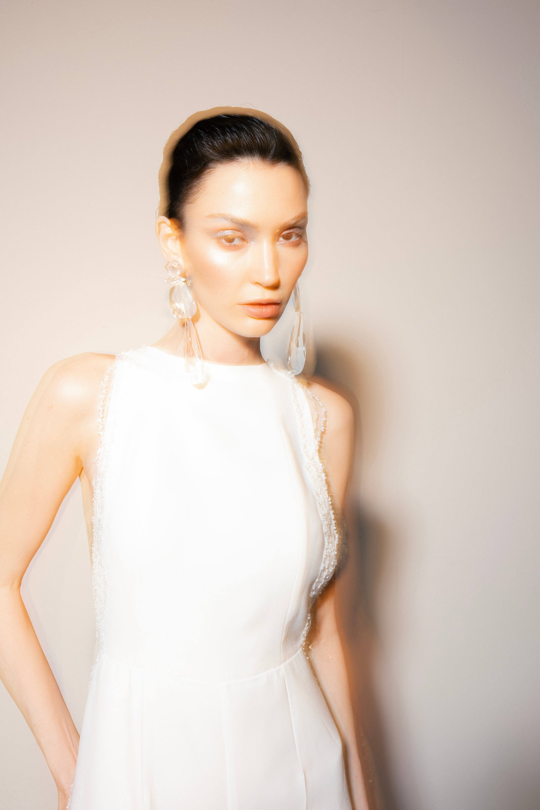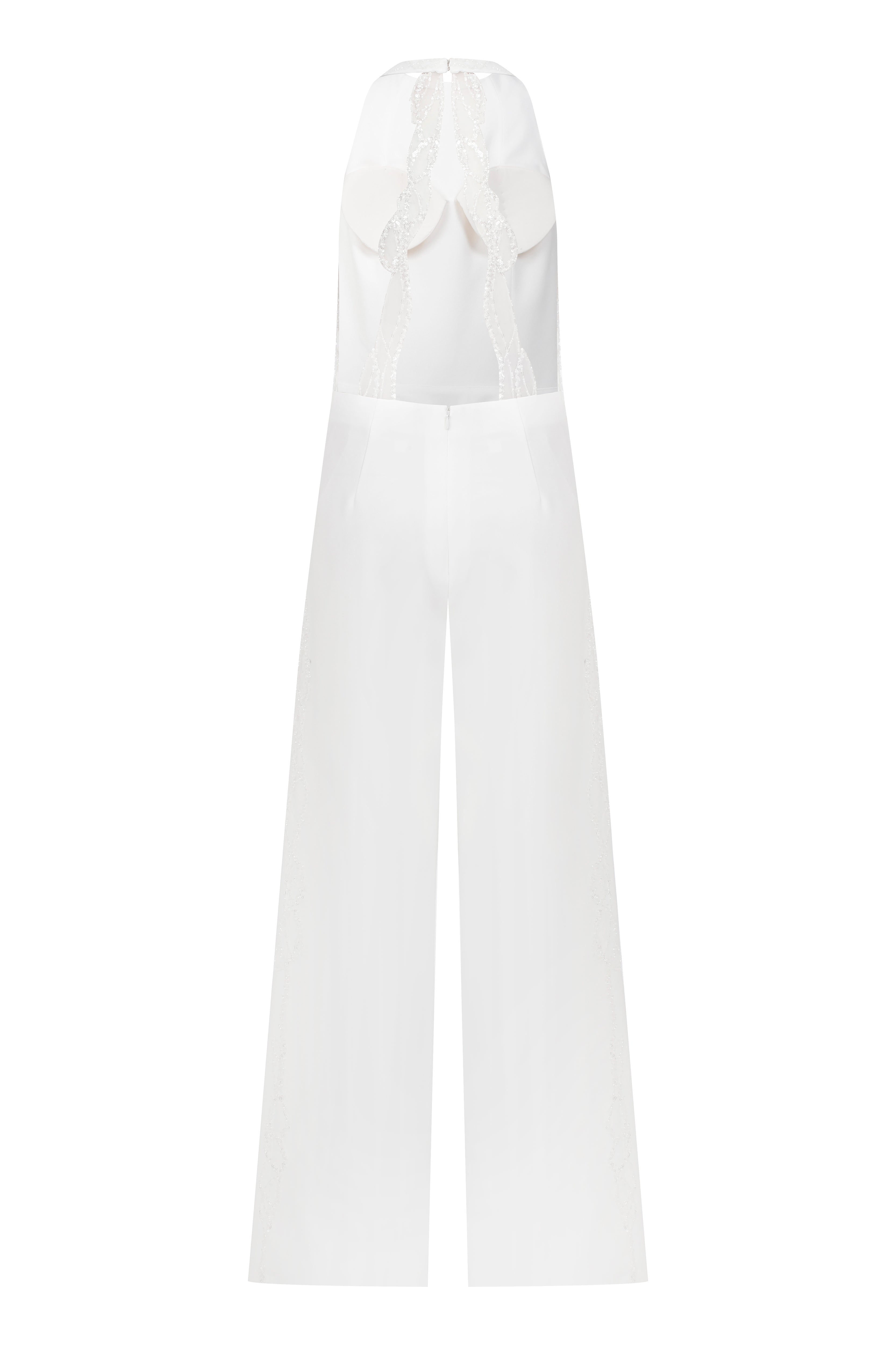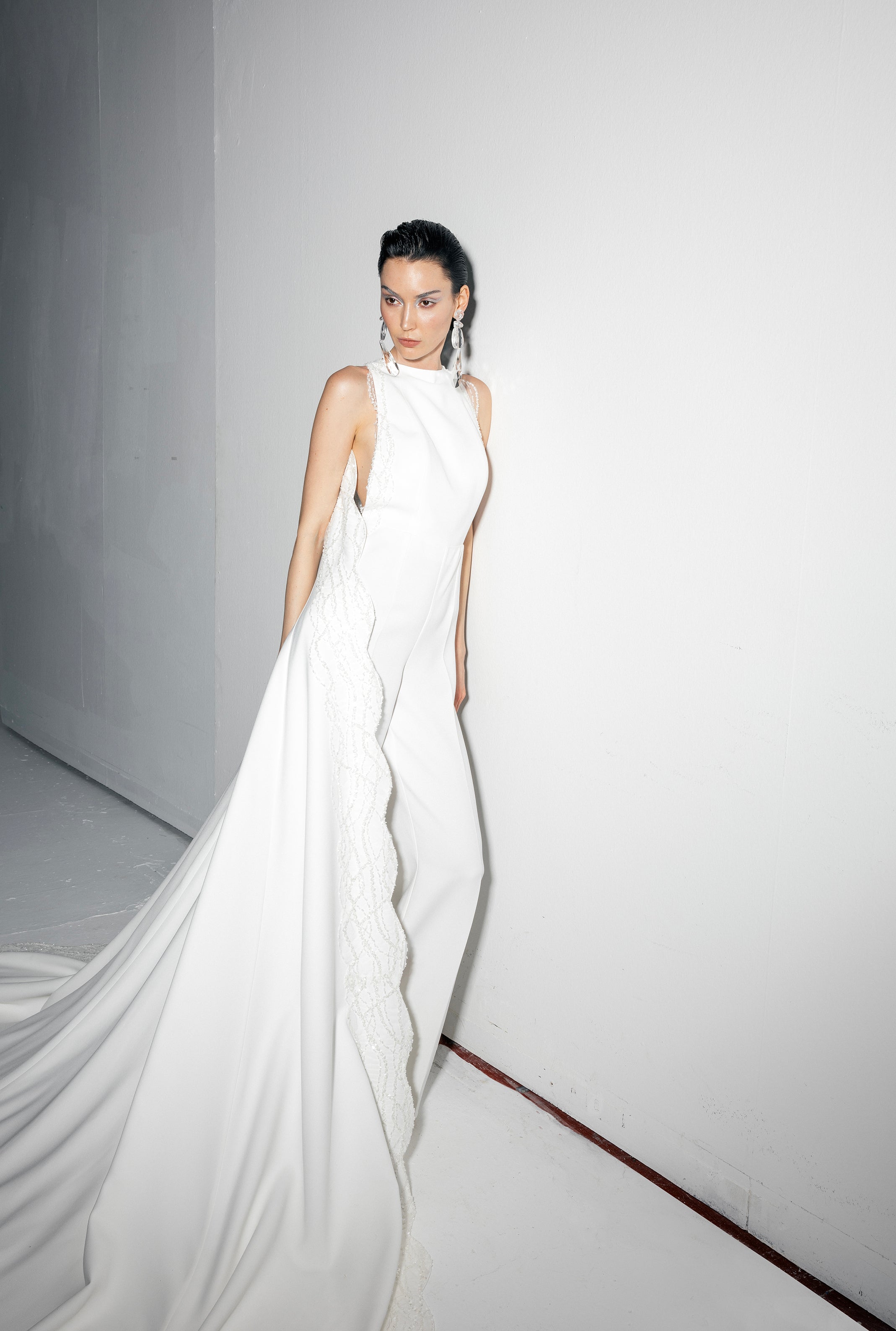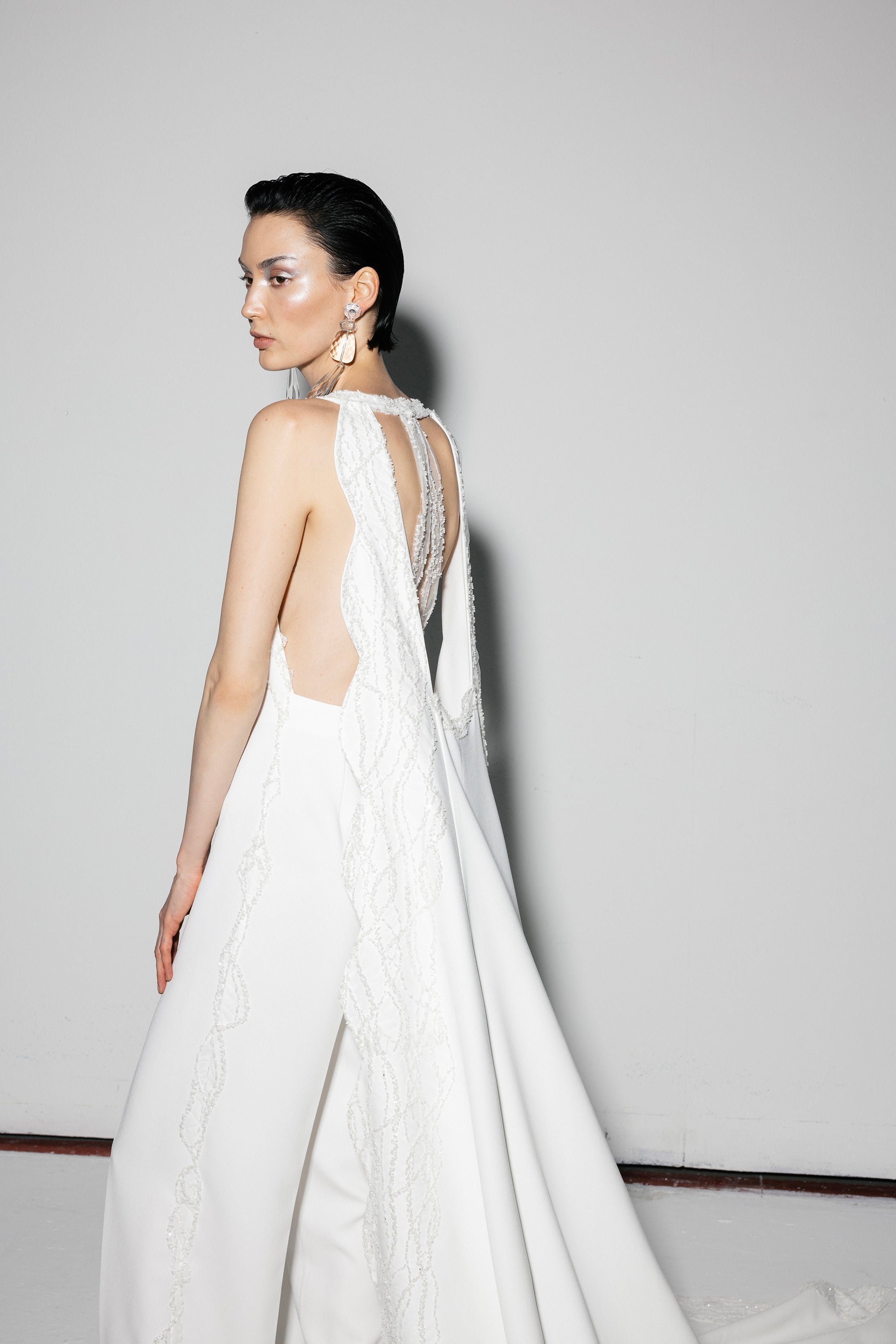 Halter neck crepe jumpsuit with beadings all over the sides and with two meters of detachable embellished cape.