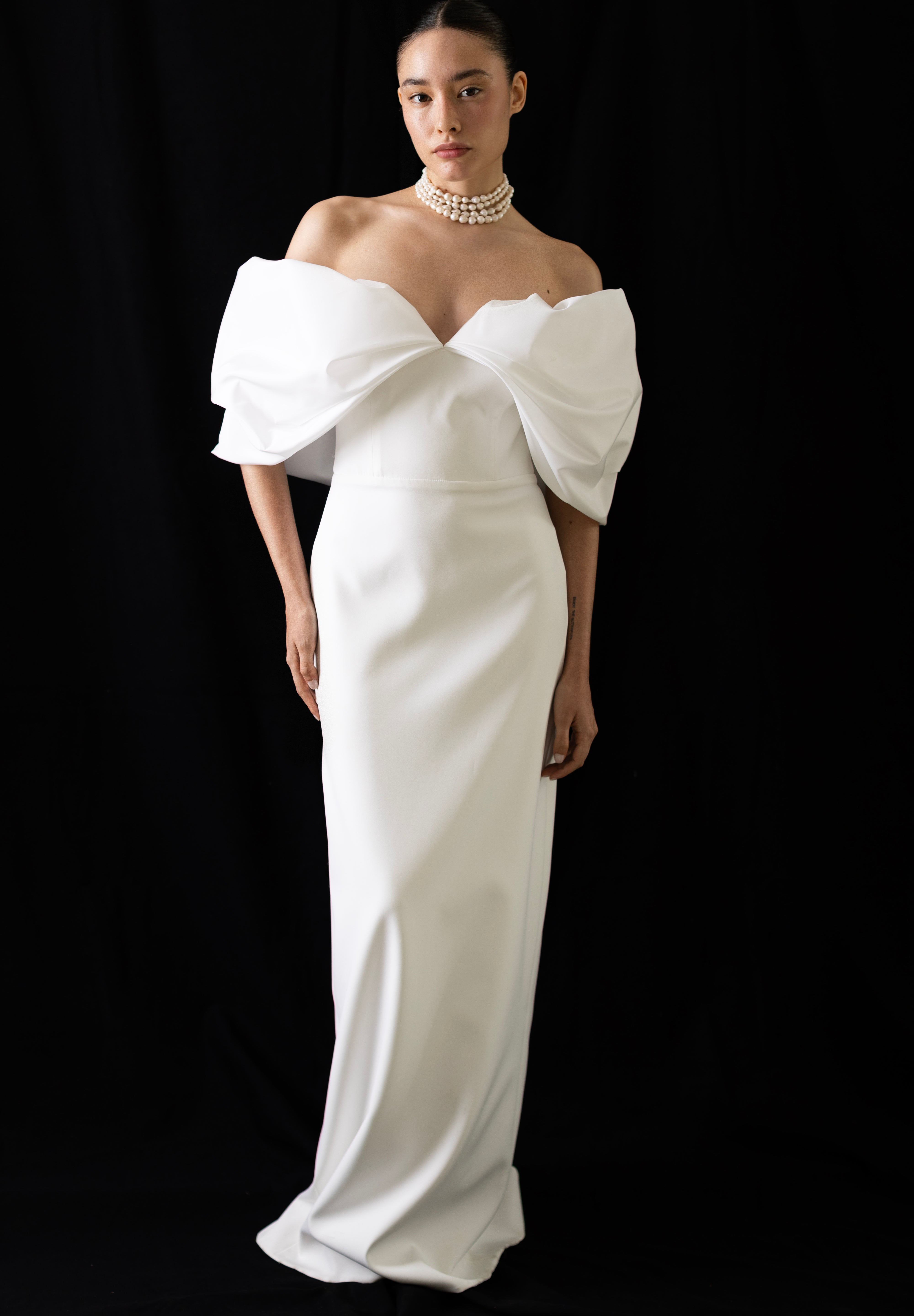 Off-the-shoulder gown made from matte Lycra crepe, featuring structured sleeves crafted from taffeta fabric. The corseted bodice fits the body perfectly, while the voluminous sleeves and the texture of the taffeta create a modern and sophisticated look.