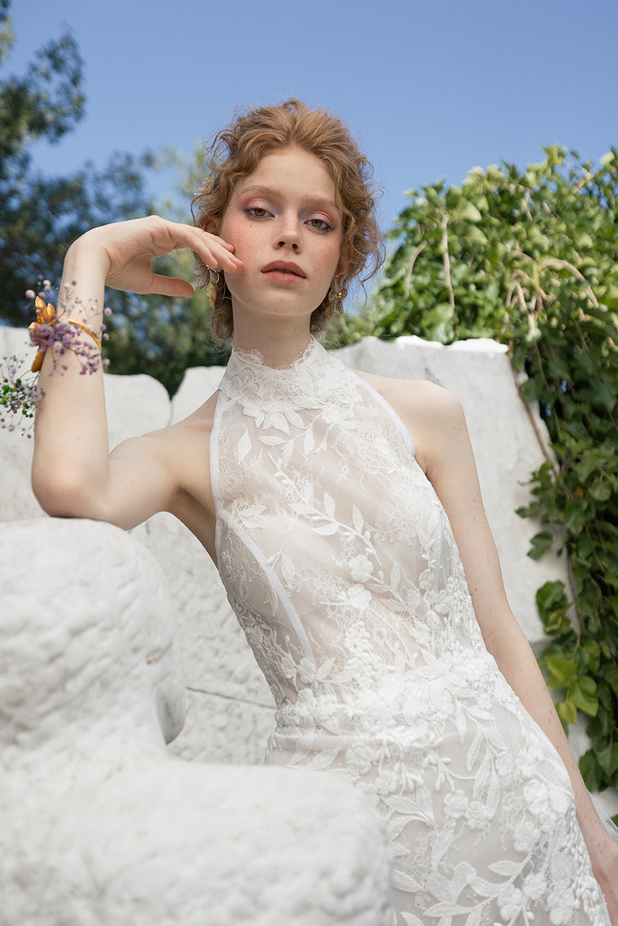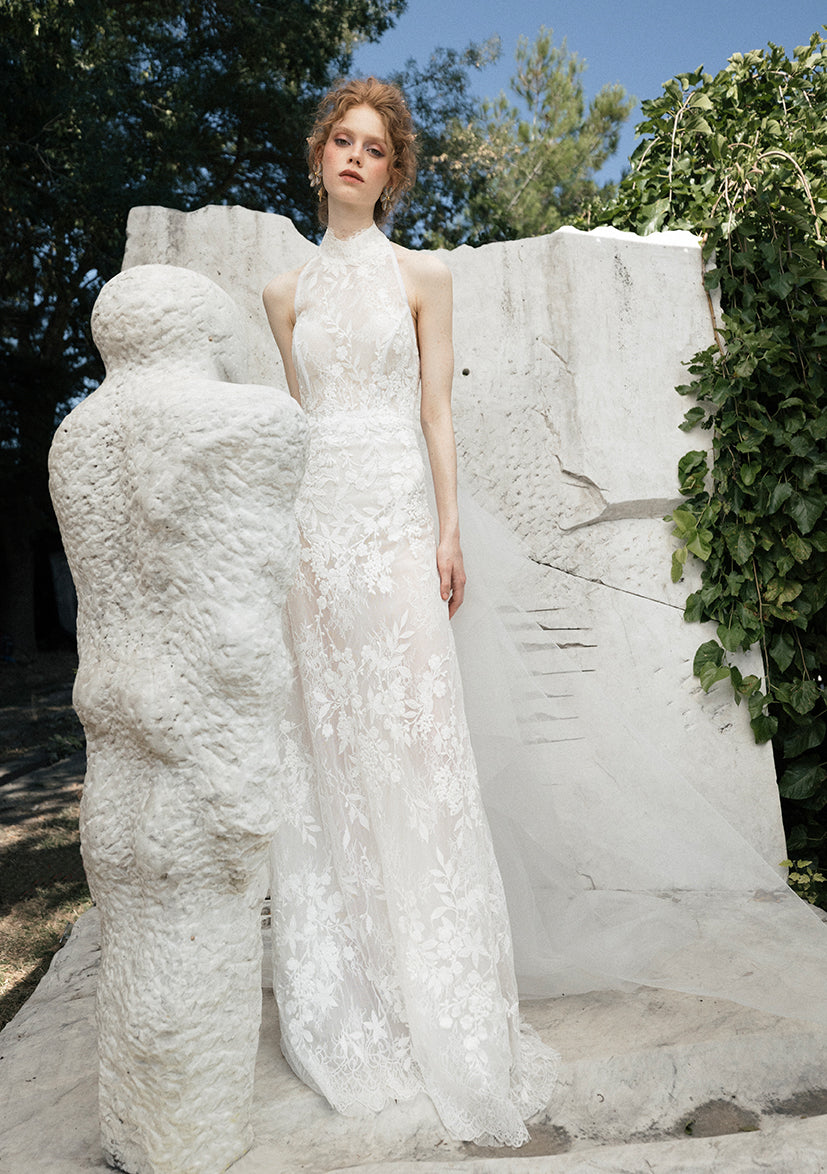 A halter neck lace gown with delicate embroidery and a slim A-line skirt that flows into an attached tulle layered train.