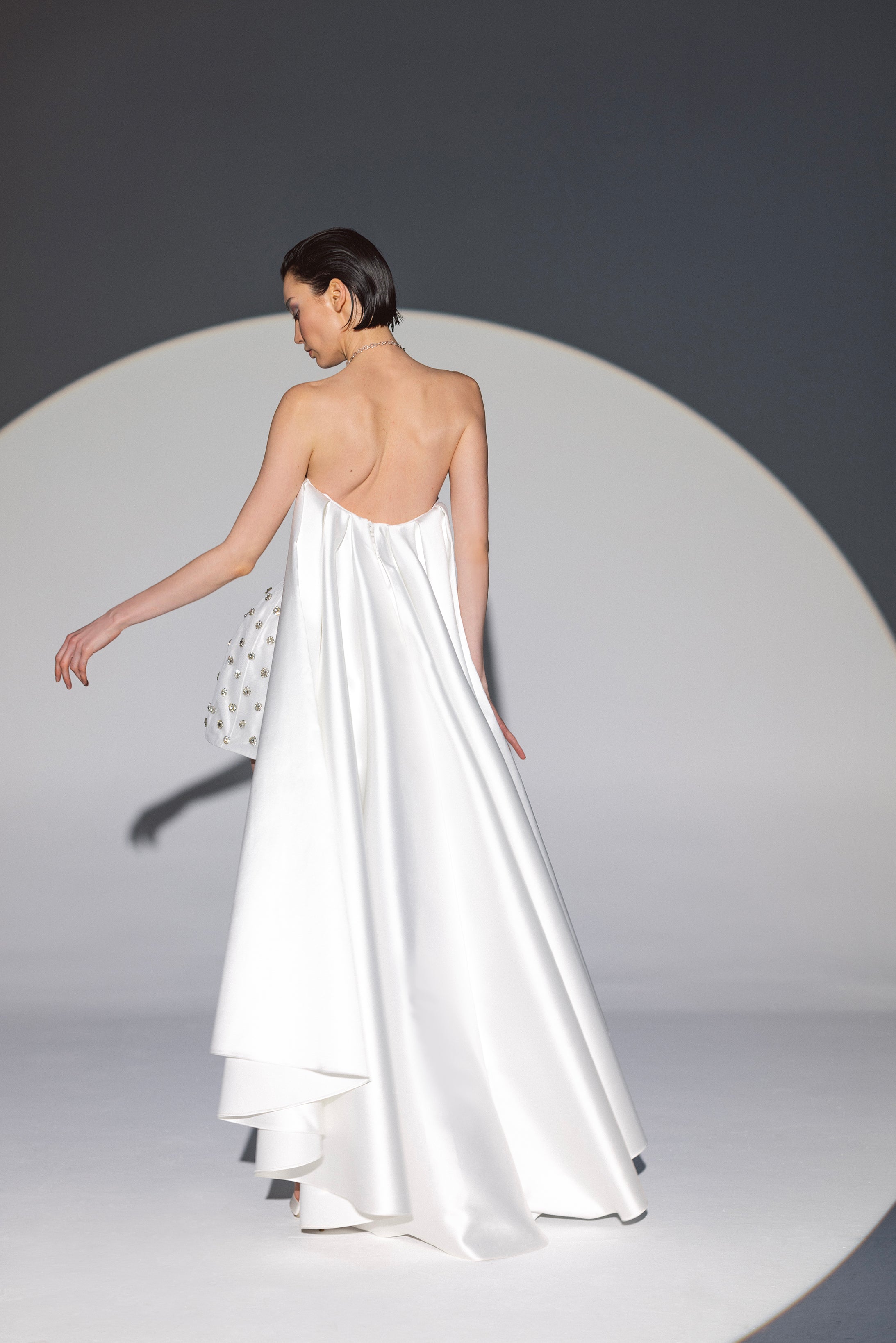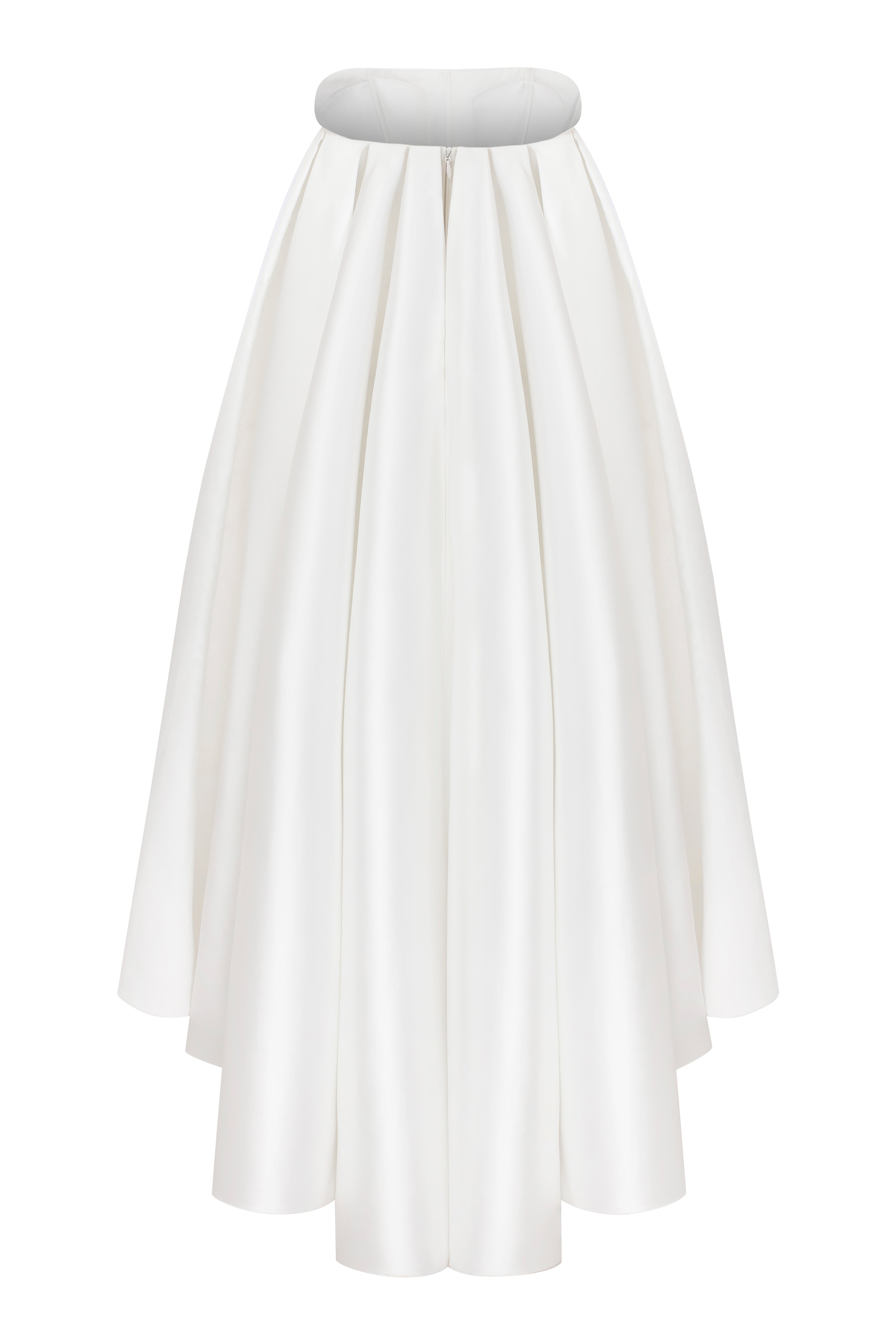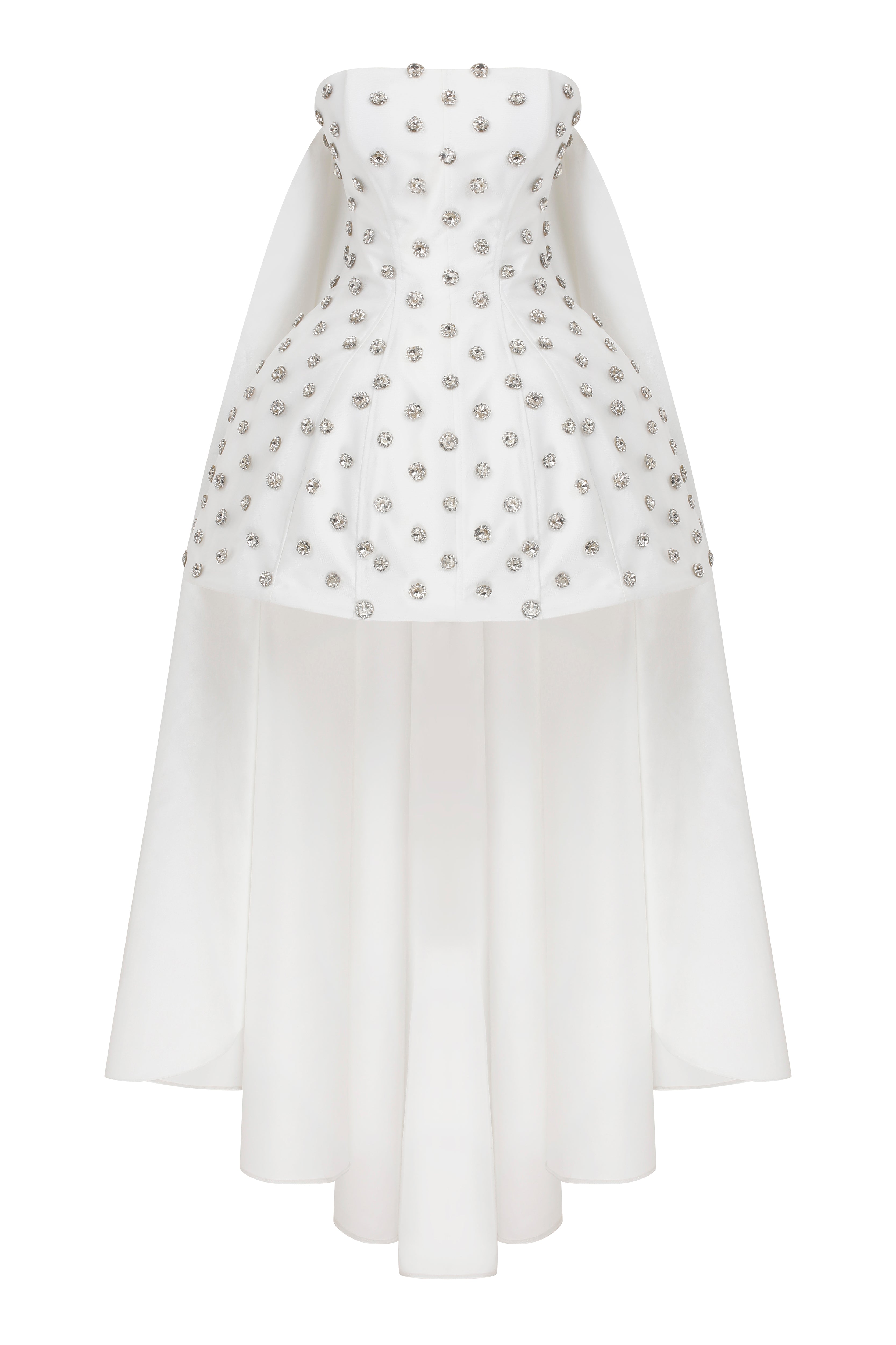 Mikado mini dress constructed as a full corset and covered with full rhinestones. The mikado tail cape is attached to the dress.