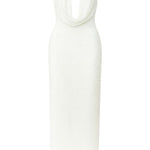 light and purity. Featuring a halter neckline with fluid draping and a fully open back down to the