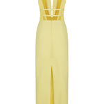 The front of the dress showcases a sleek, draped neckline that adds a touch of modern femininity, while the back reveals delicate strappy details adorned with small bows, offering a hint of playful allure. The form-fitting skirt accentuates your curves, and the high slit at the back ensures ease of movement and adds a touch of drama to your stride.