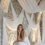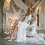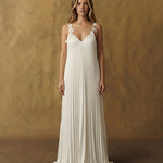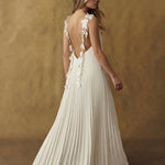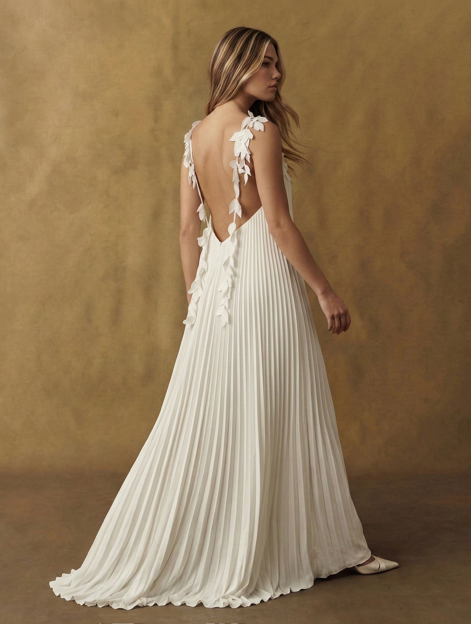 Appliqué-draped straps add a poetic touch, while the open back balances the