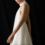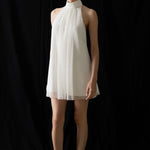Tura is crafted from a lightly sheer fabric with intricate beading, featuring a halter neck design that accentuates the neckline. The mini-length cut and clean lines offer a simple yet striking look