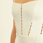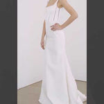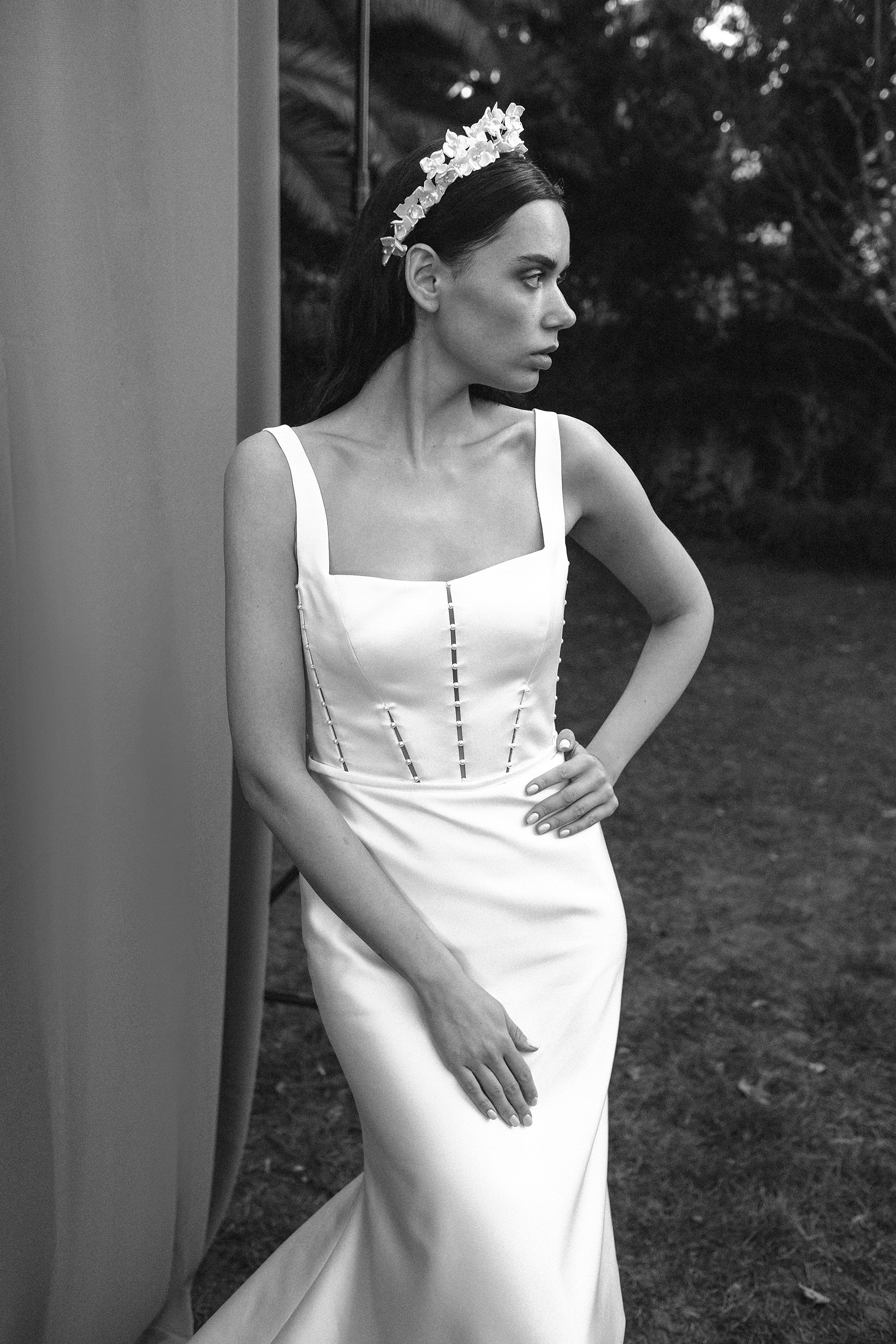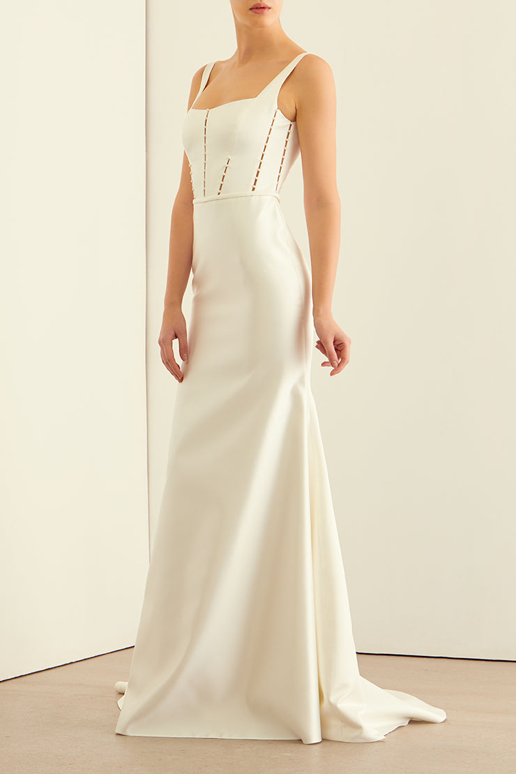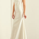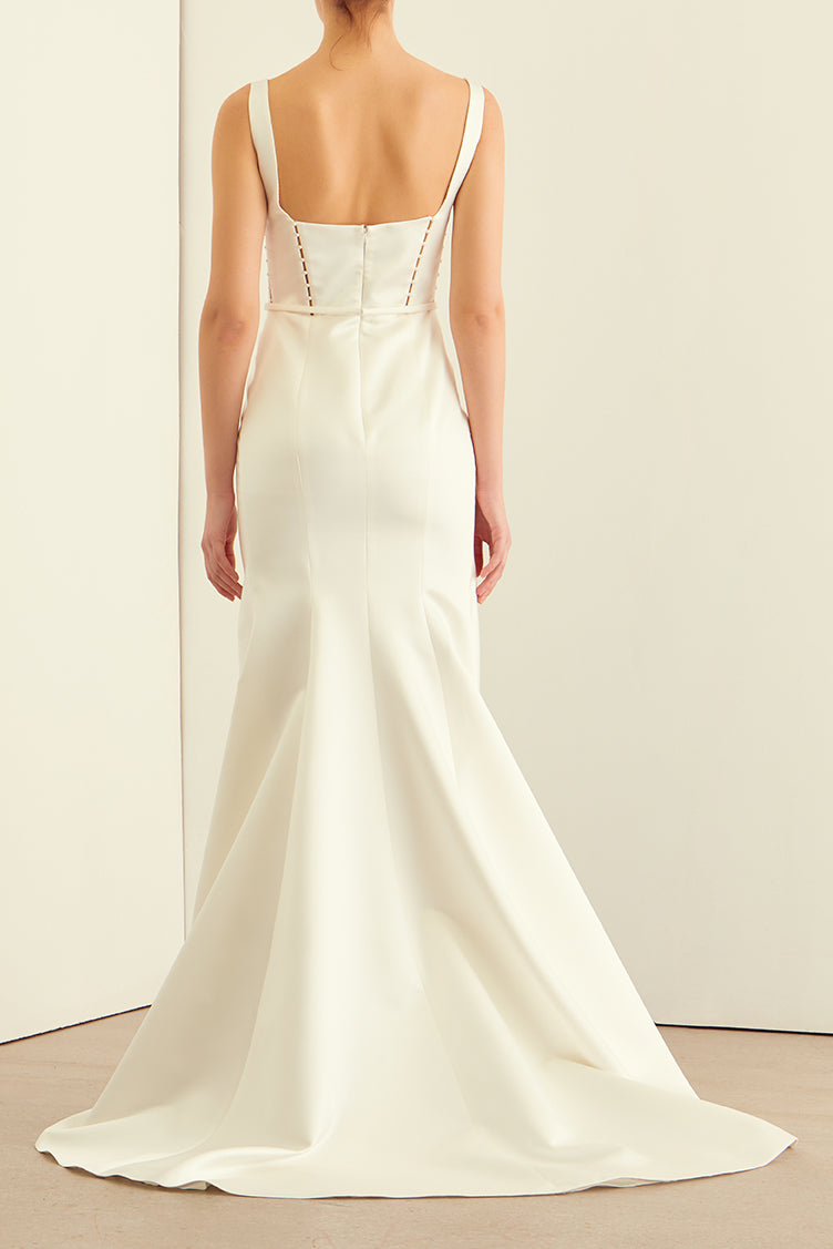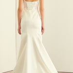 A chic square neckline lends a modern edge to this fitted satin mermaid gown, while pearl details on the bodice add romantic softness to the square back decollete and sweeping train.