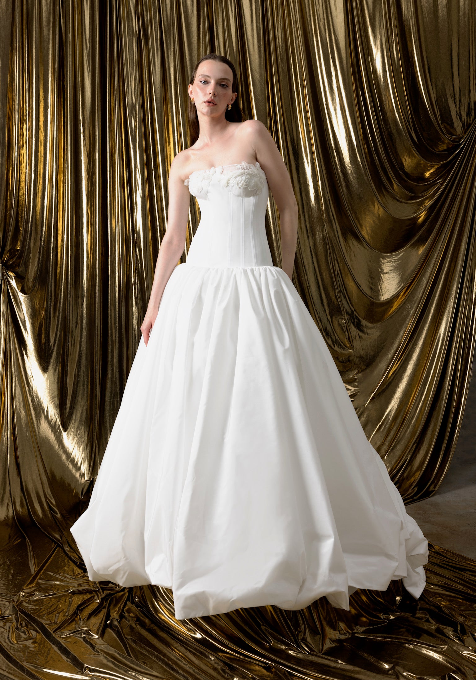 ANJALI is crafted entirely from taffeta, featuring a voluminous princess skirt that flares from the hips. The bodice is fully boned for a corset effect, adorned with embroidered floral appliqués and a semi-transparent detail at the bust.