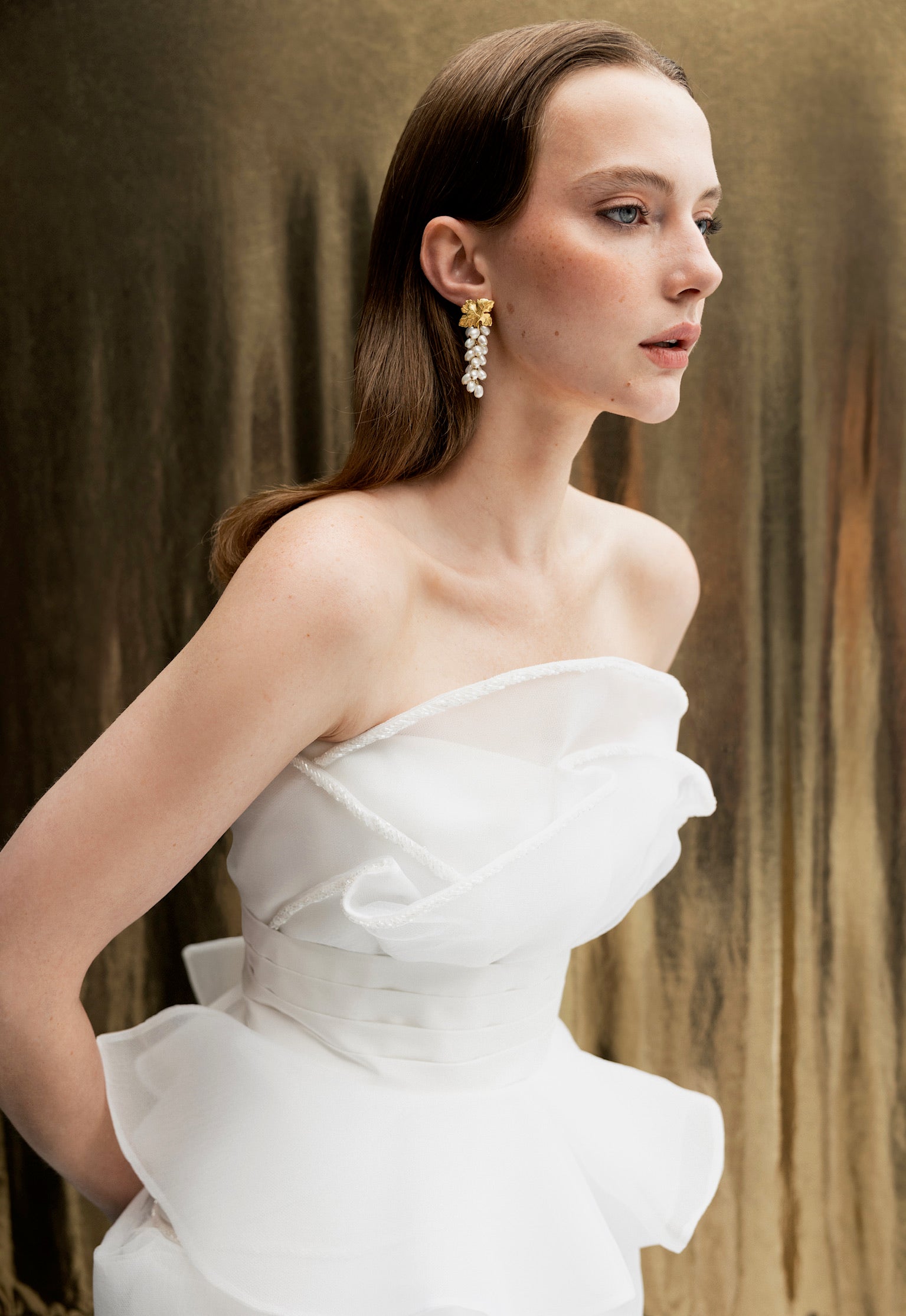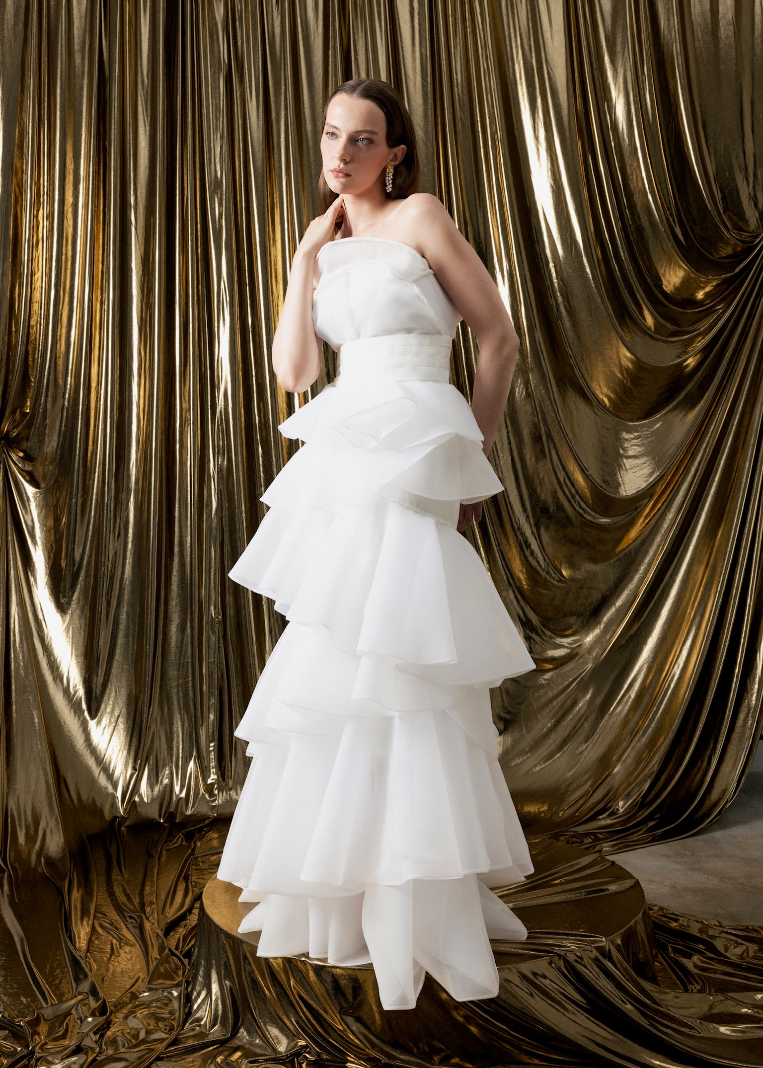 The SELI gown features crinkle organza ruffles and intricate cut glass beadwork. A Dupont satin belt adds a luxurious finish to this modern, sophisticated design.