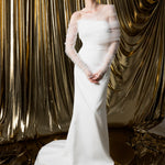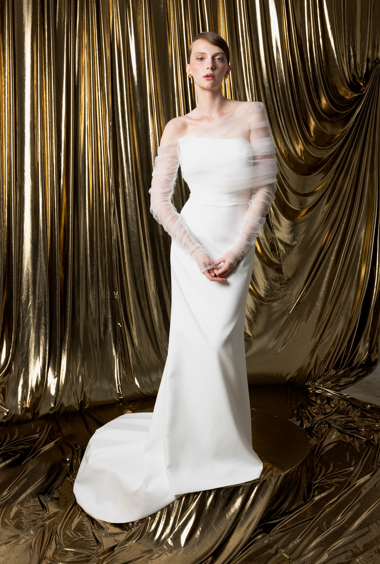 The SUKHA gown features an asymmetrical modern-cut strapless bodice, transitioning into a form-fitting crepe skirt that is a blend of A-line and mermaid styles, elegantly hugging the body. The bodice and sleeves are wrapped in draped, ruched tulle, adding a delicate and ethereal touch.