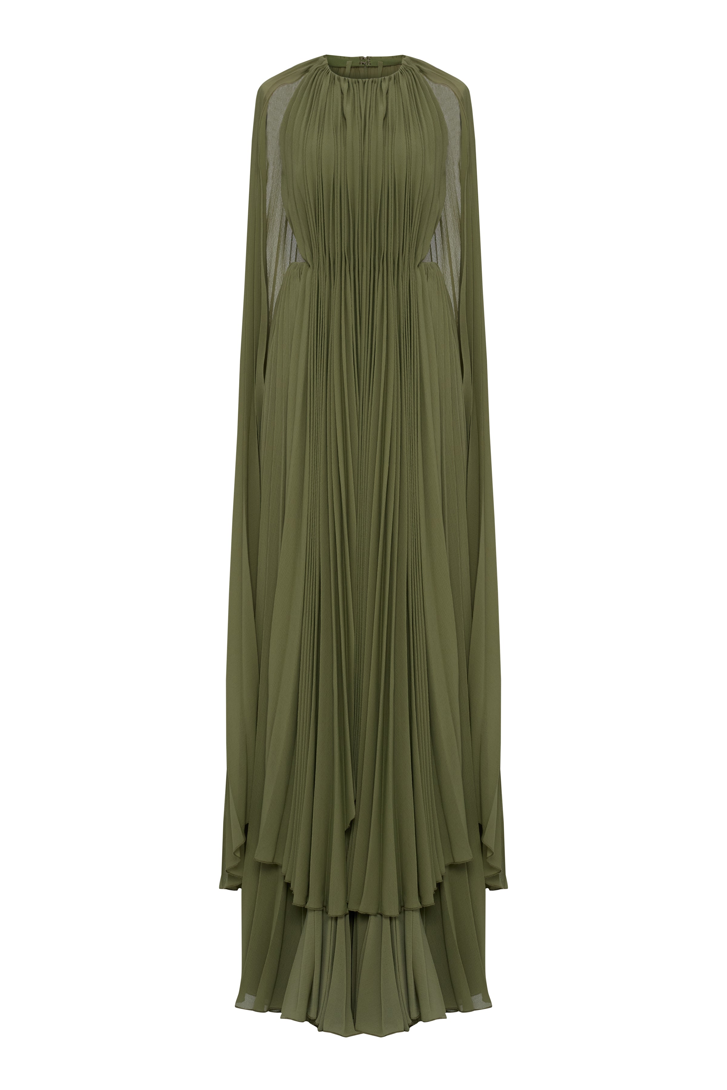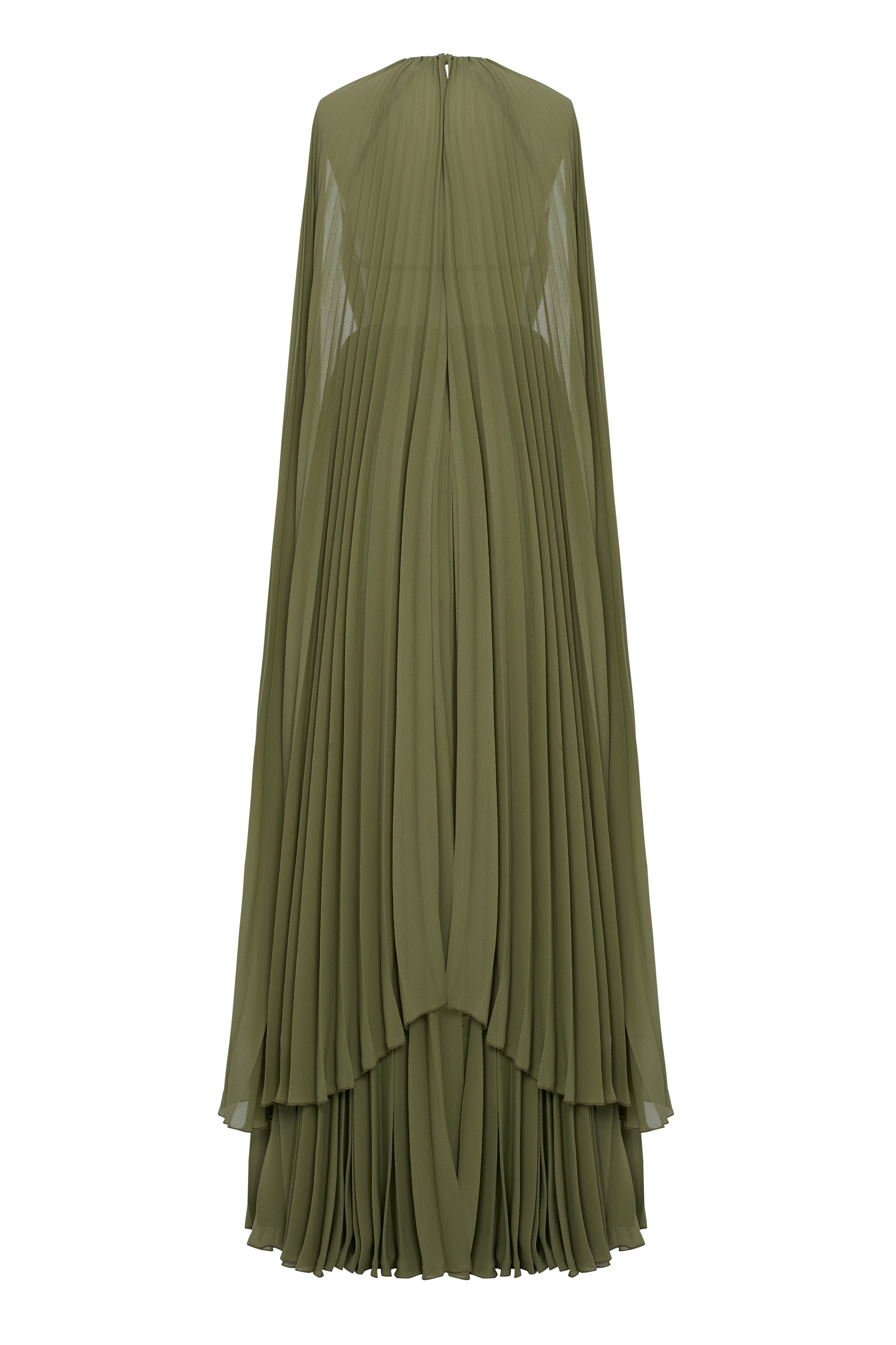 This gown is crafted from chiffon with pleated details, featuring an open-back design with delicate string bands for a striking effect. The cape drapes elegantly from the shoulders, providing a semi-sheer layer that accentuates the open-back while adding a soft, graceful coverage.