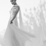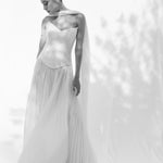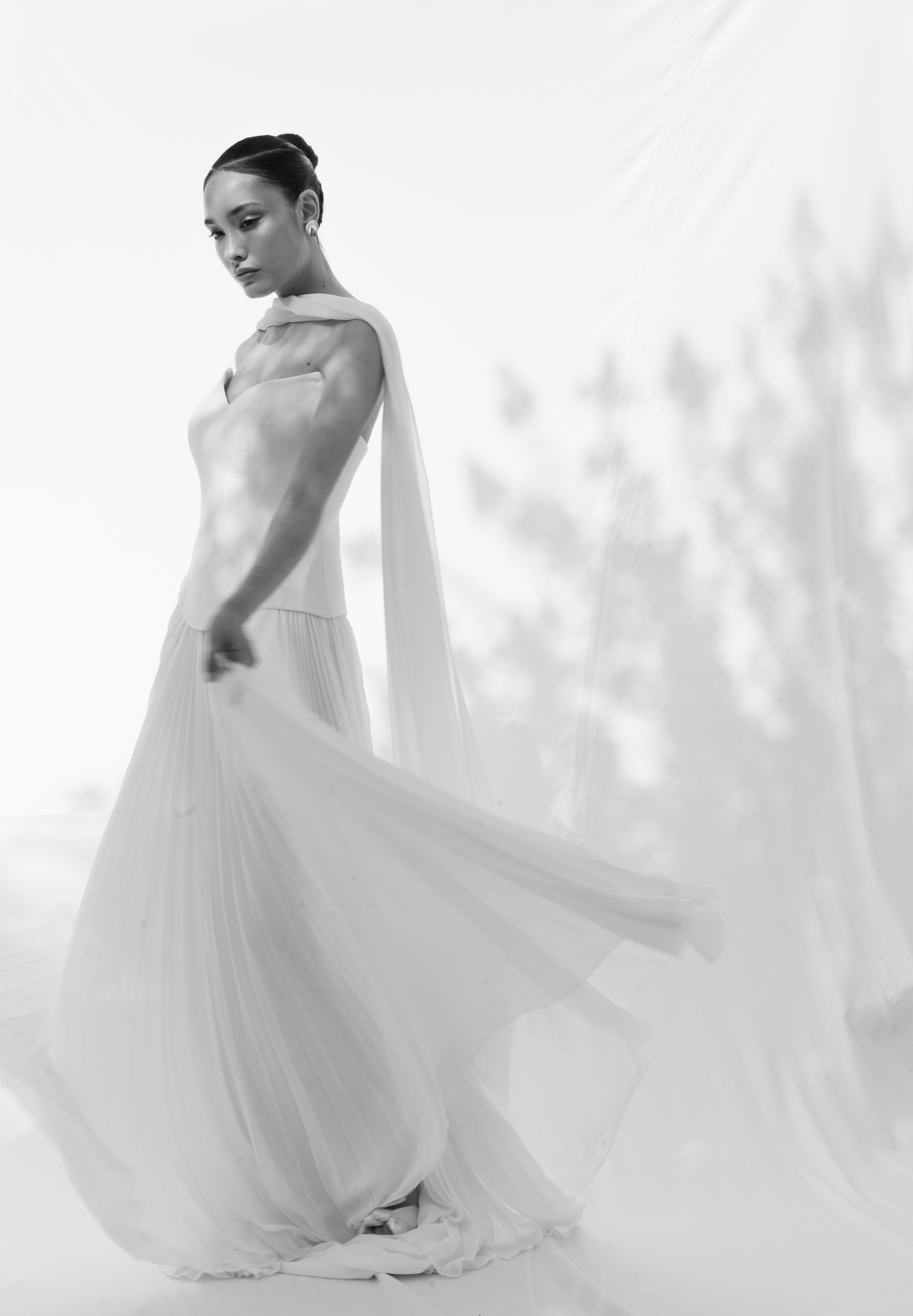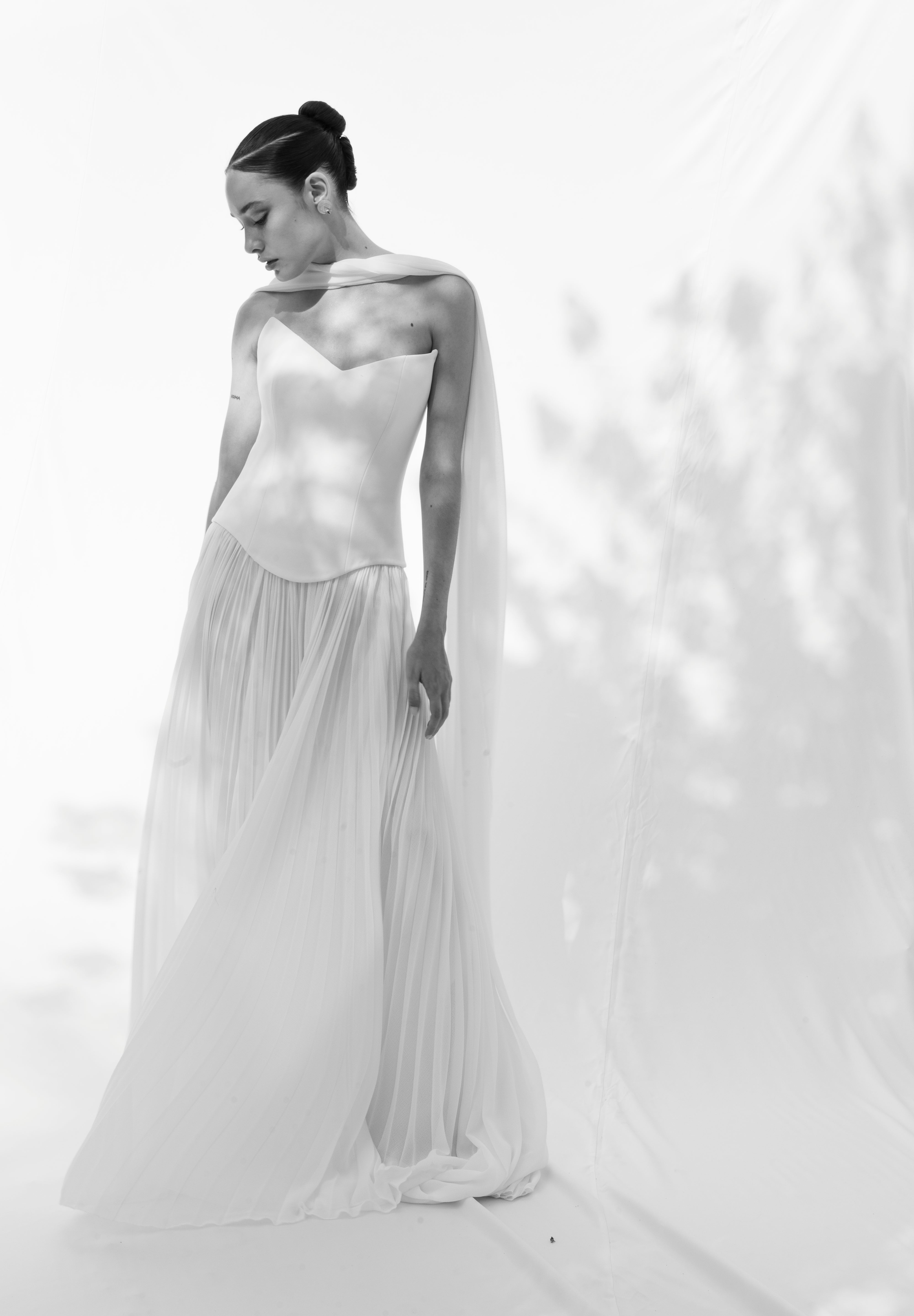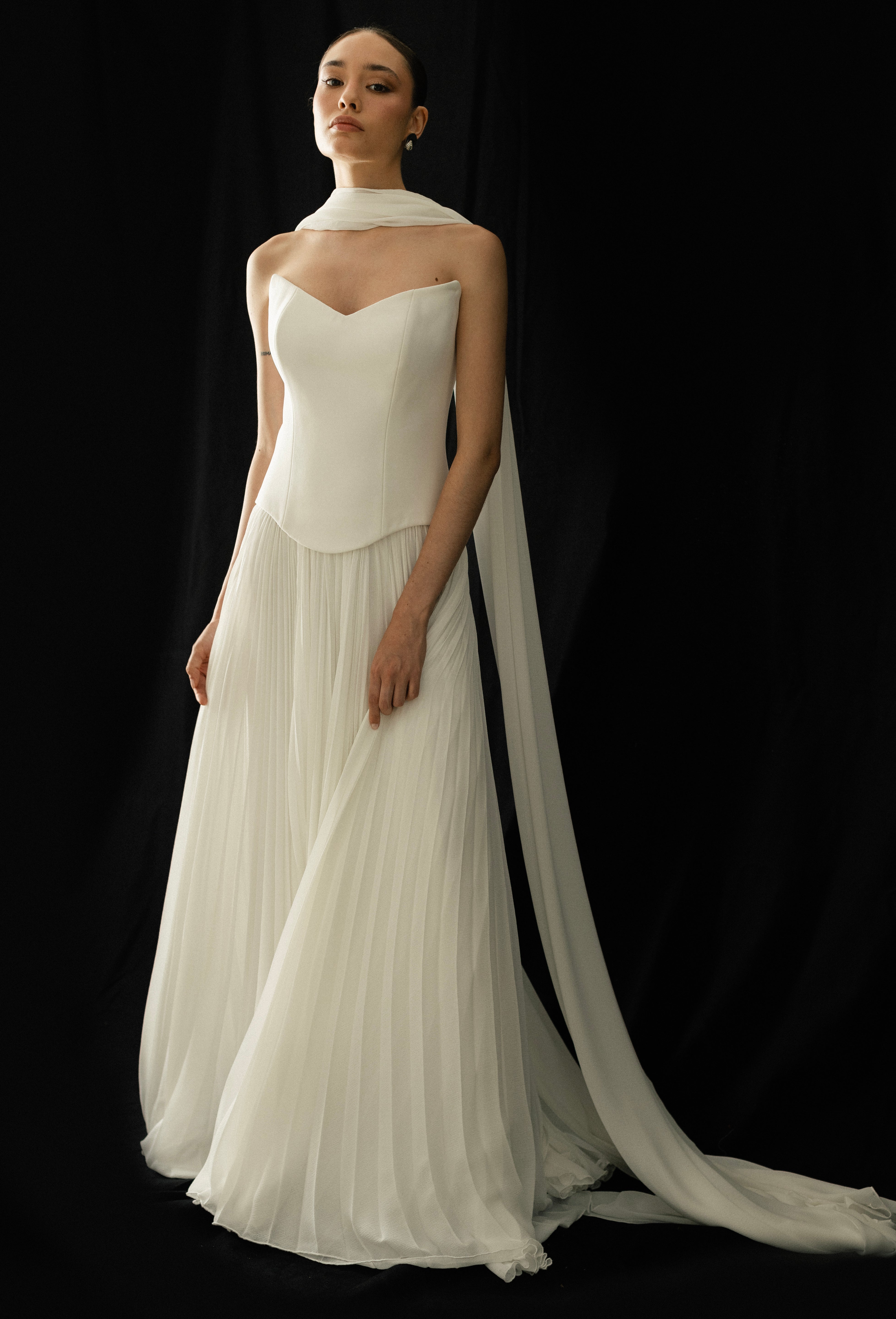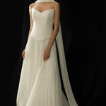 modern and geometric strapless neckline. The skirt features floor-length, flowing chiffon pleats, offering an elegant and fluid silhouette.