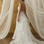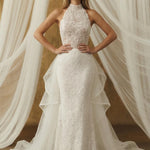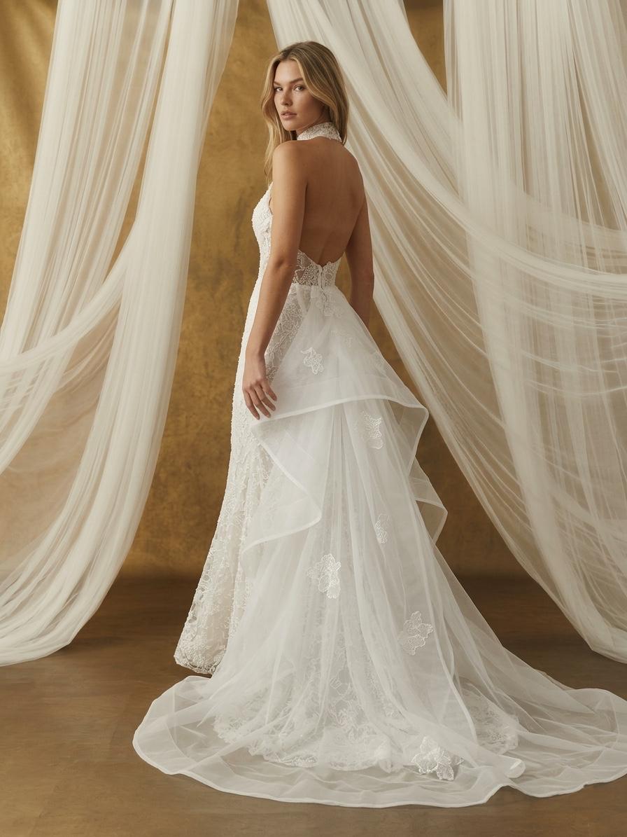 Halter yaka detayı, üst formu netleştirirken, dantelin geçirgen yapısı tasarıma