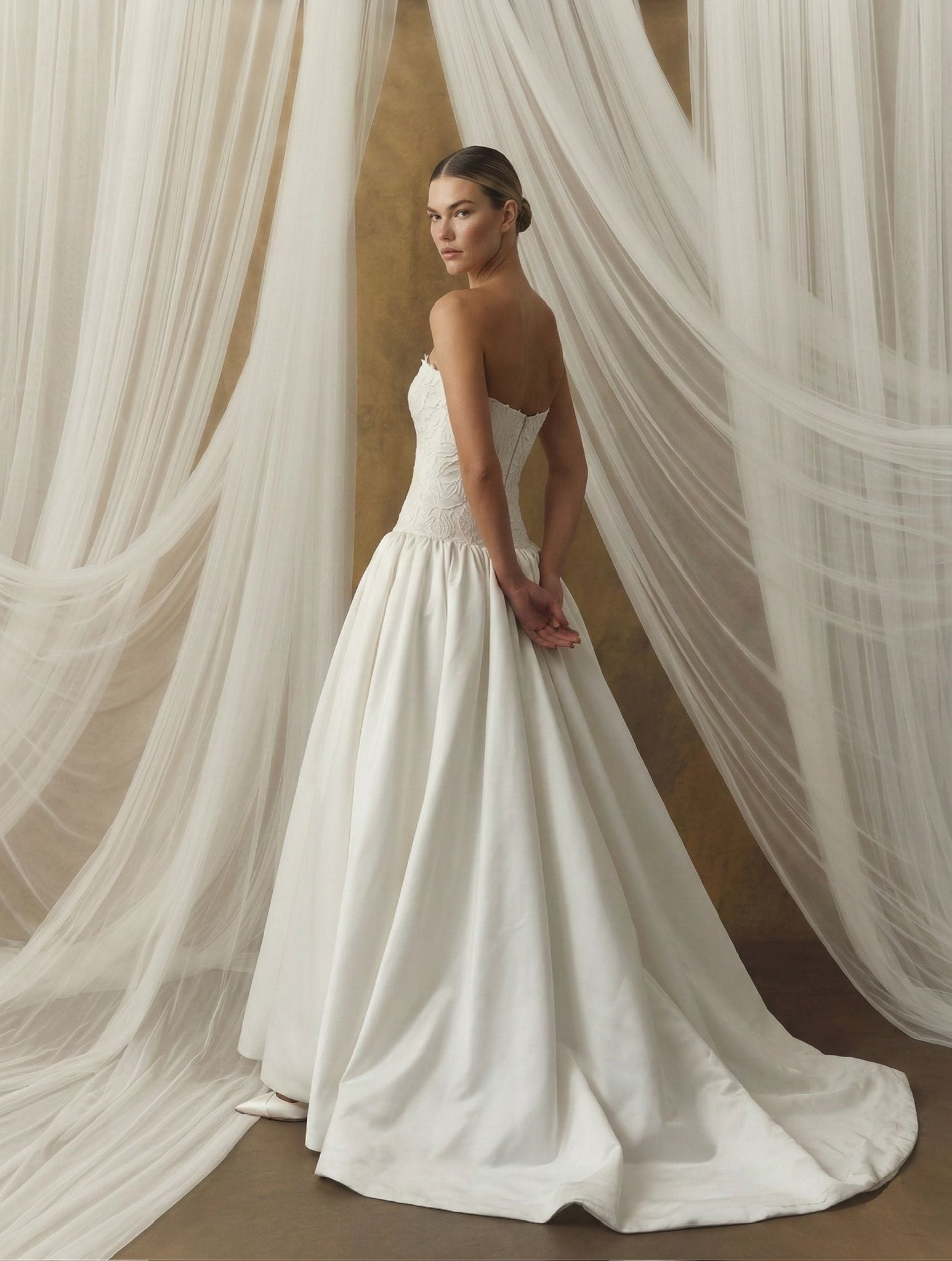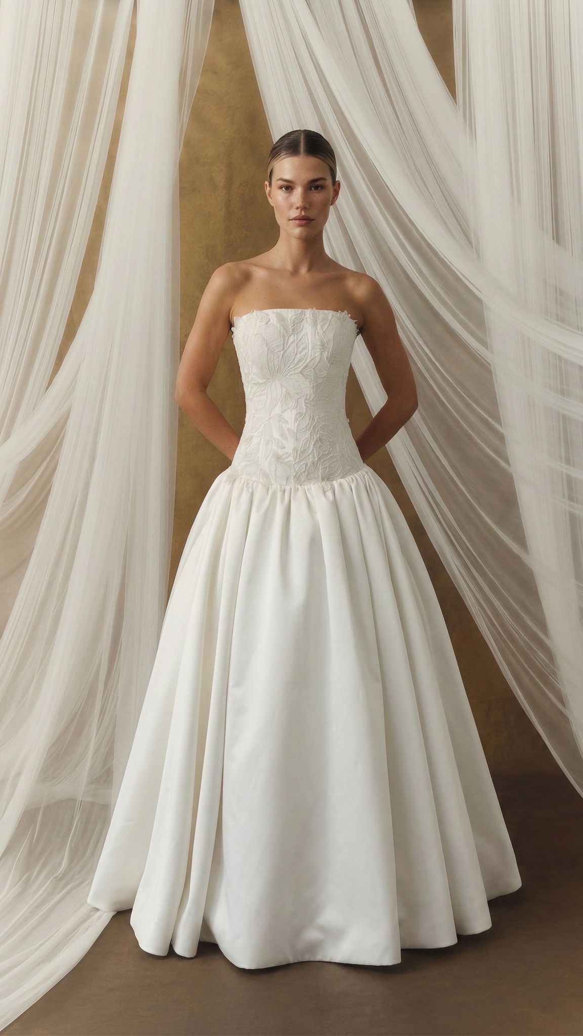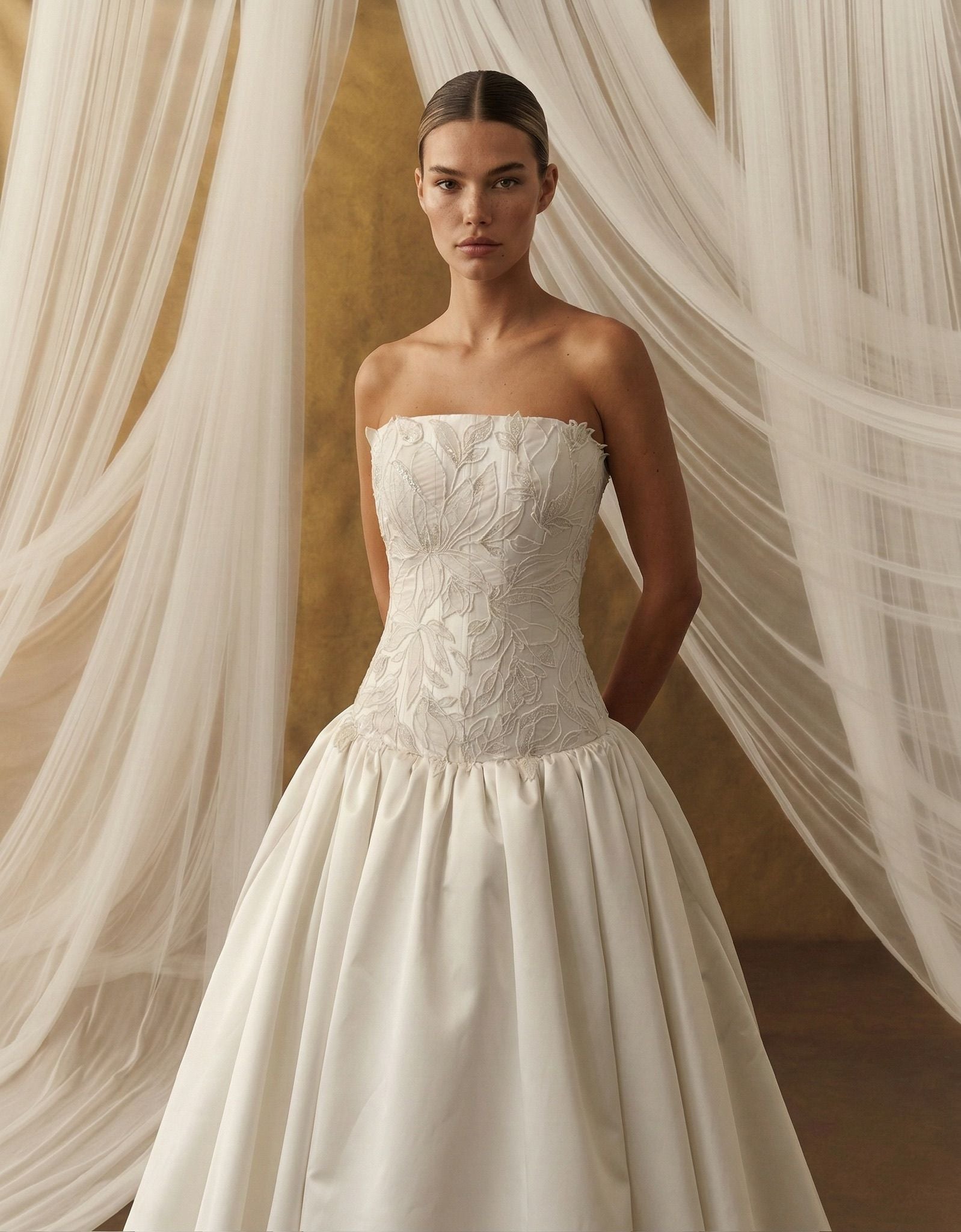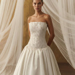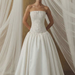 Büstiyer formundaki üst parça, dantel aplikelerle şekillendirilerek yüzeye zarif bir derinlik kazandırır.
