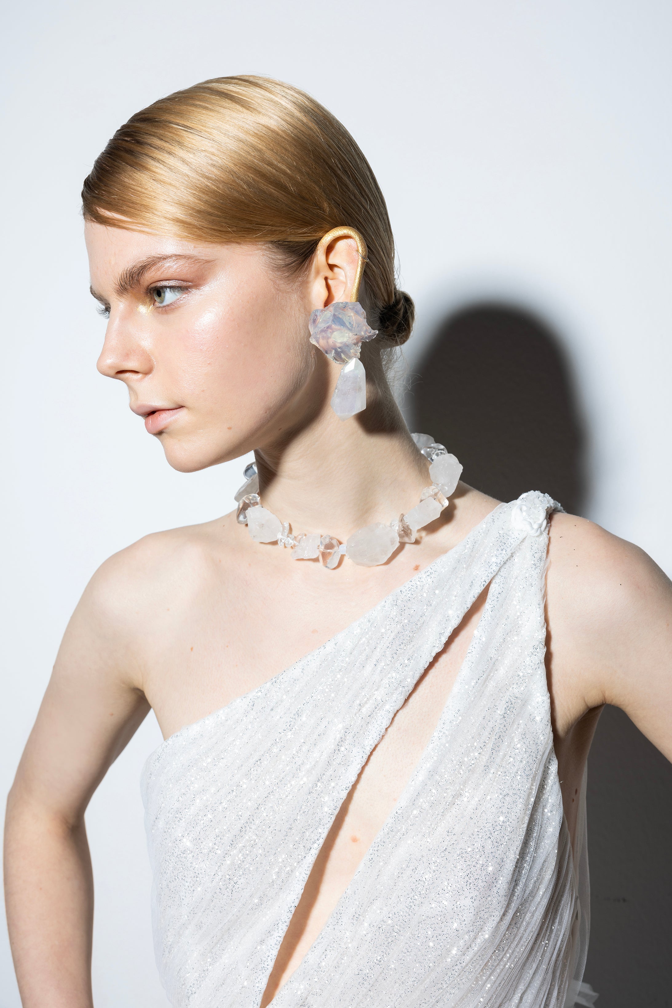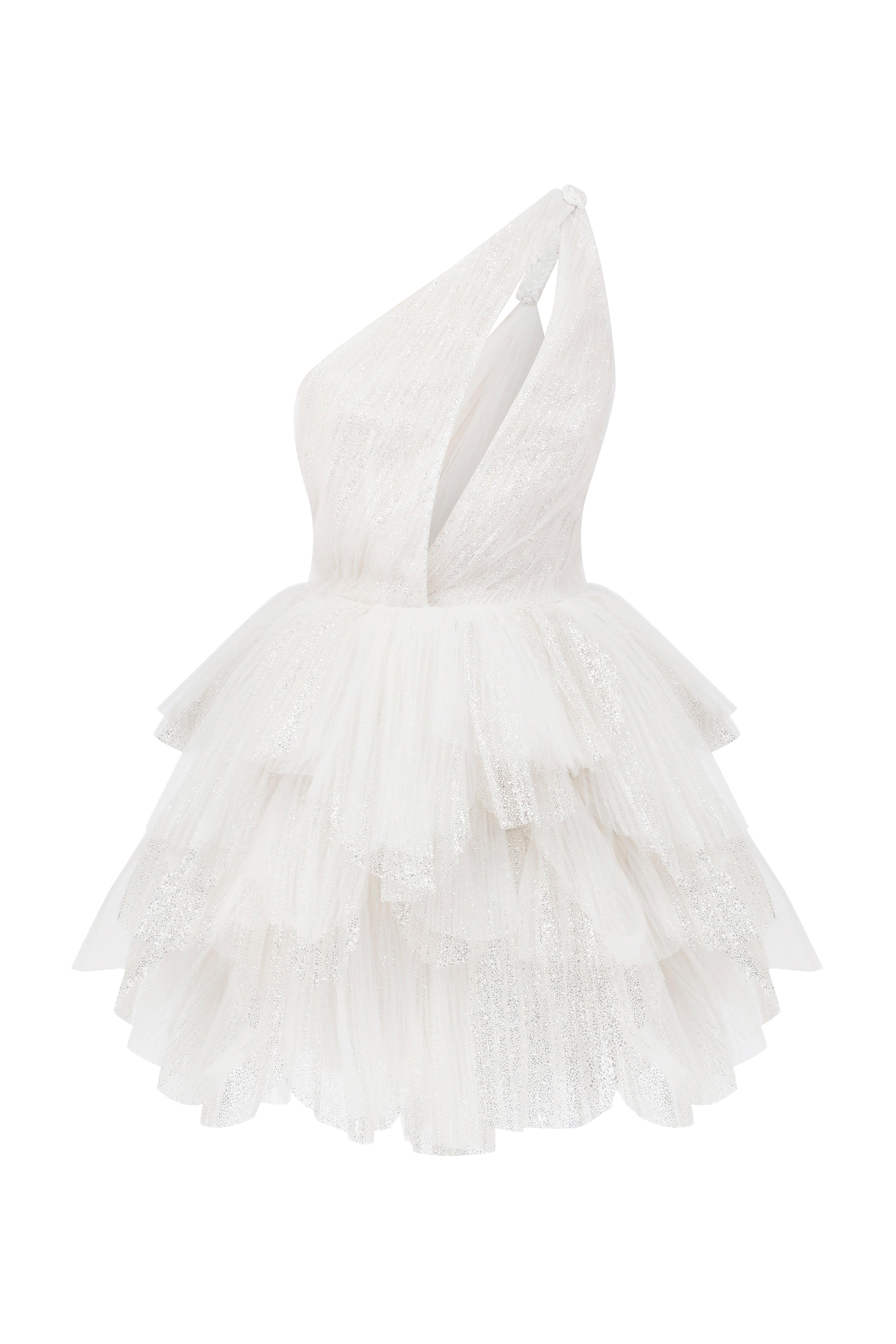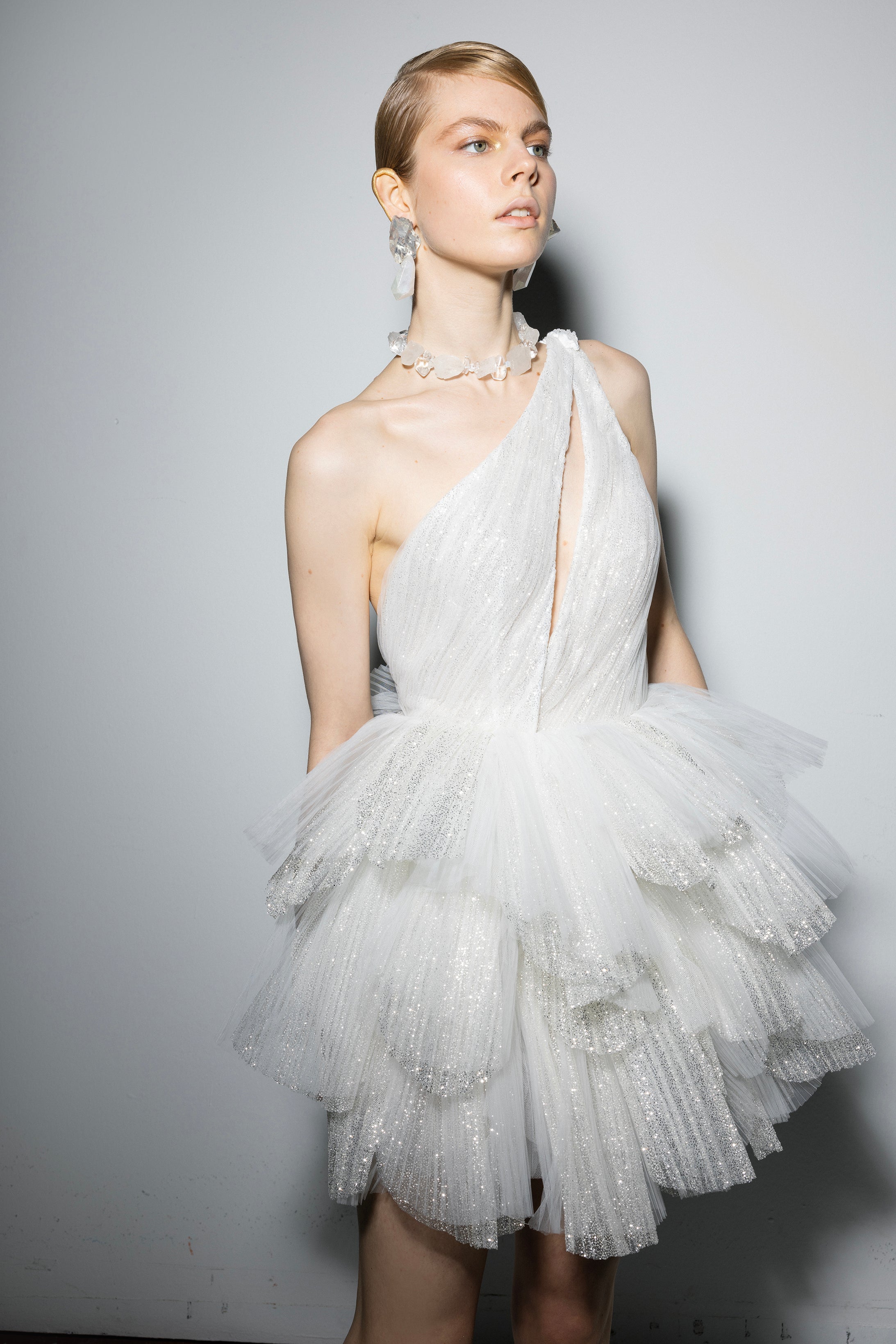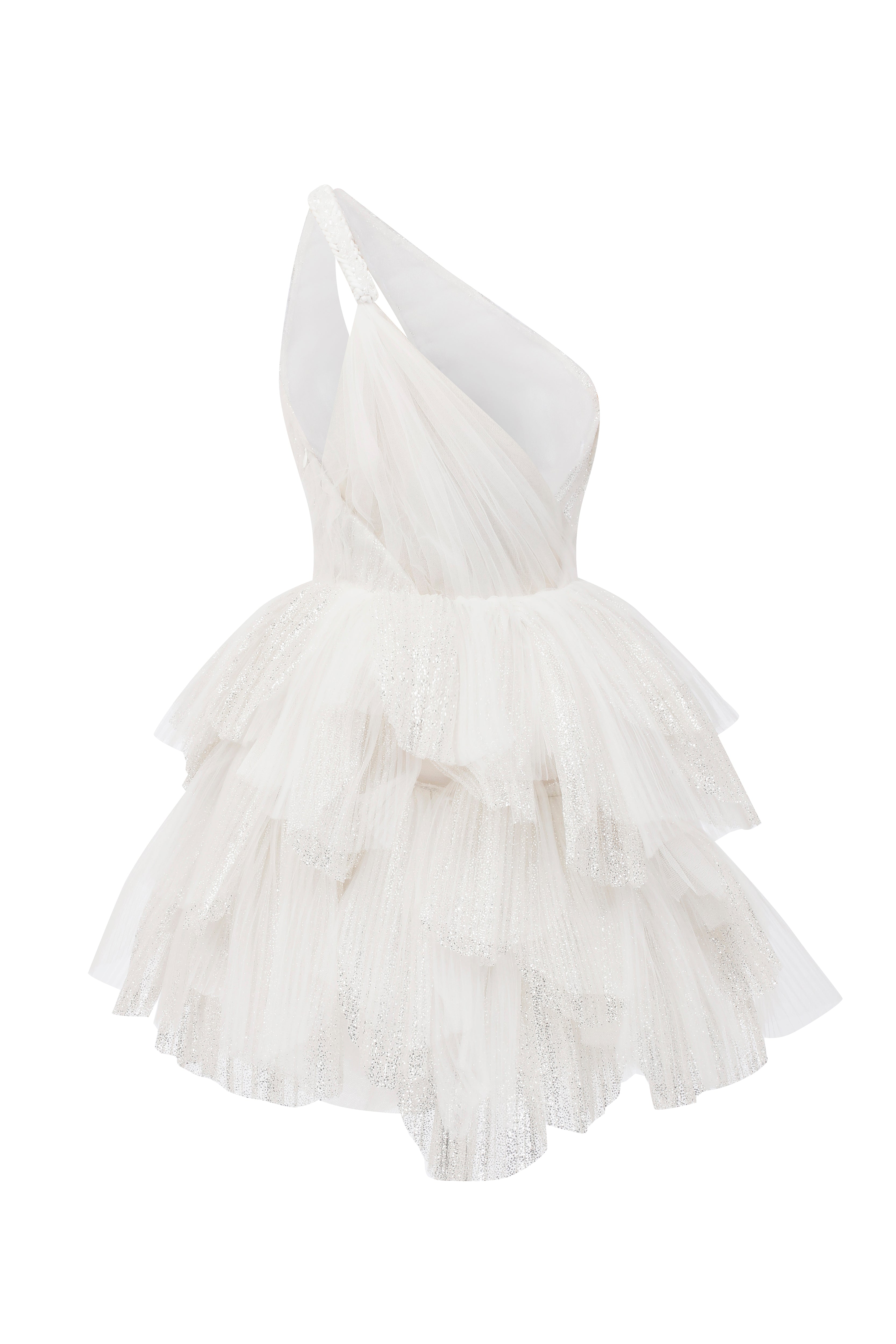 One shoulder shiny 3D pleated tulle dress with fully handmade crystal embellished details on the shoulder.