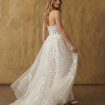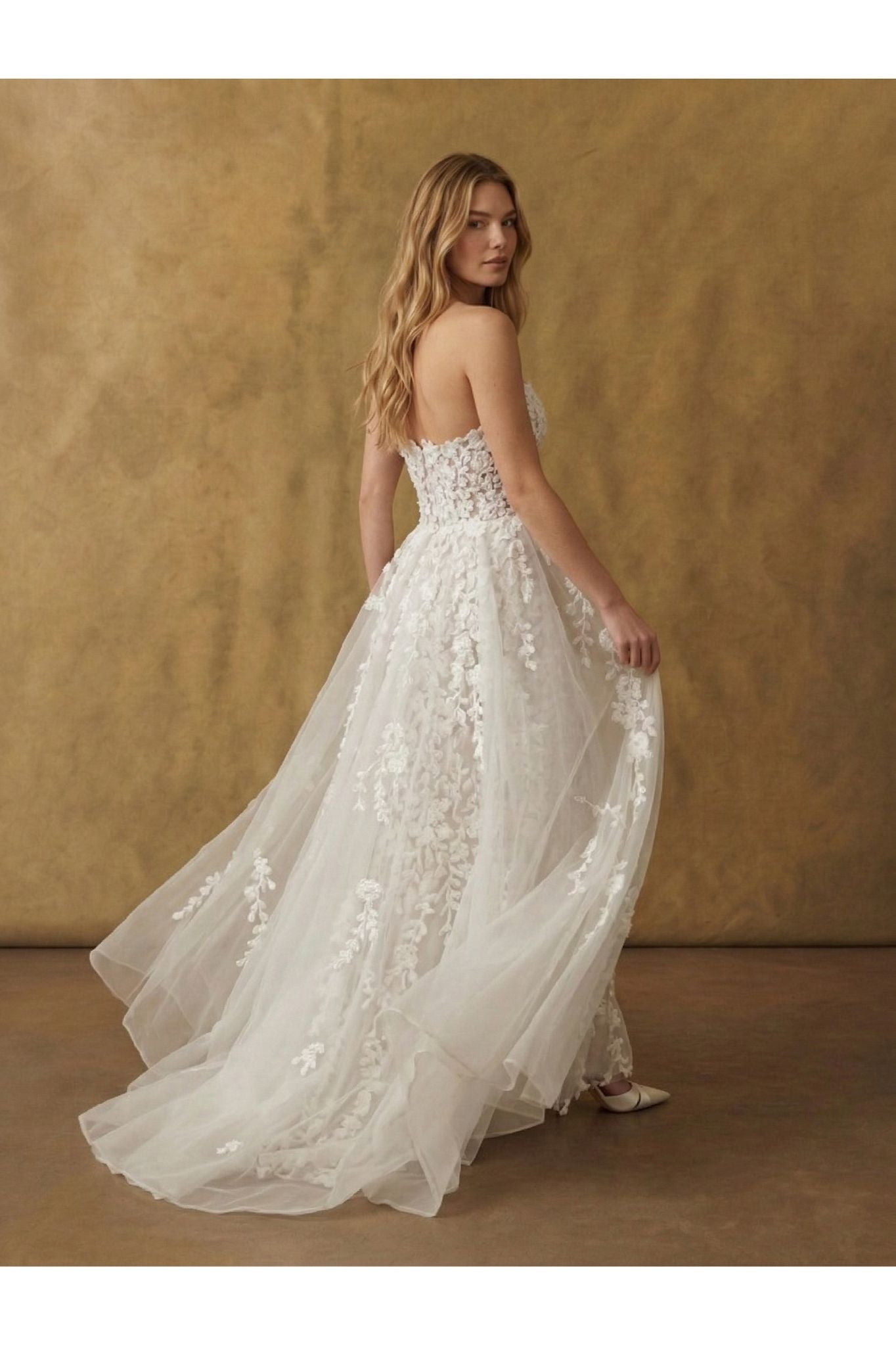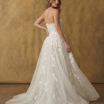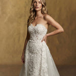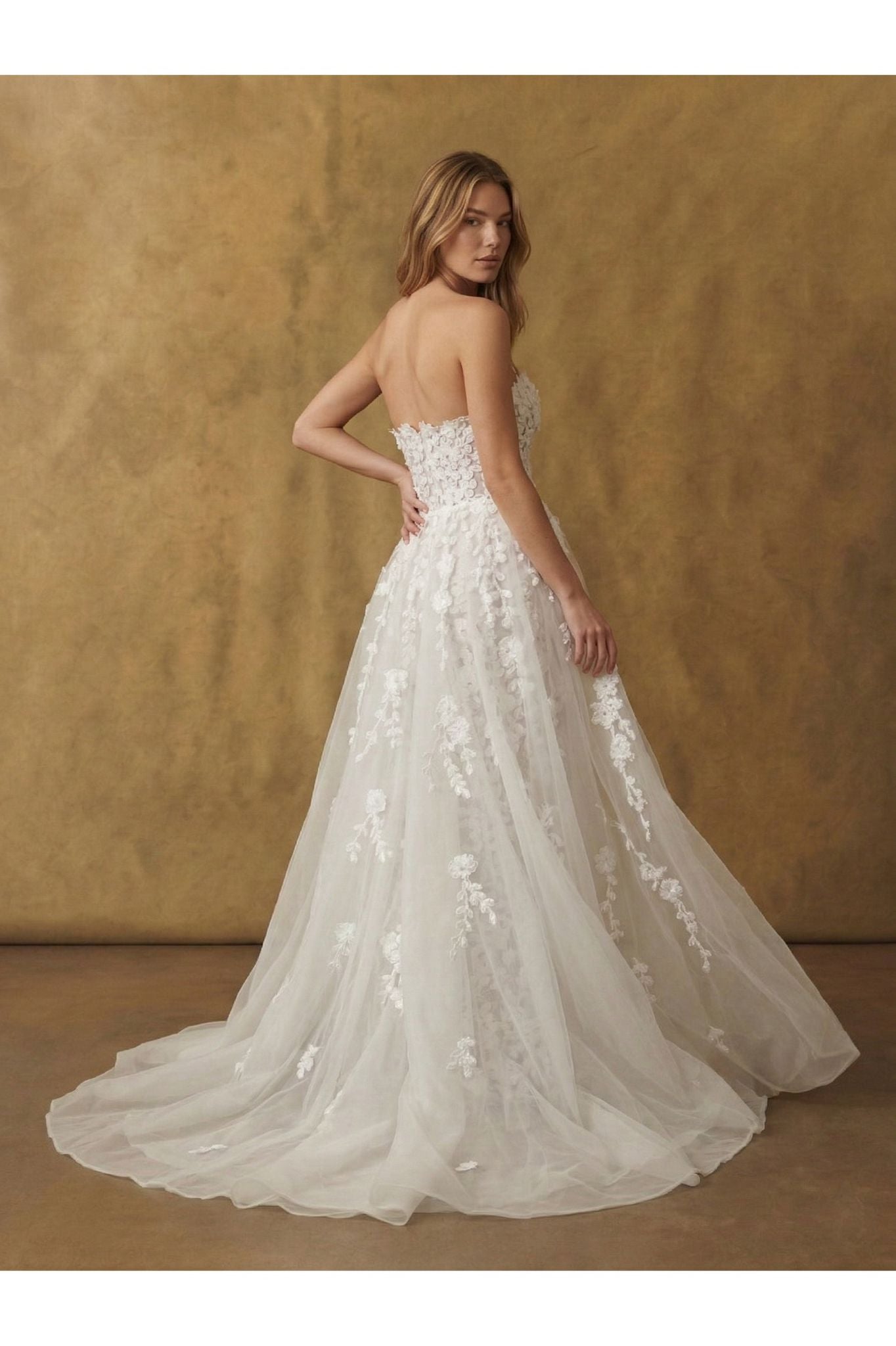 A strapless corset adorned with dimensional floral appliqués meets a sculpted