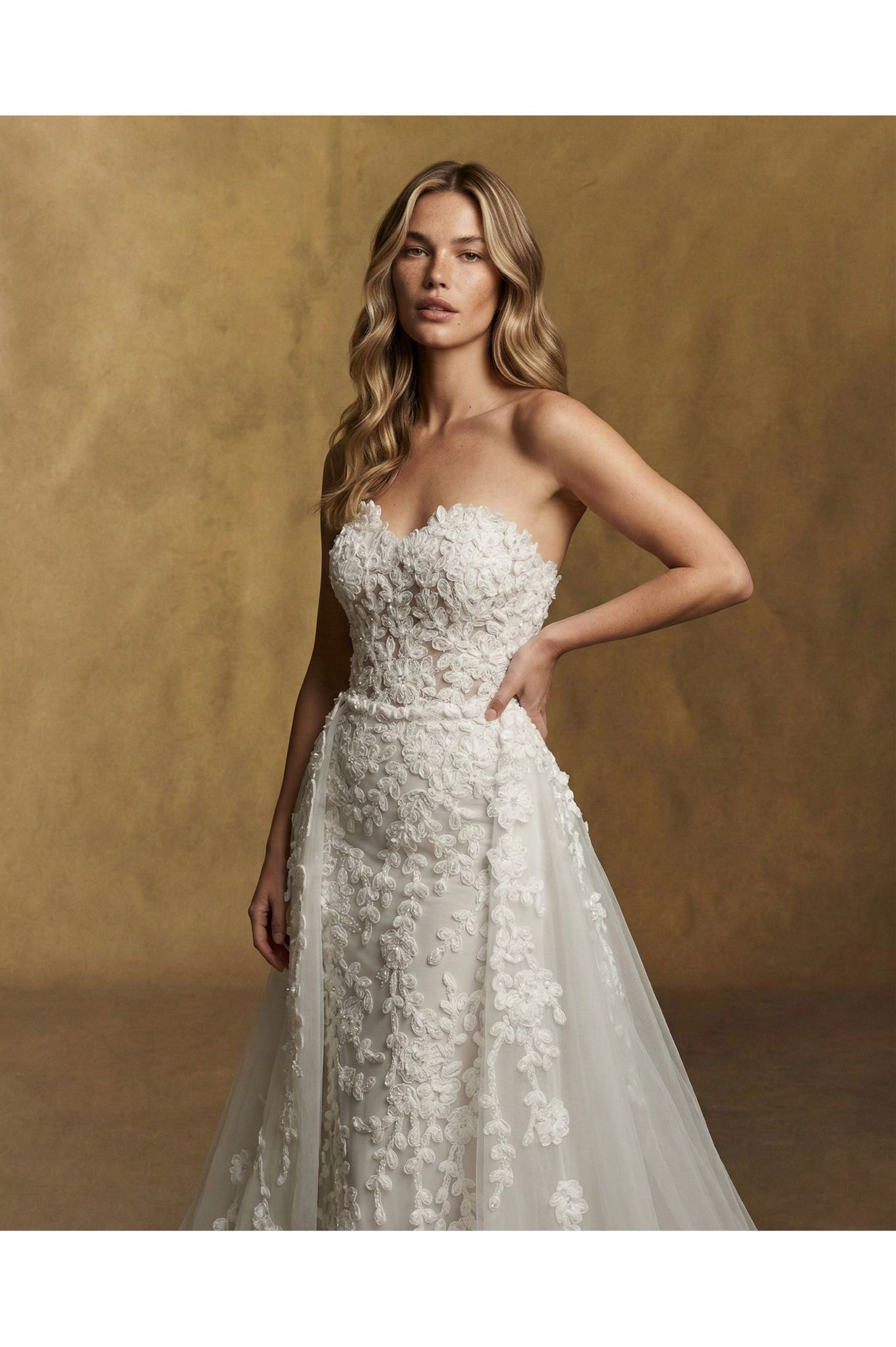 Romantic yet modern, this design offers a layered bridal expression with a