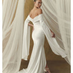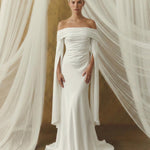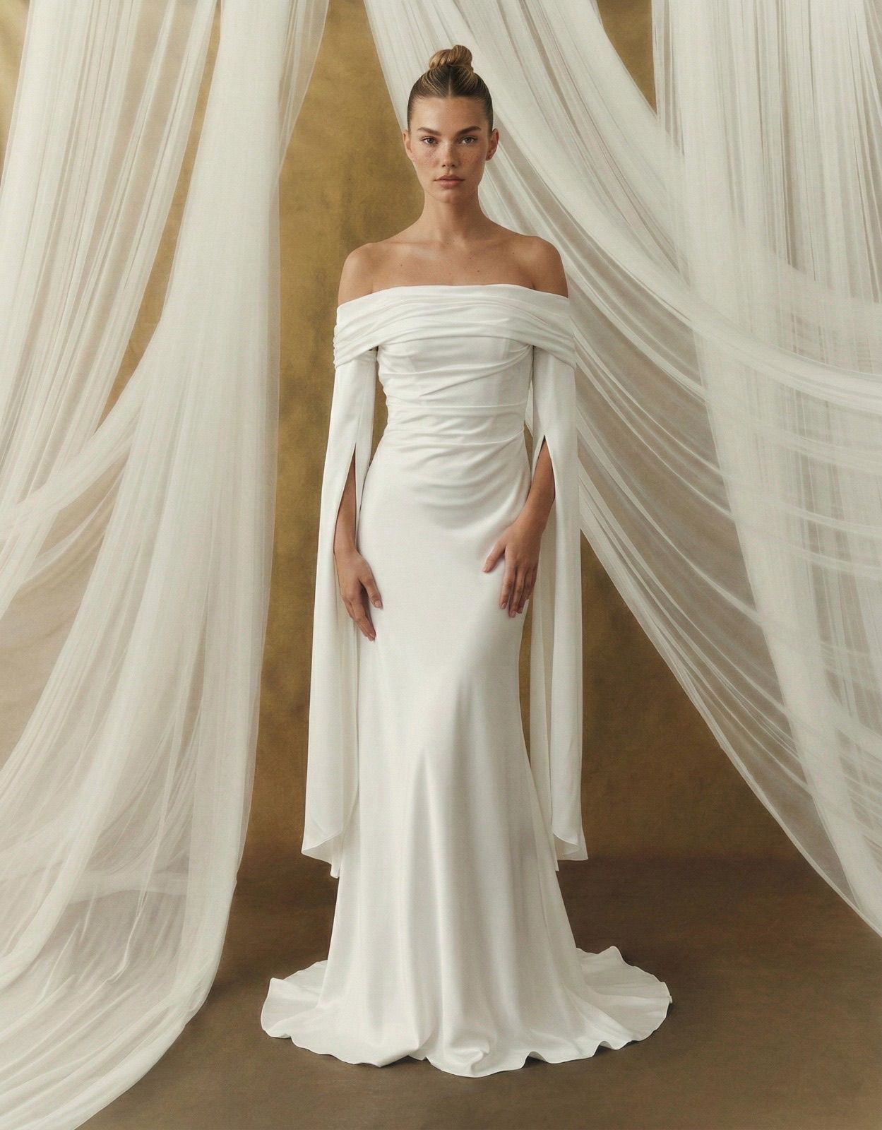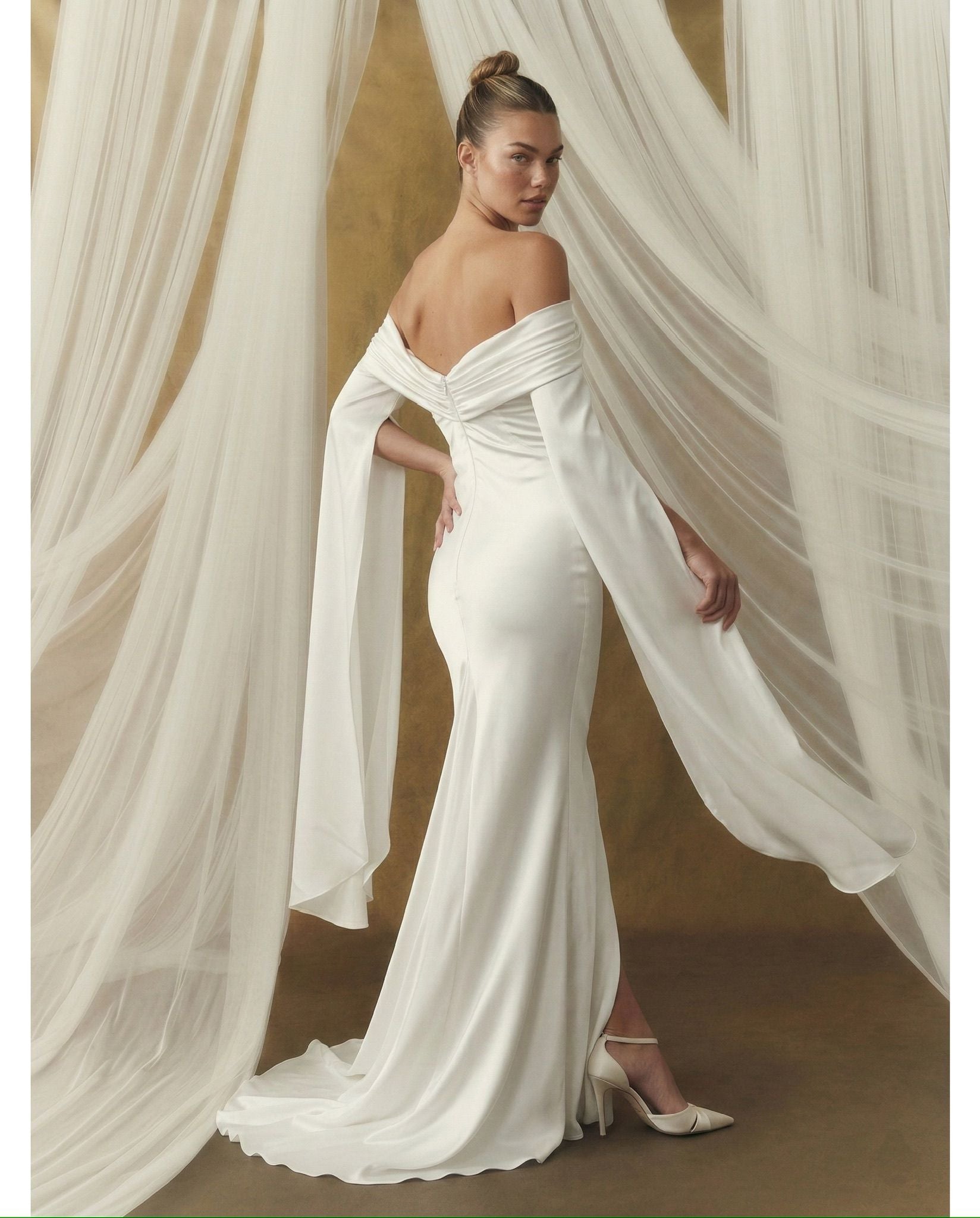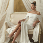 Krep ipeksi satenin akışkan dokusu, vücudu yumuşakça sararken; düşük omuz