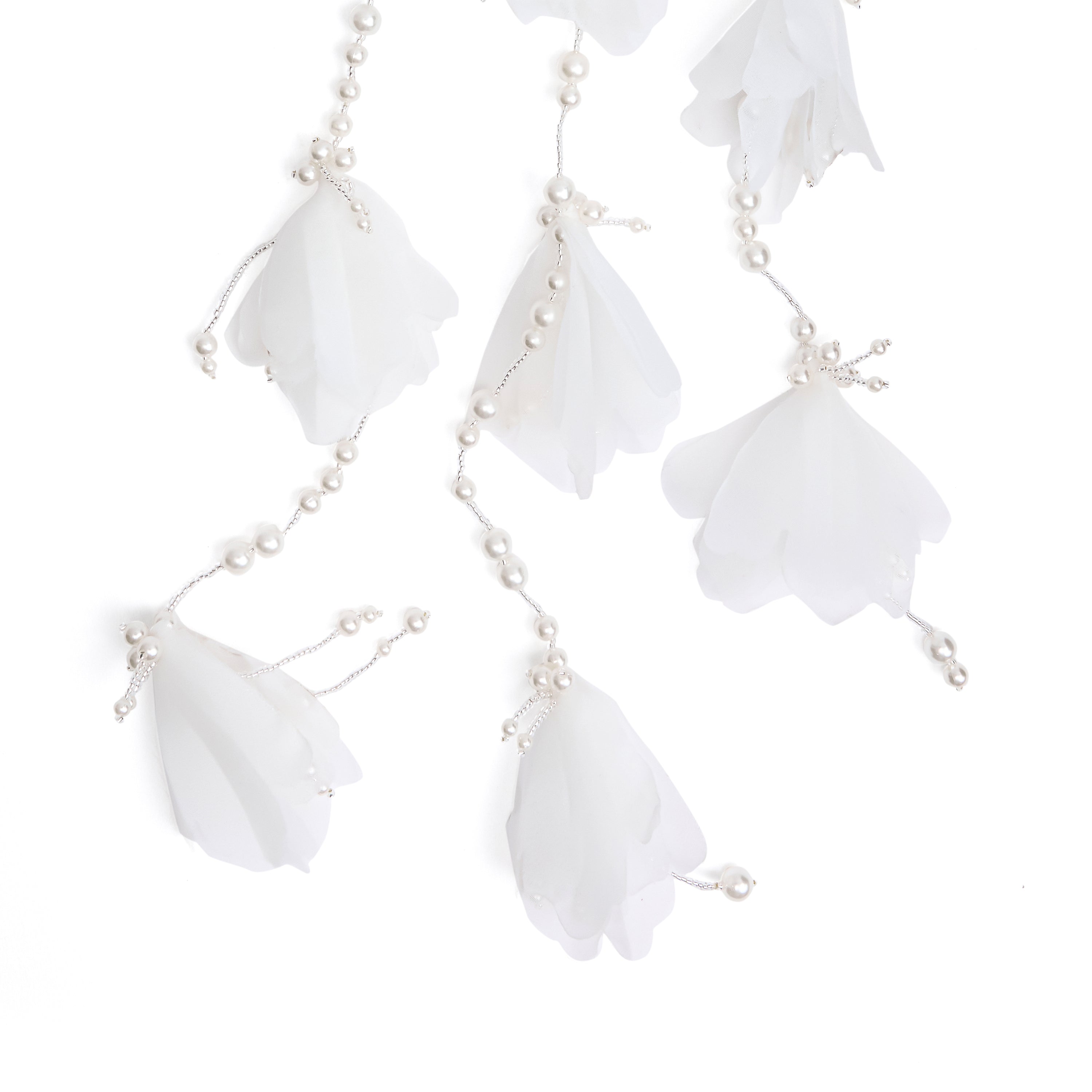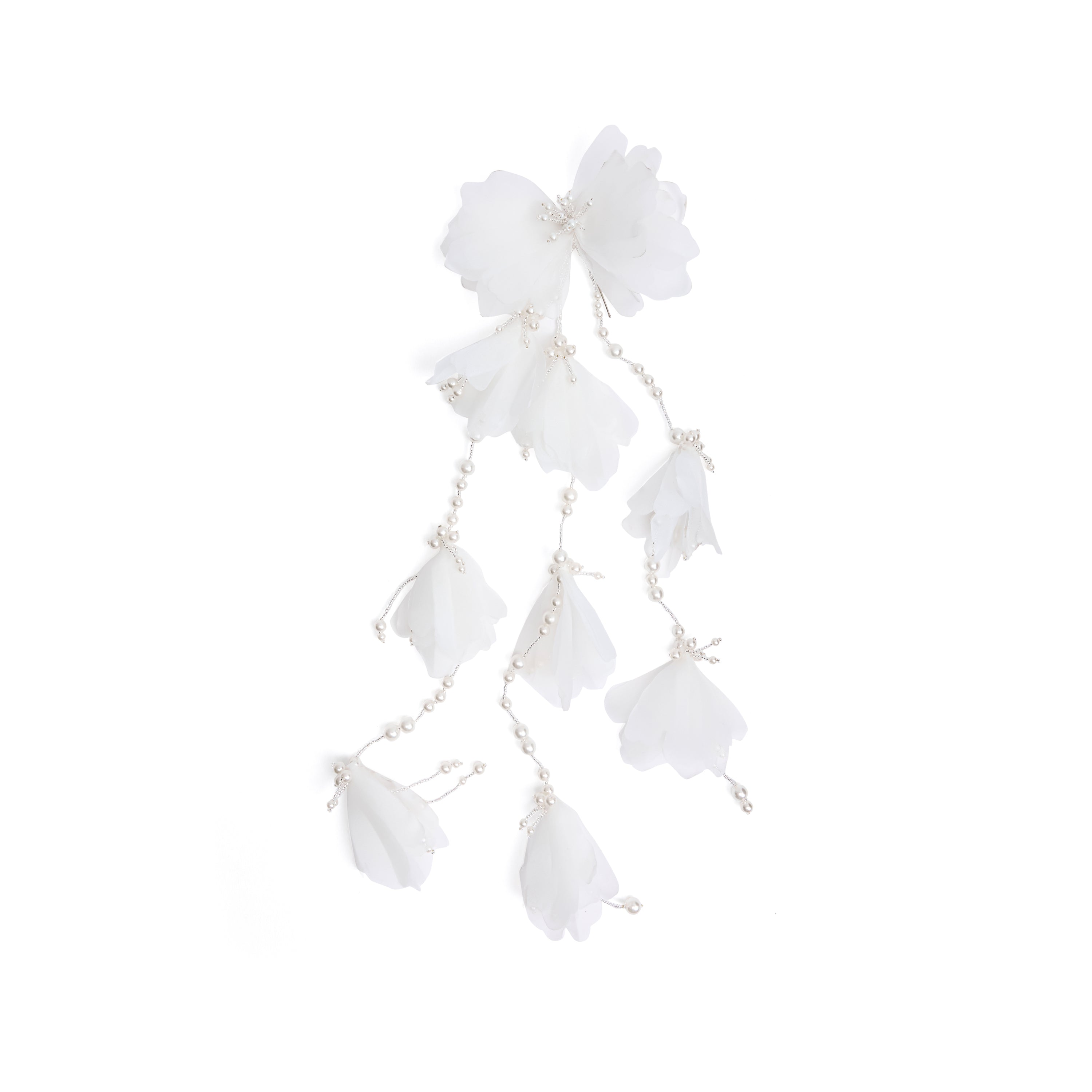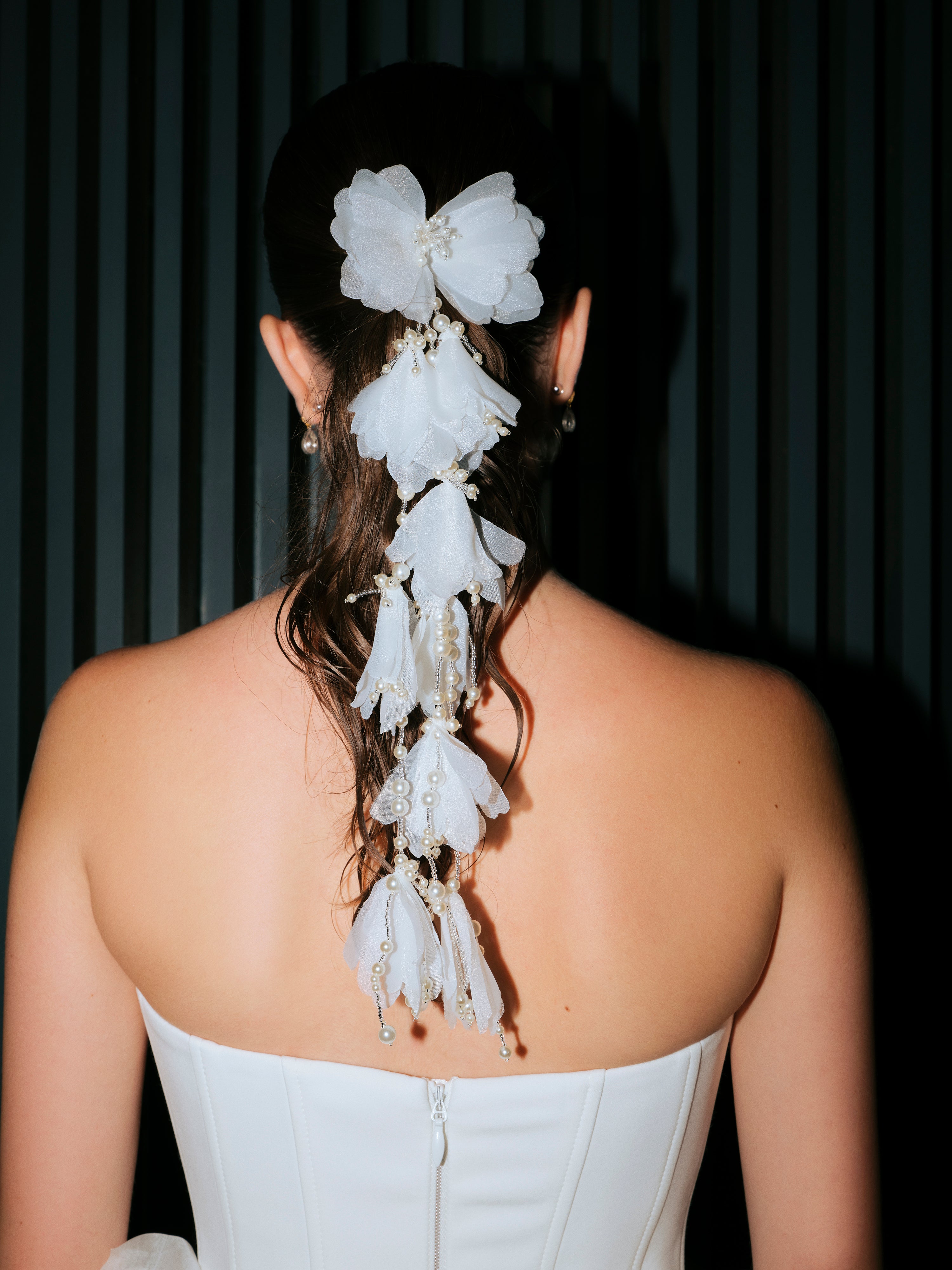 A dreamlike cascade of sheer petals and soft pearls, the Nyx Bloom whispers of midnight blossoms and moonlit reveries. Each bloom is hand-layered, creating a suspended floral illusion made to enchant.