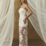 Straplez silüet vücudu zarifçe sararken, transparan etek katmanı hafiflik ve