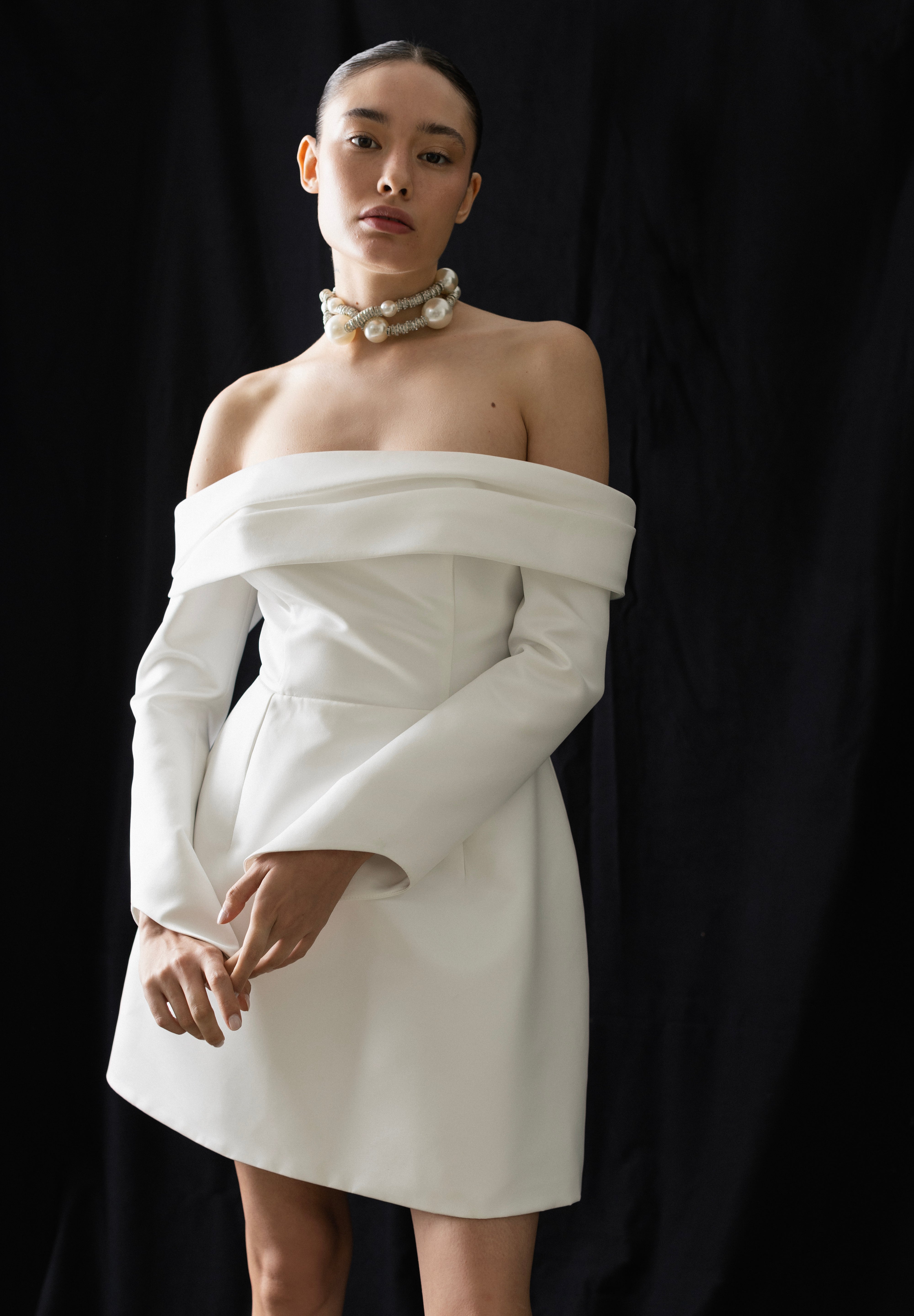 A mini dress made from thick matte satin with an off-the-shoulder design and structured silhouette. The draped details and corseted construction give the dress a modern, form-fitting shape.