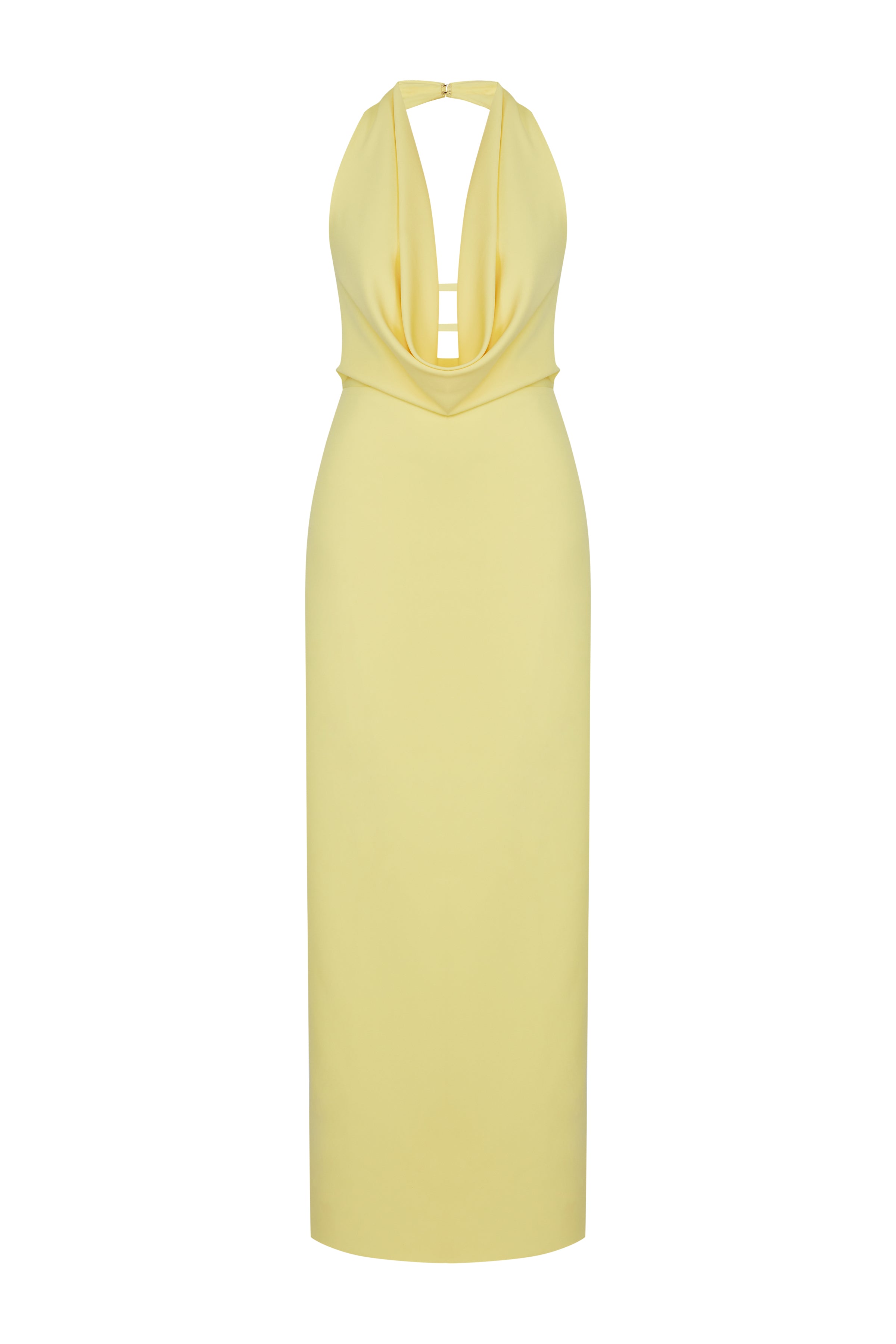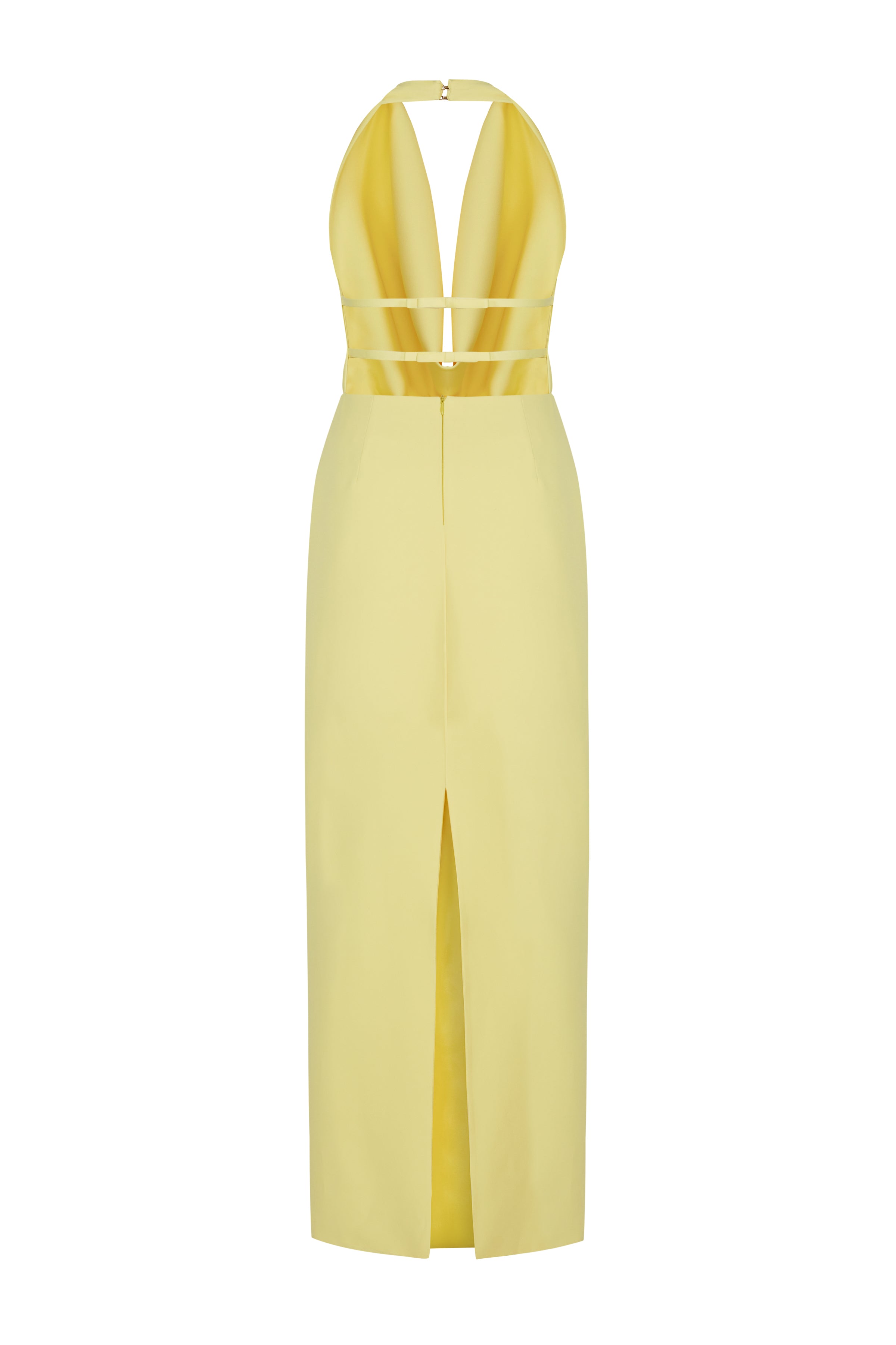 The front of the dress showcases a sleek, draped neckline that adds a touch of modern femininity, while the back reveals delicate strappy details adorned with small bows, offering a hint of playful allure. The form-fitting skirt accentuates your curves, and the high slit at the back ensures ease of movement and adds a touch of drama to your stride.