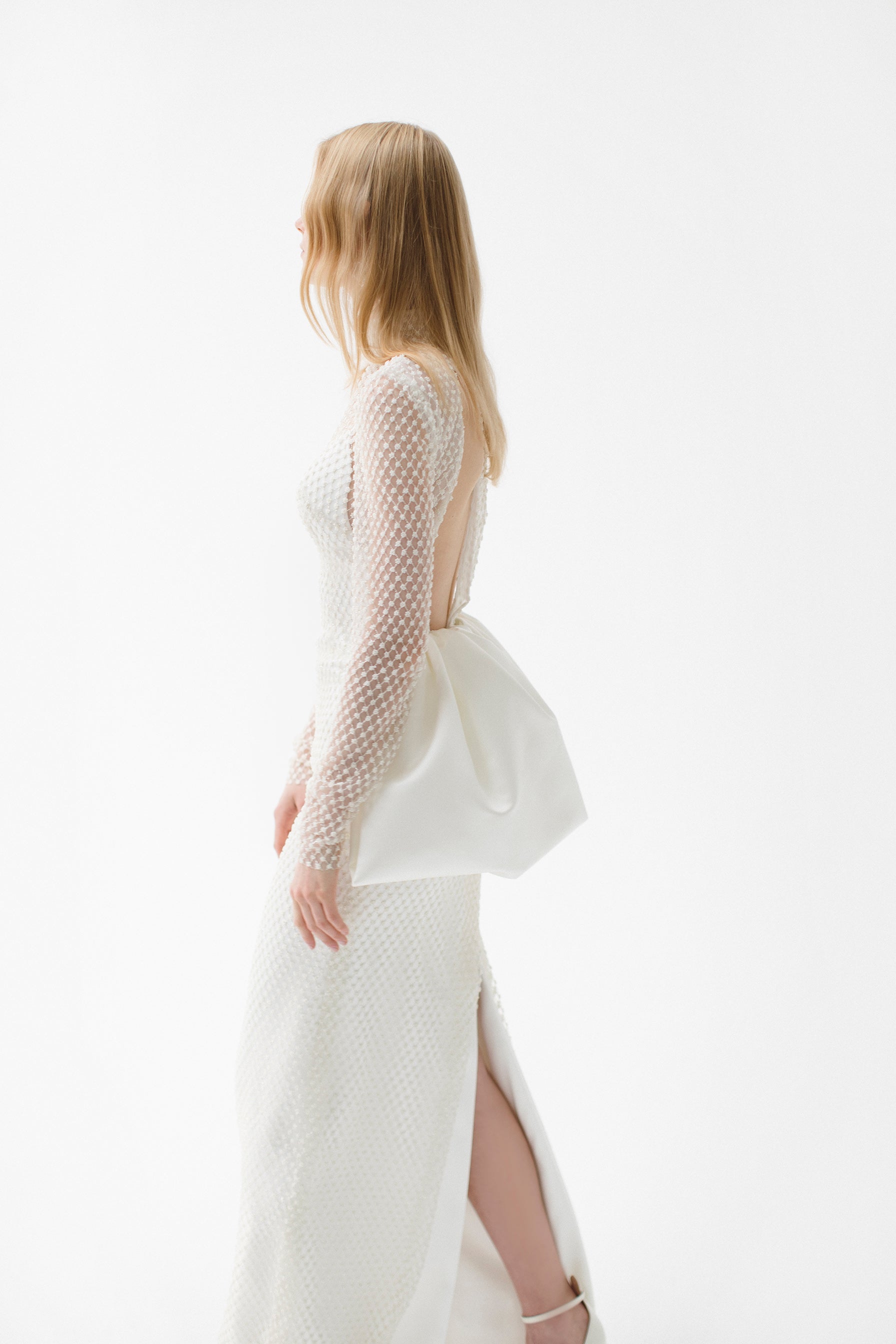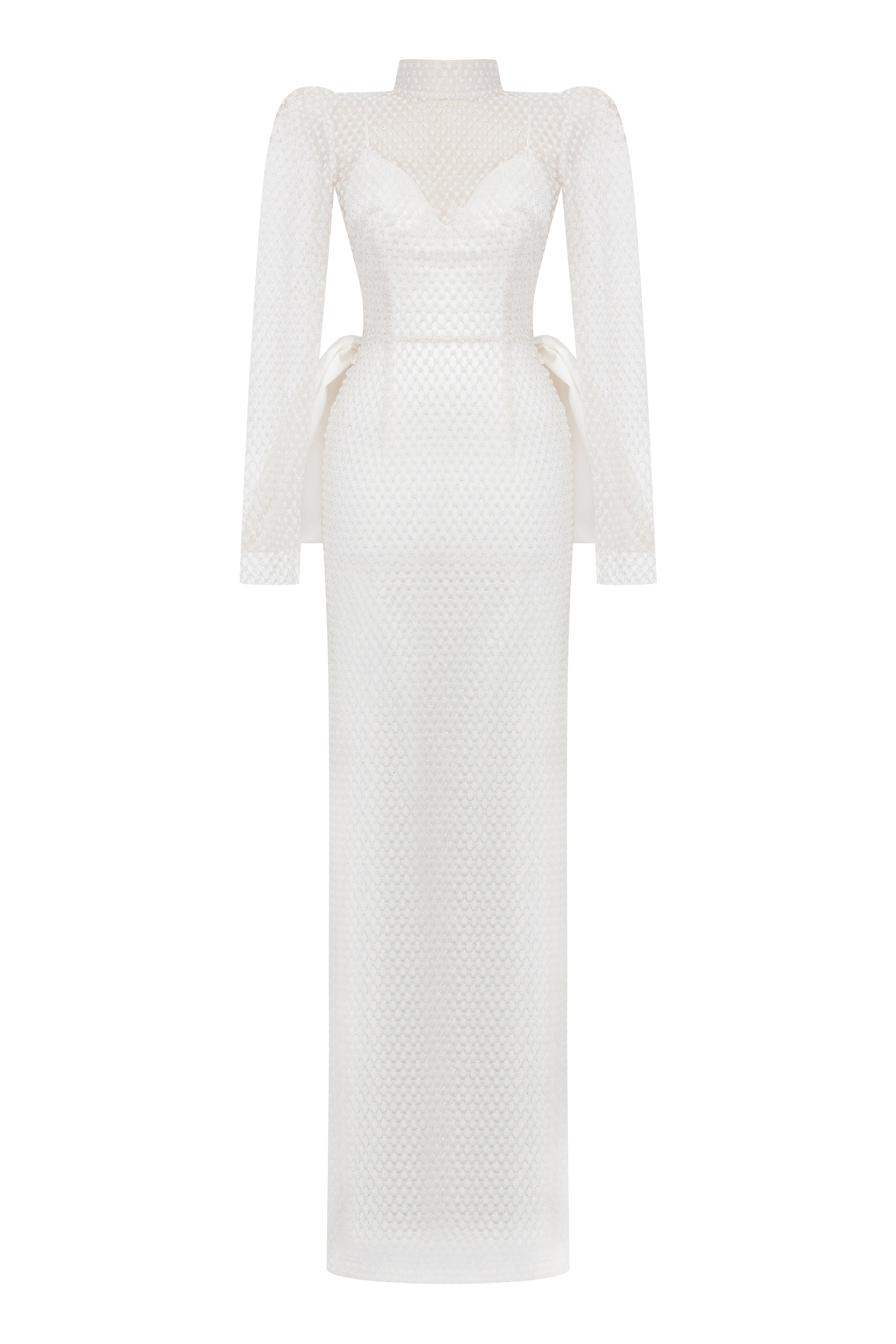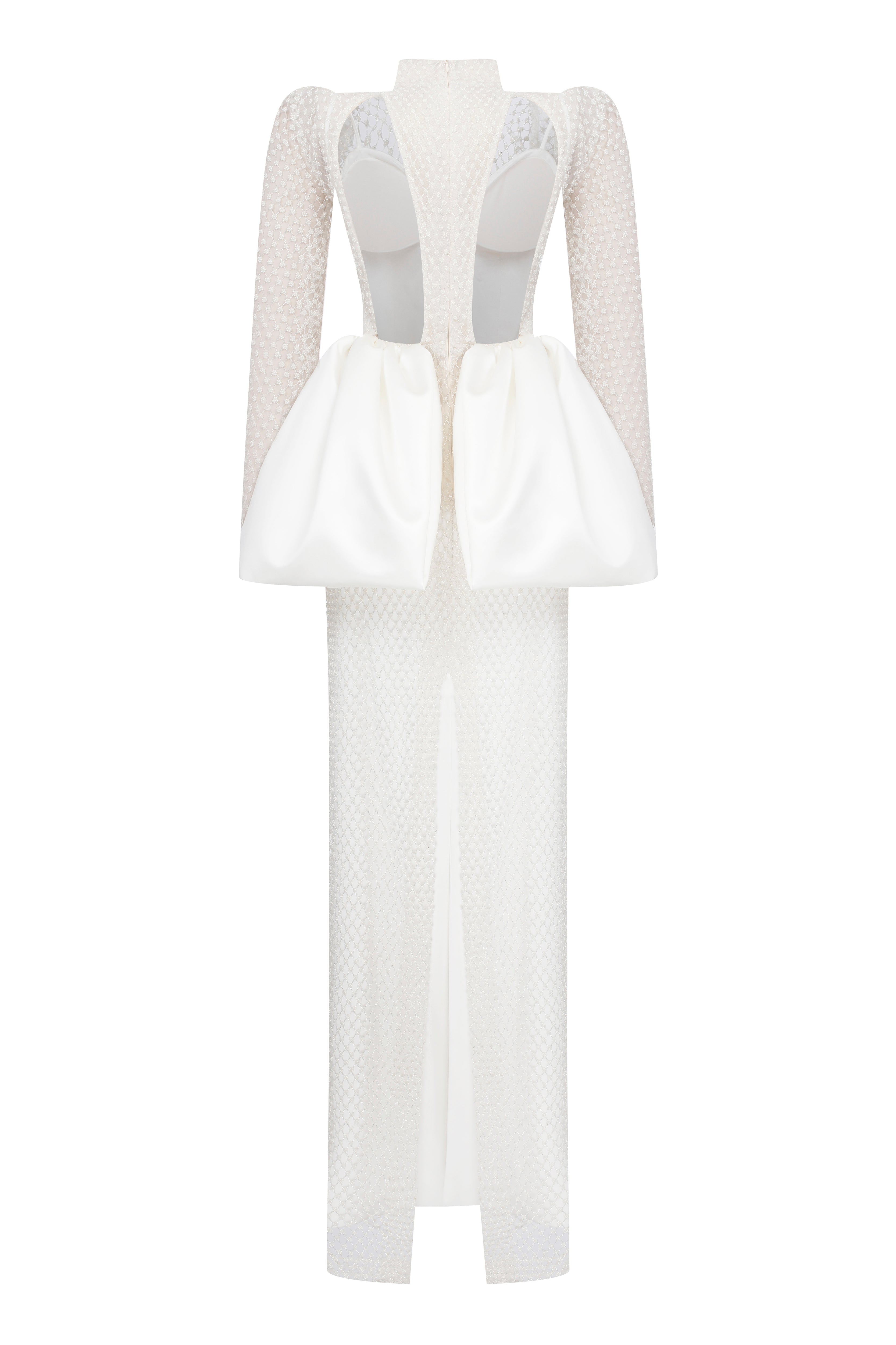 Long sleeves dress with high neck and open back with its satin bows. There is a slip satin dress underneath that can be worn separately.