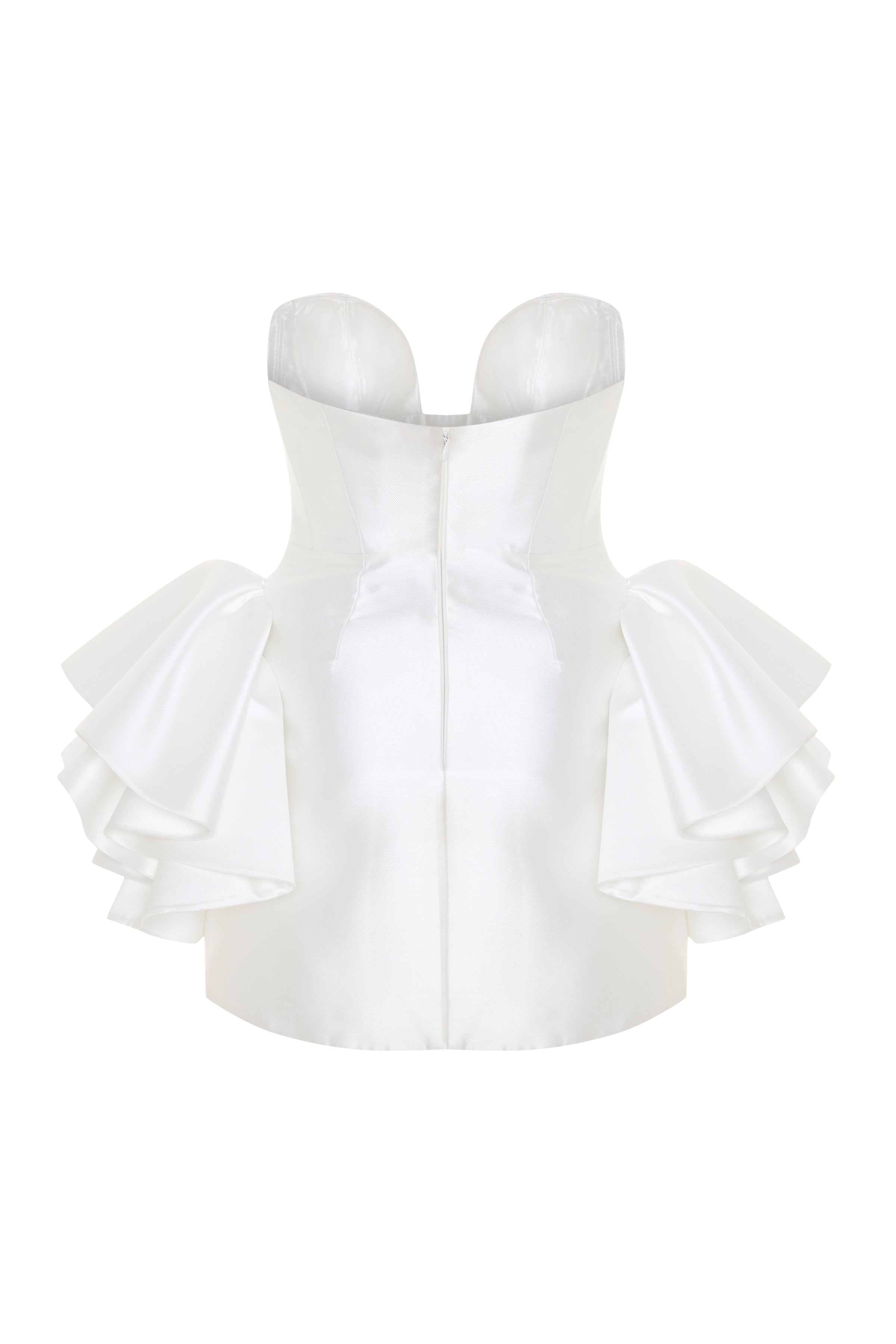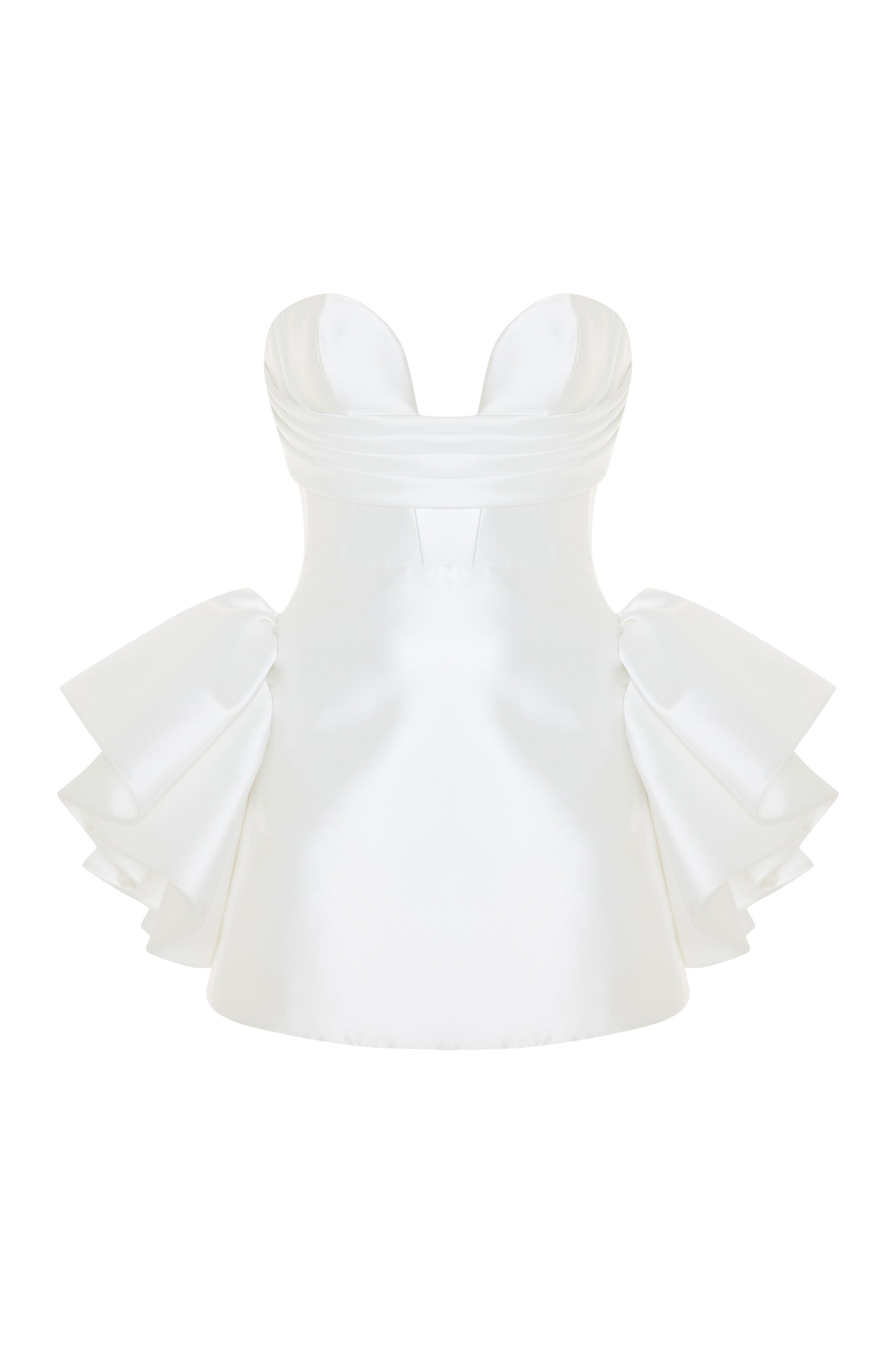 Crafted from luxurious mikado fabric, the SONATA bustier blends architectural volume with feminine poise. Featuring sculptural side flounces and a structured strapless neckline, this piece is both commanding and refined.