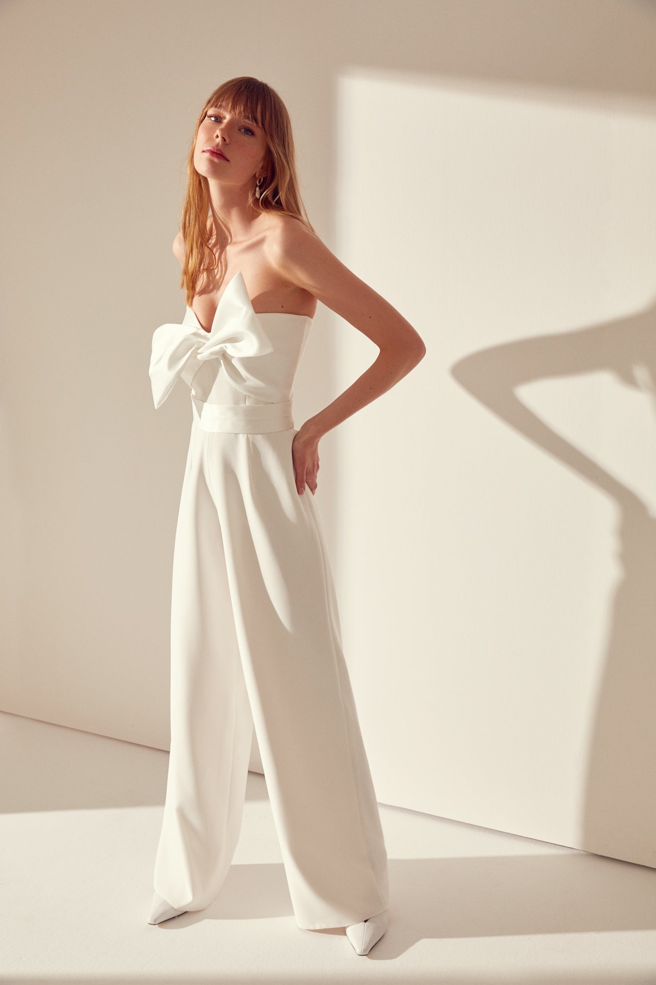 Let the bow do the talking on your big day! The rise of the bridal jumpsuit has been epic, and now wearing pants doesn't mean you have to sacrifice a dramatic bow. The top is made of high quality Mikado fabric and the pants are made of Italian crepe.
