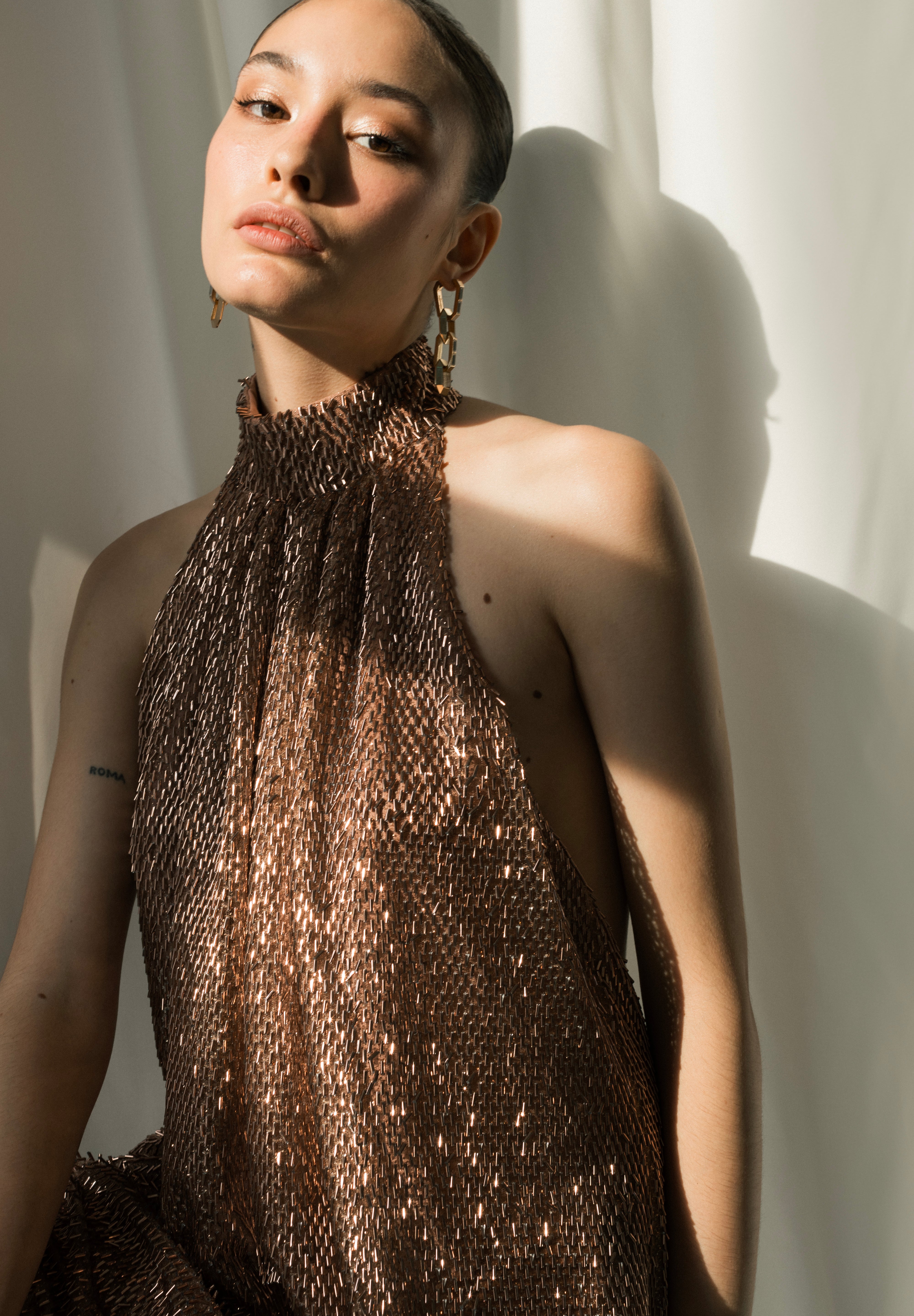 Tura is crafted from a lightly sheer fabric with intricate beading, featuring a halter neck design that accentuates the neckline. The mini-length cut and clean lines offer a simple yet striking look