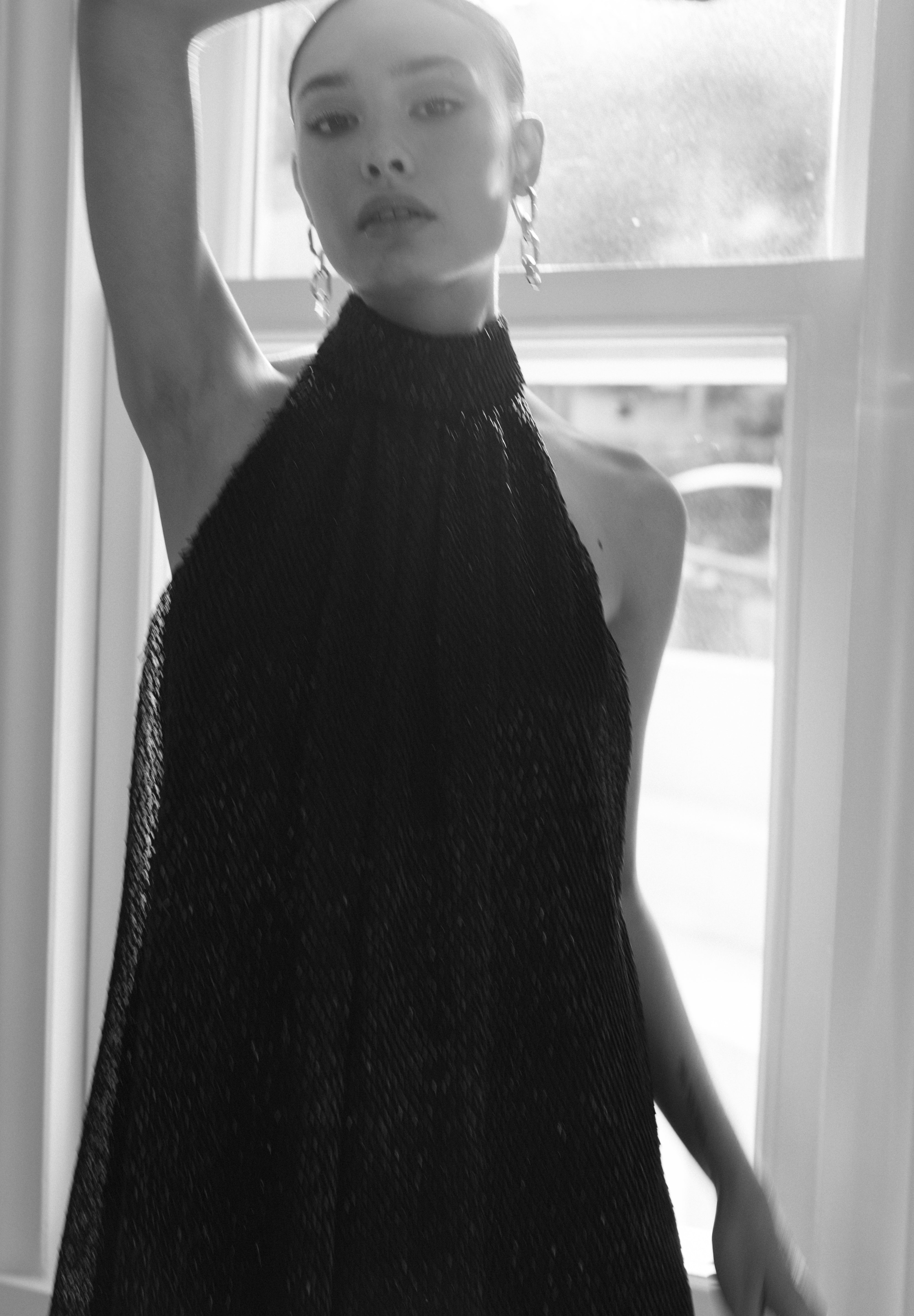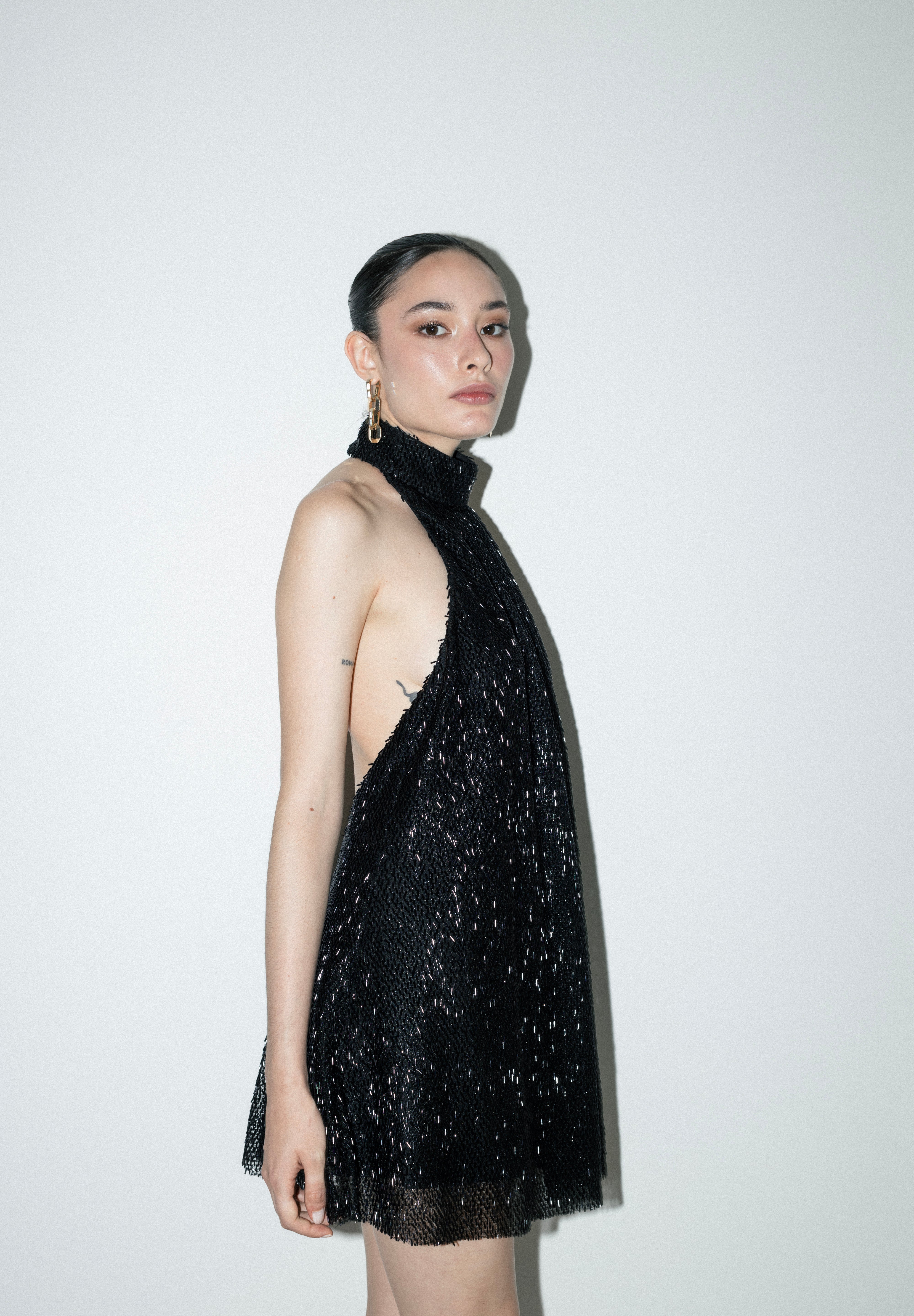 Tura is crafted from a lightly sheer fabric with intricate beading, featuring a halter neck design that accentuates the neckline. The mini-length cut and clean lines offer a simple yet striking look.