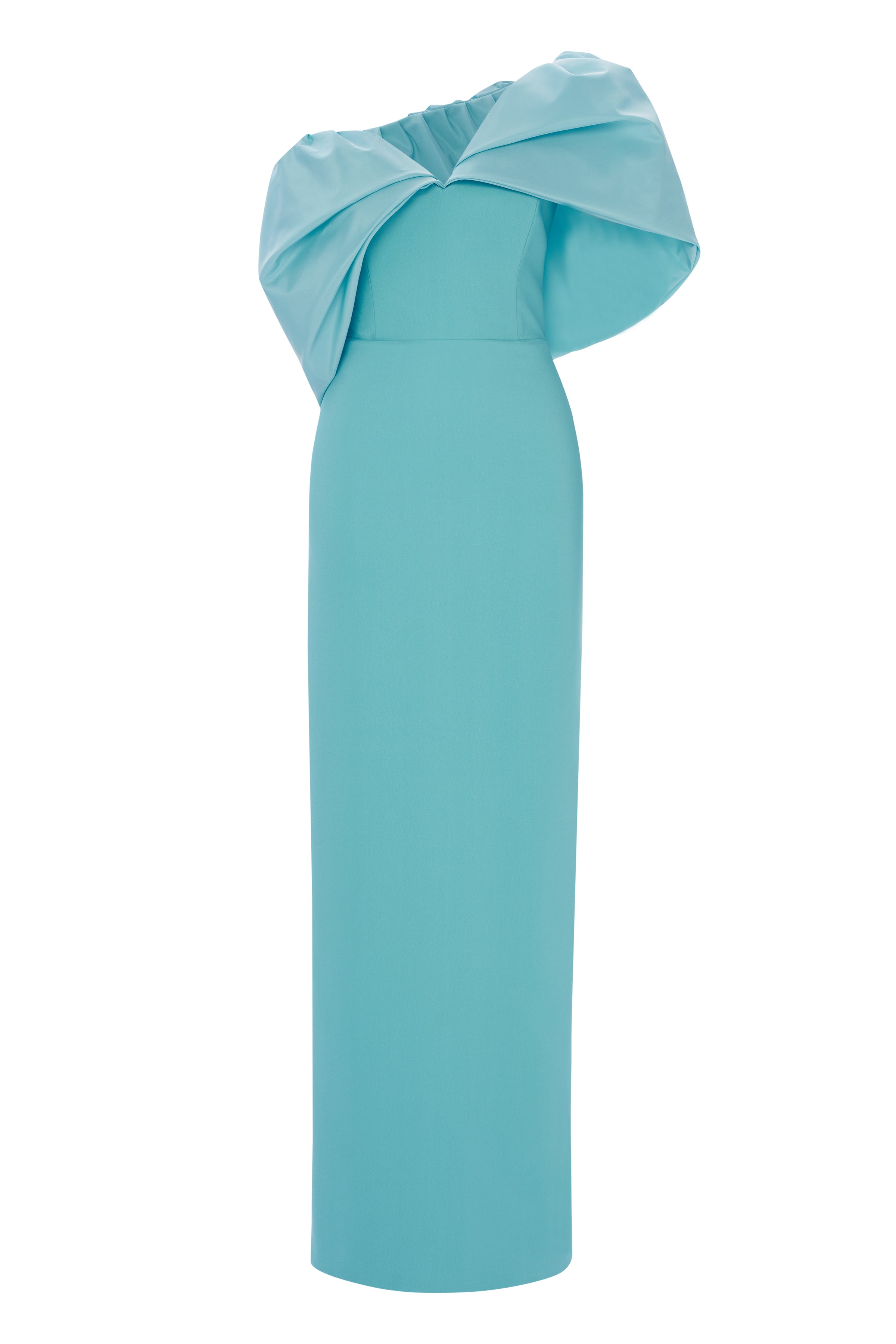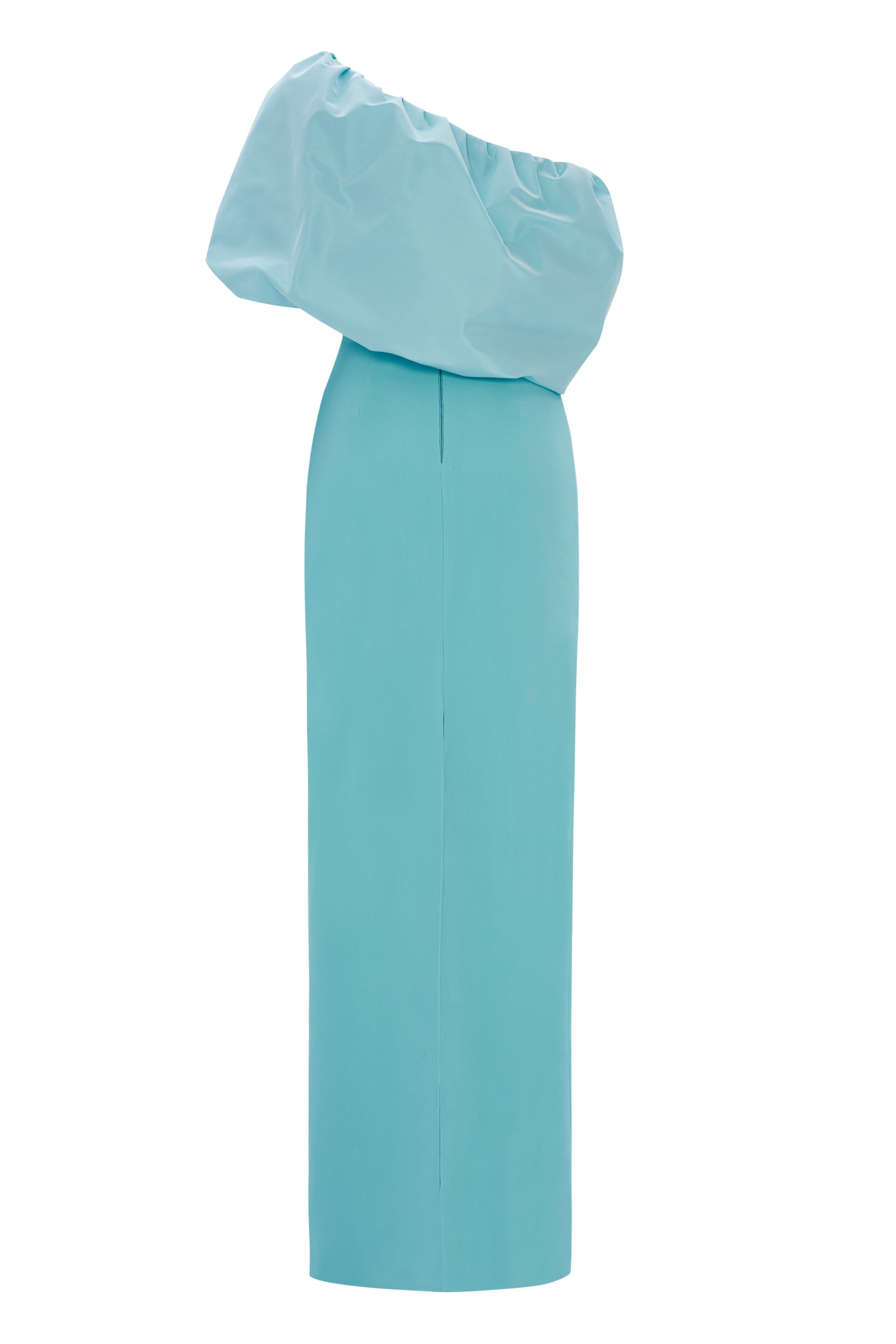 Make a statement with our elegant Ranee Turquoise Asymmetrical Ruffle Gown. This stunning gown features a unique one-shoulder design with a dramatic ruffle detail crafted from luxurious taffeta, cascading gracefully from the shoulder to the waist. The body of the gown is made from premium crepe fabric, designed to fit beautifully and highlight your silhouette. The floor-length skirt adds an element of sophistication, making it perfect for special occasions, evening events, or a red carpet appearance.